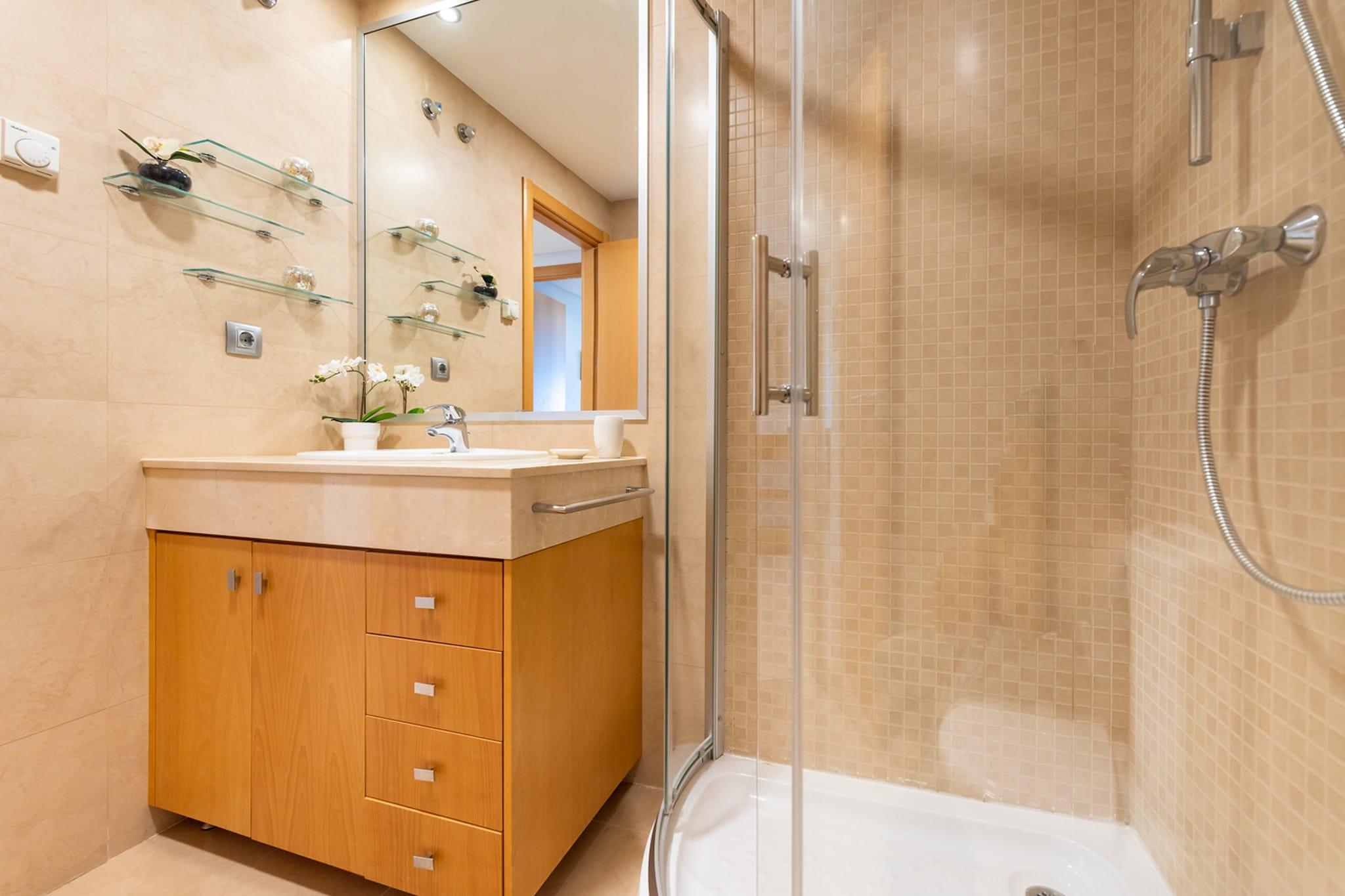 I 2. etasje: (Kjøkken(vannkran med kokende vann, brødrister, komfyr, espressomaskin, stekovn, mikrobølgeovn, oppvaskmaskin, kjøleskap med fryser, Juicemaskin), Stue/spisestue(TV, spisebord, sittehjørne, balkong eller terrasse, klimaanlegg), soveværelse(enkeltseng, enkeltseng, klimaanlegg), Sovrum med badrum(dobbeltseng, TV, badekar eller dusj, håndvask, toalett, klimaanlegg), bad(dusj, håndvask, toalett)) parkering, svømmebasseng(deles med andre gjester), tennisbane(deles med andre gjester)