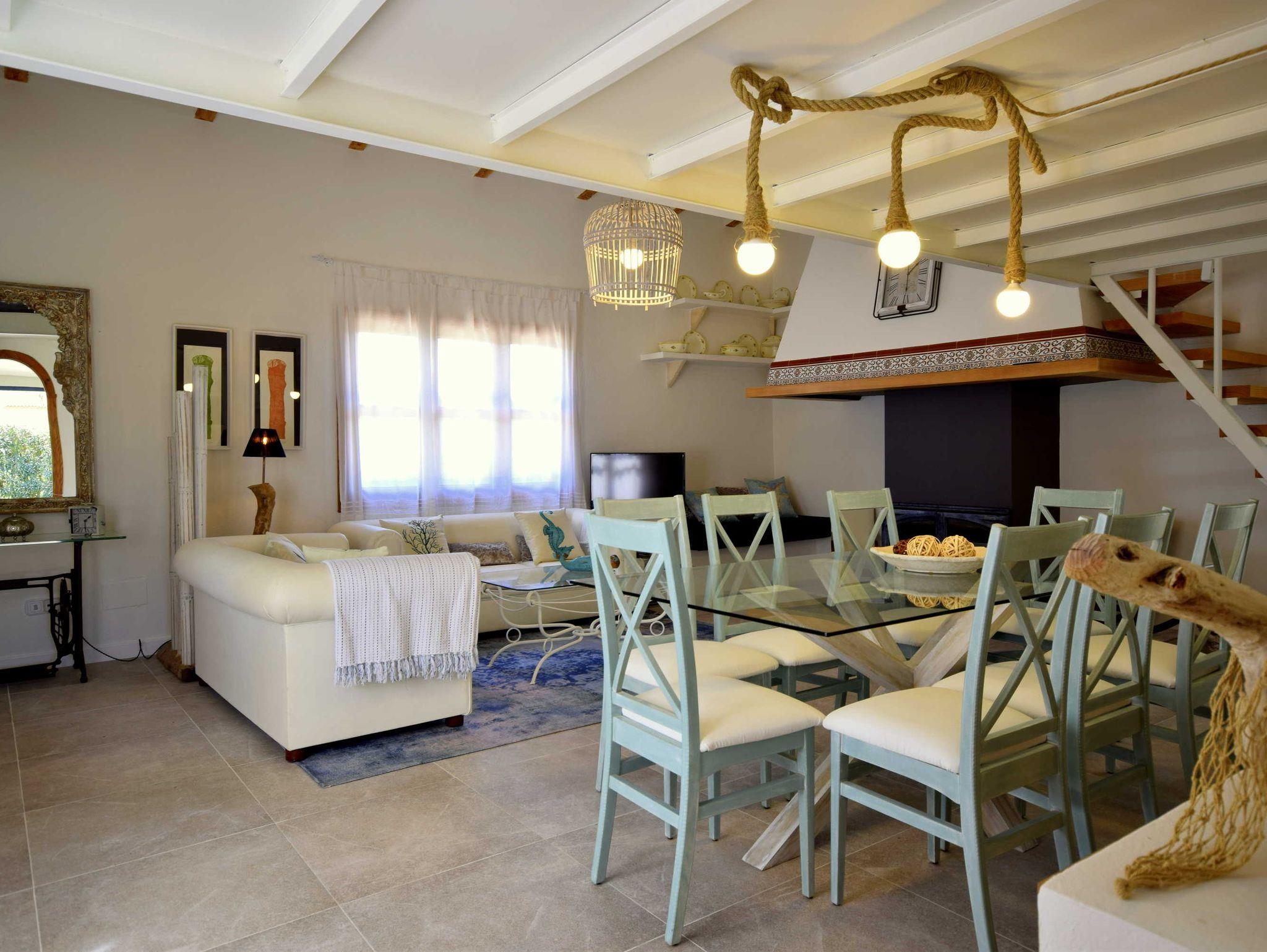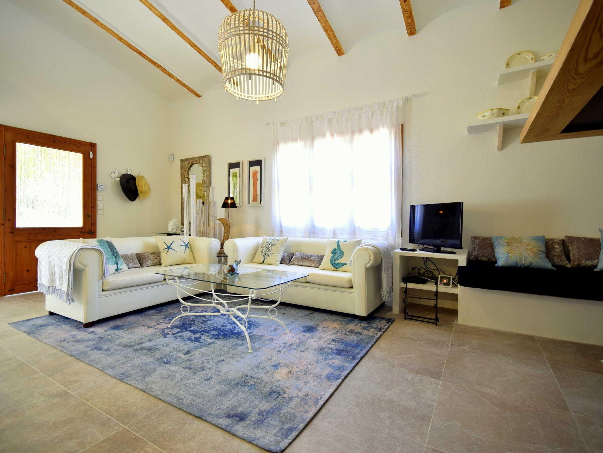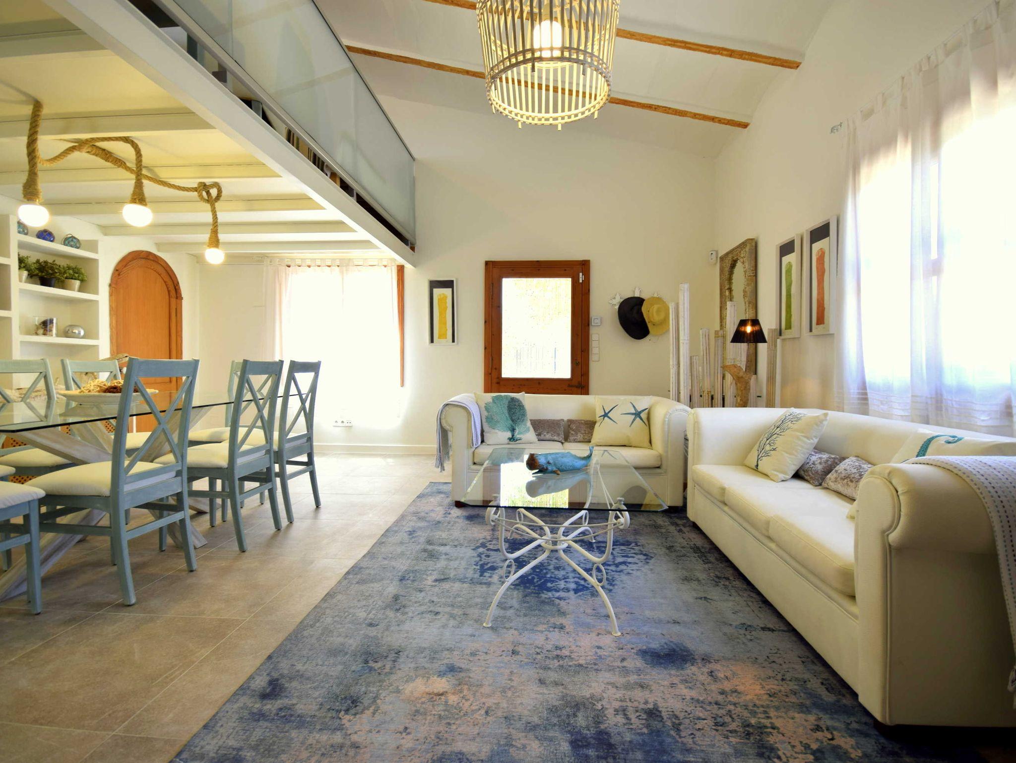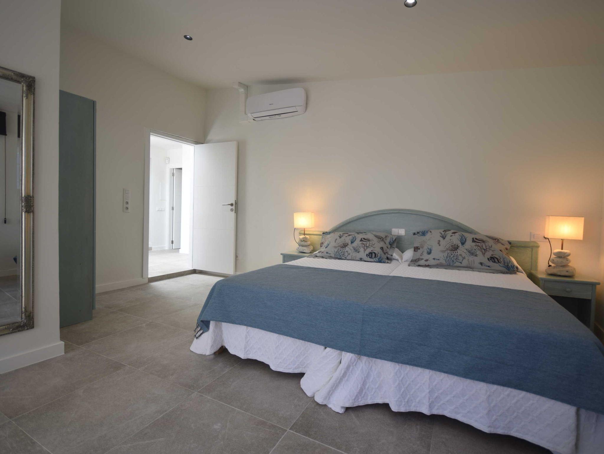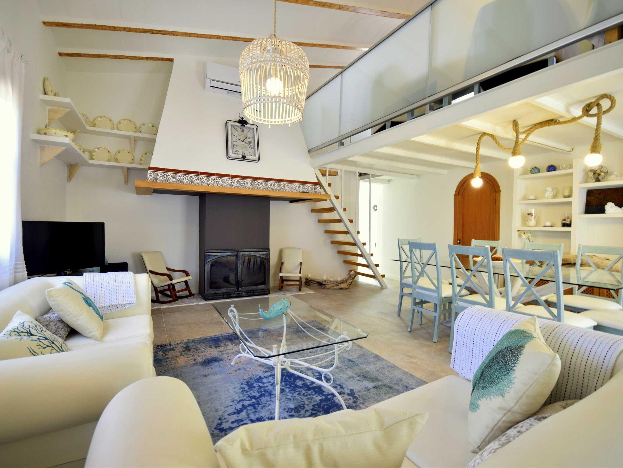 Im Inneren besticht die Villa durch ihre moderne, maritime Einrichtung. Auf der Hauptebene befinden sich ein Schlafzimmer im Zwischengeschoss und ein gemütliches Wohnzimmer mit einem großen Glastisch und beigen Sofas, das sich perfekt zum Entspannen nach einem Tag voller Entdeckungen eignet. Die Küche ist voll ausgestattet mit allen notwendigen Geräten für Ihren Aufenthalt.
