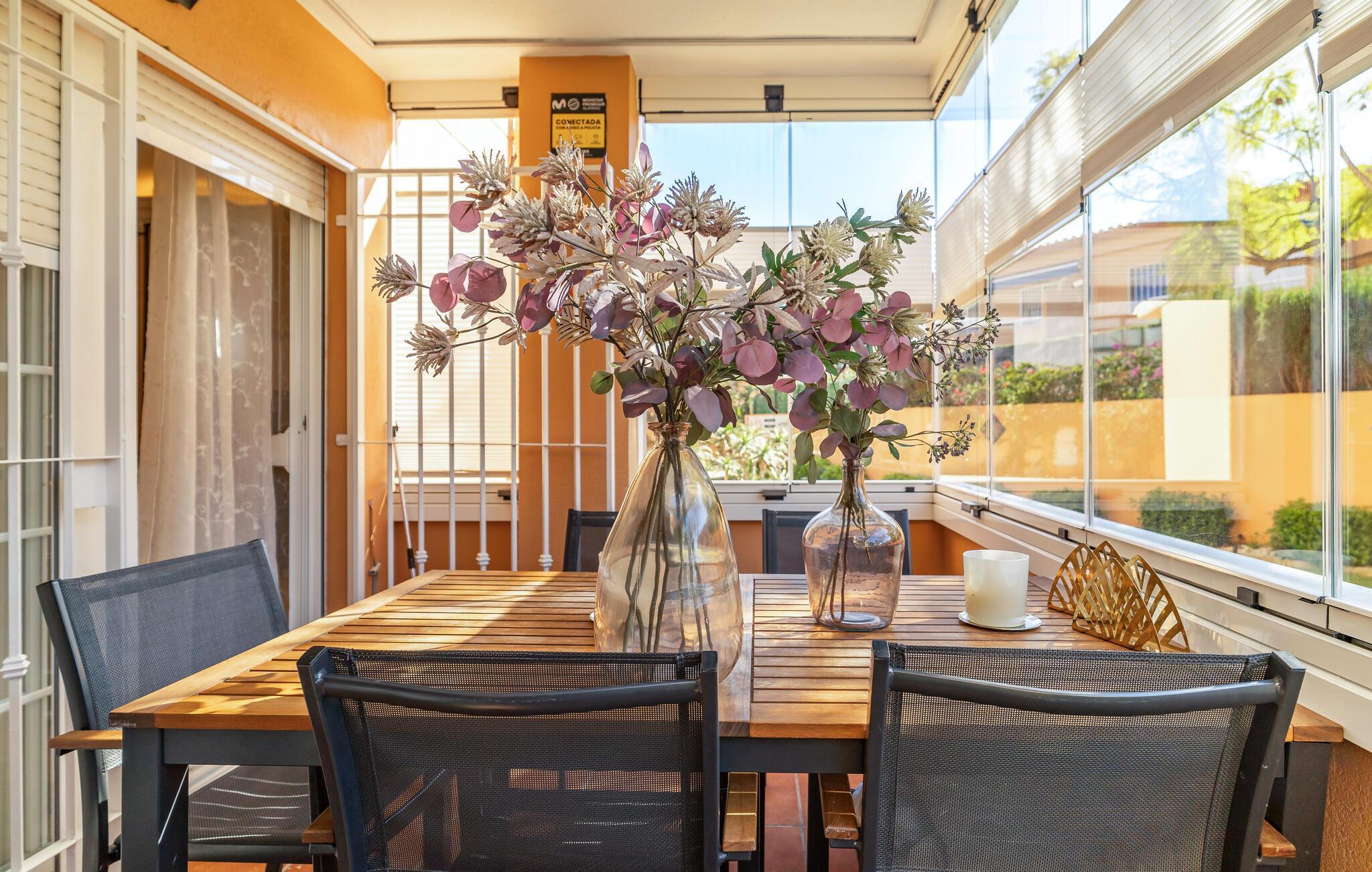 Tilbring rolige timer i vinterhagen med glassfront, som er ideell for felles måltider eller en god bok. Slå deg ned ved det store trebordet og nyt de grønne omgivelsene i en skjermet atmosfære. Svøm noen lengder i det romslige fellesbassenget, eller slapp av i skyggen av palmetrærne på den velstelte plenen.
