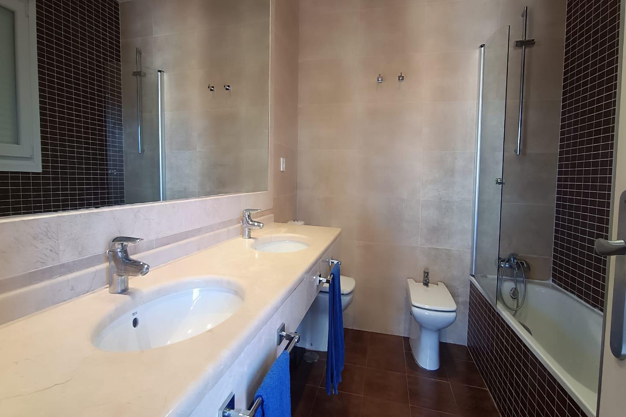 Første etasje: (Stue(TV, spisebord, sittehjørne), Kjøkken(vannkoker, brødrister, komfyr, kaffetrakter, stekovn, mikrobølgeovn, oppvaskmaskin, kjøleskap med fryser, Blender), soveværelse(Dobbeltseng eller 2 enkeltsenger), soveværelse(Dobbeltseng eller 2 enkeltsenger), soveværelse(Dobbeltseng eller 2 enkeltsenger), soveværelse(Dobbeltseng eller 2 enkeltsenger), soveværelse(dobbeltseng), bad(badekar eller dusj, håndvask, toalett), bad(badekar eller dusj, håndvask, toalett), bad(badekar, håndvask, toalett), oppholdsrom) balkong eller terrasse, balkong eller terrasse, klimaanlegg, hage(privat), hagemøbler(8 personer), parkering, svømmebasseng(privat)