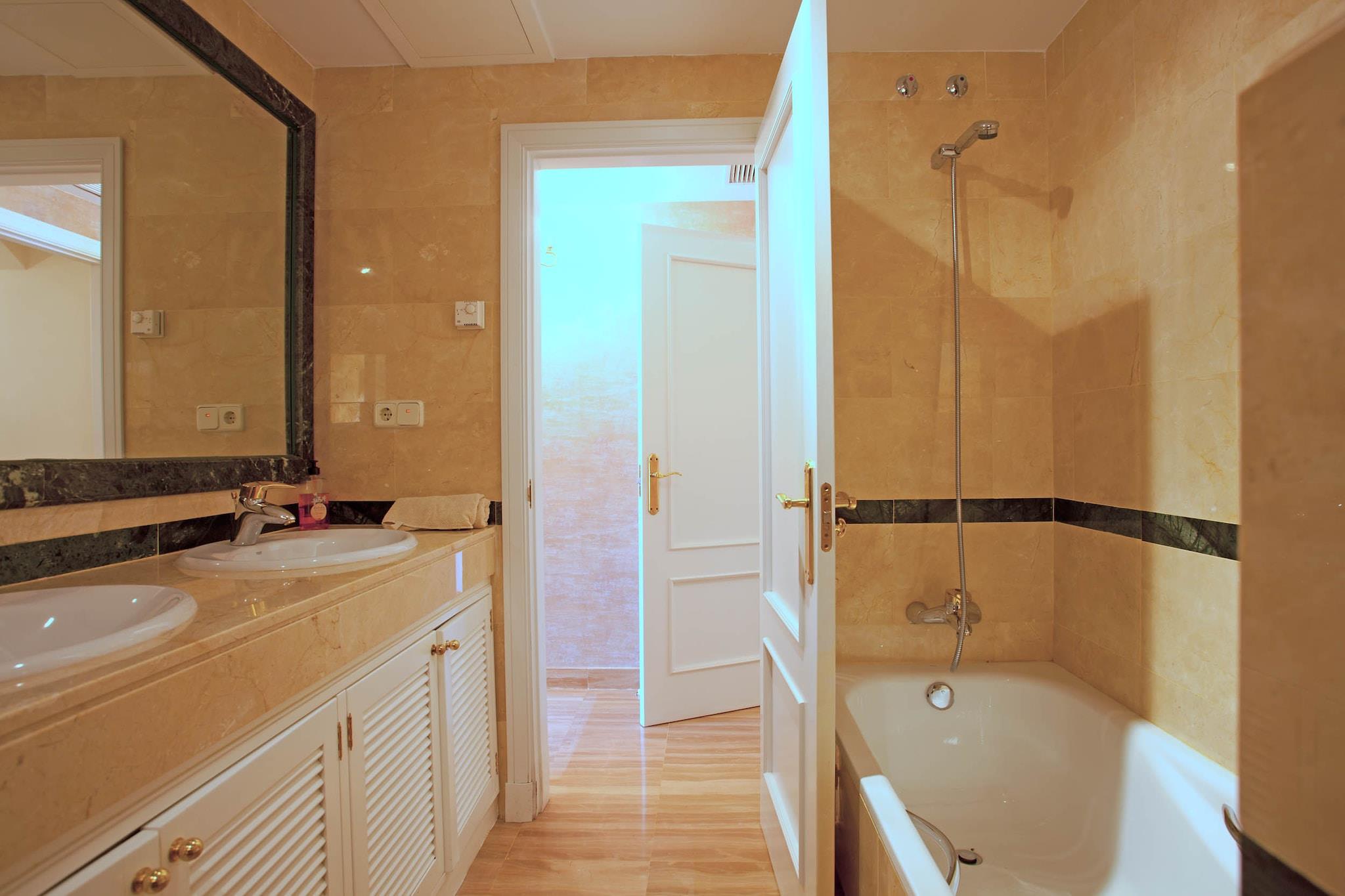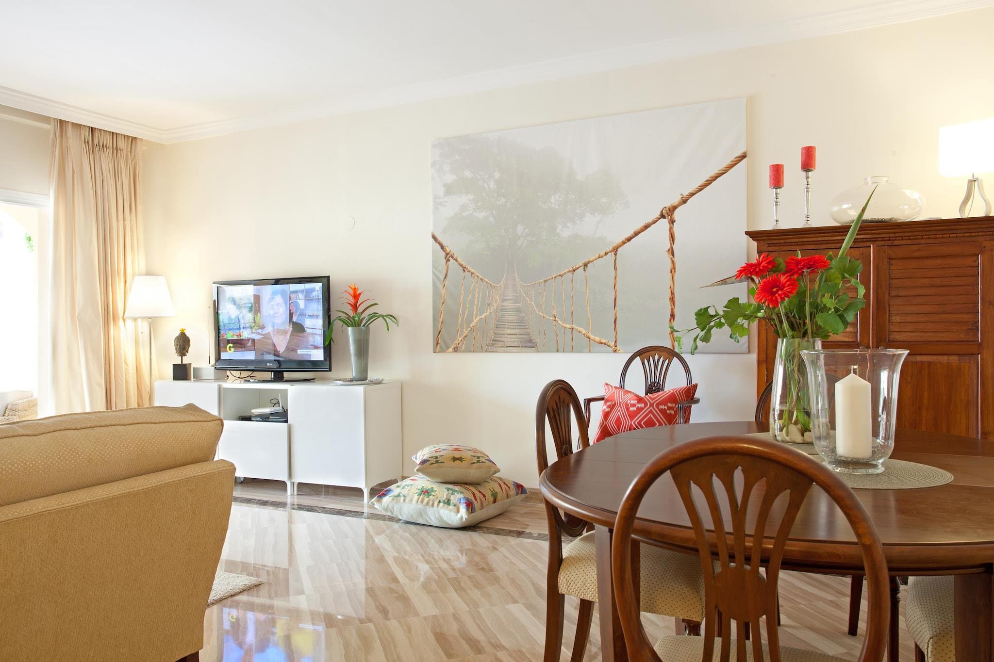 Denne sjarmerende 2-roms leiligheten i Marbella tilbyr en romslig 110 m² med smakfullt innredet boareal og har plass til opptil 4 gjester. Perfekt beliggenhet i en familievennlig sone, kun 1 km fra sandstranden og innen gangavstand fra lokale fasiliteter, inkludert en golfbane (300 m), restauranter (400 m), en busstasjon (500 m), og et supermarked (500 m). Marbellas pulserende sentrum ligger kun 4 km unna, mens flyplassen er en praktisk 45 km kjøring unna. Leiligheten har en privat terrasse med utemøbler, ideell for å nyte middelhavsklimaet, og et felles svømmebasseng for avslappende dager i solen. Eiendommen tilbyr også en hage og grill for utendørs servering og sosialt samvær. Innvendig er leiligheten fullt utstyrt med moderne bekvemmeligheter, inkludert klimaanlegg og Wi-Fi. Stuen inkluderer en TV for underholdning, og kjøkkenet er uavhengig og velutstyrt med alt nødvendig utstyr, som en keramisk kokeplate, kjøleskap, mikrobølgeovn, stekeovn, fryser, oppvaskmaskin, kaffemaskin og brødrister. Leiligheten er perfekt for de som ønsker å nyte et rolig tilfluktssted med lett tilgang til Marbellas strender, golfbaner, shoppingområder og spisesteder.