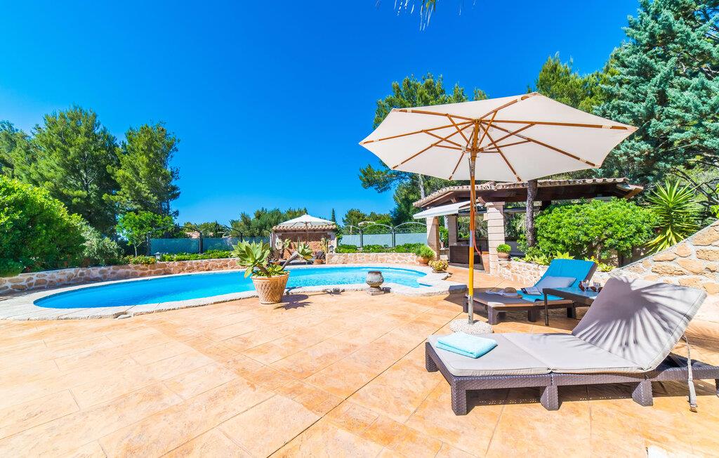 Så snart du ankommer, vil du bli fortryllet av Villa Marimonts sjarm og eleganse. Villaen i middelhavsstil ligger pittoresk til på en liten høyde, med Tramuntana-fjellene i det fjerne, det intense glitrende blå havet i forgrunnen og Serra de Llevant-massivet midt i naturreservatet i bakgrunnen av eiendommen. Du vil umiddelbart forelske deg i den pittoreske, meget velholdte hagen og dens elegant utformede kriker og kroker. Det er små overraskelser overalt: en hengekøye i skyggen her, et bord dekorert med mosaikk eller en mursteinsbenk der. I tillegg til det frodige grønne fra trærne og plantene dominerer lyse nyanser av lyseblått og hvitt og den beroligende beigefargen fra natursteinen. Bassenget rett ved siden av huset gir fullstendig privatliv, og solsenger av høy kvalitet inviterer deg til å slappe av. Et bassenghus med salong tilbyr et fristed fra sommersolen og kan også brukes i regnvær eller på kjøligere dager takket være et uttrekkbart beskyttelsesdeksel. De stilfulle loungemøblene på den skyggefulle, overbygde utendørsterrassen innbyr til herlige grillkvelder. Den virkelige sjarmen ved denne eiendommen ligger i det allsidige uteområdet, som er stemningsfullt opplyst om kvelden. I sommermånedene kan du oppholde deg ute til langt på natt, for eksempel i den overbygde spisestuen eller i den opplyste salongen i bassenghuset. Gjestene setter også pris på den skyggefulle plassen under pergolaen med hengekøye.
