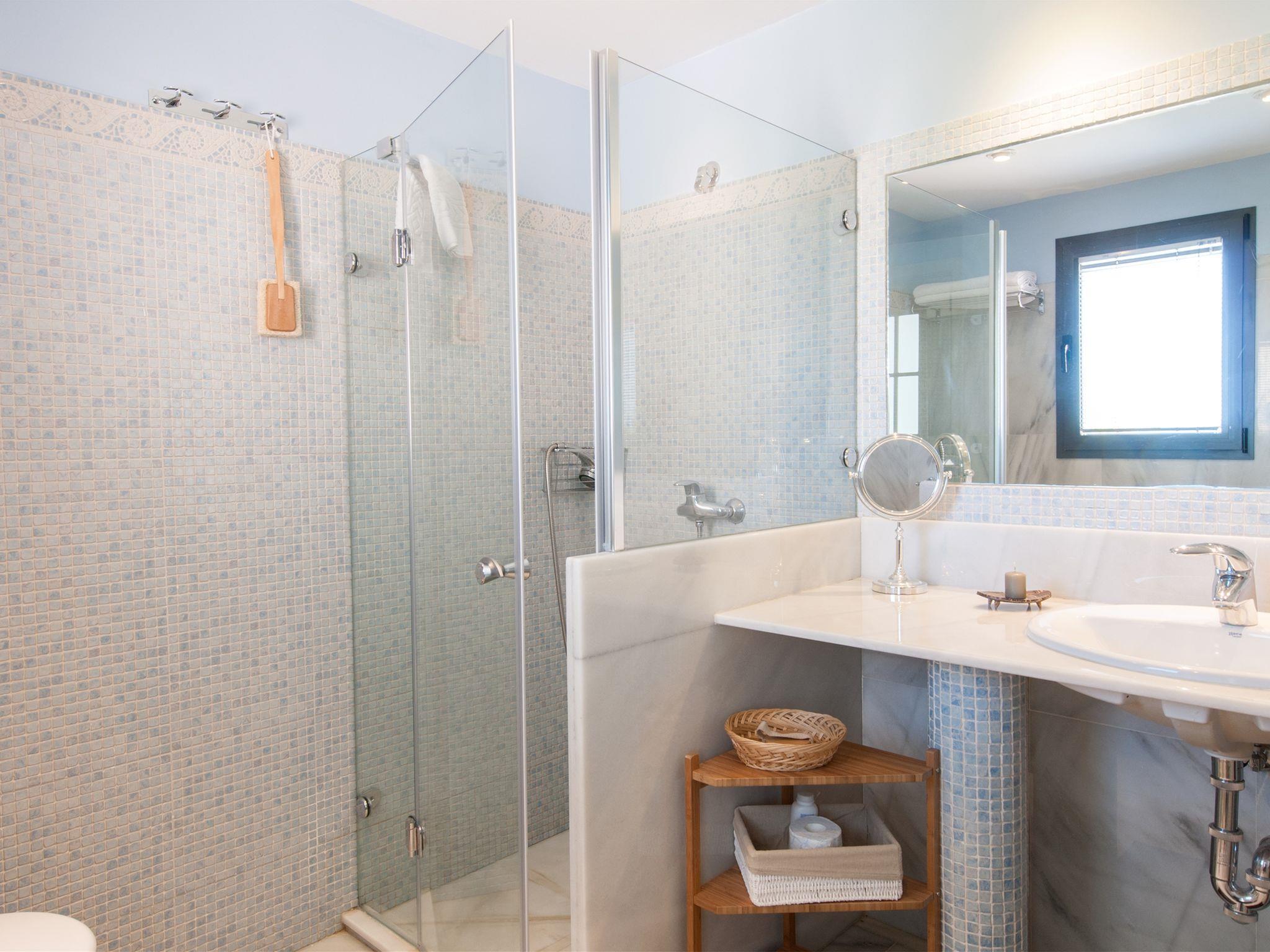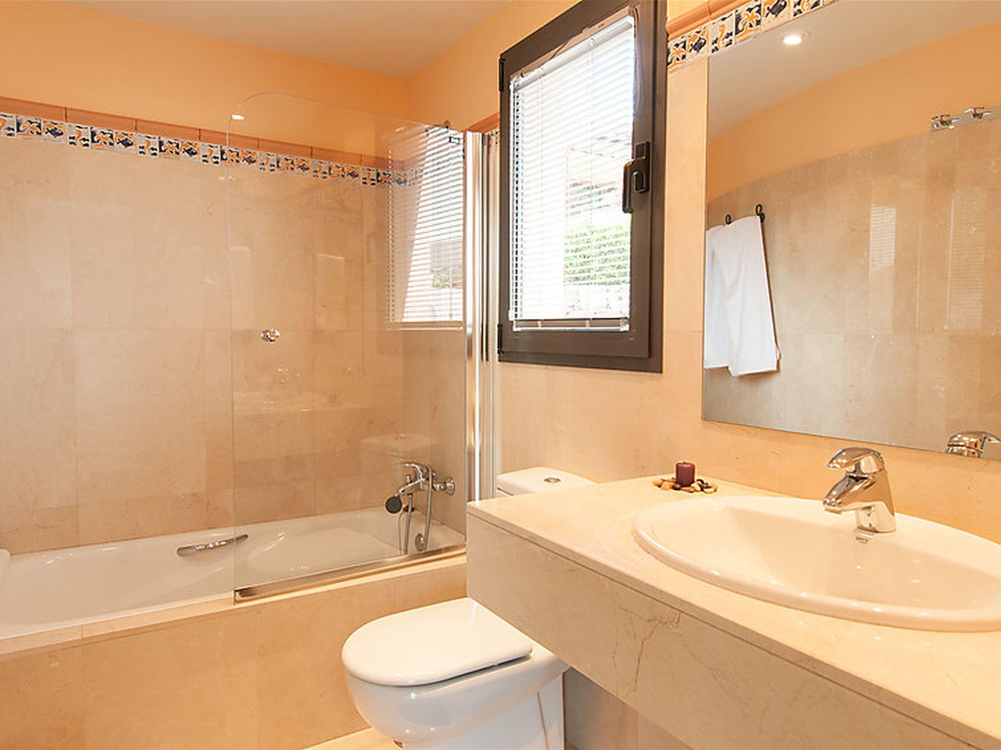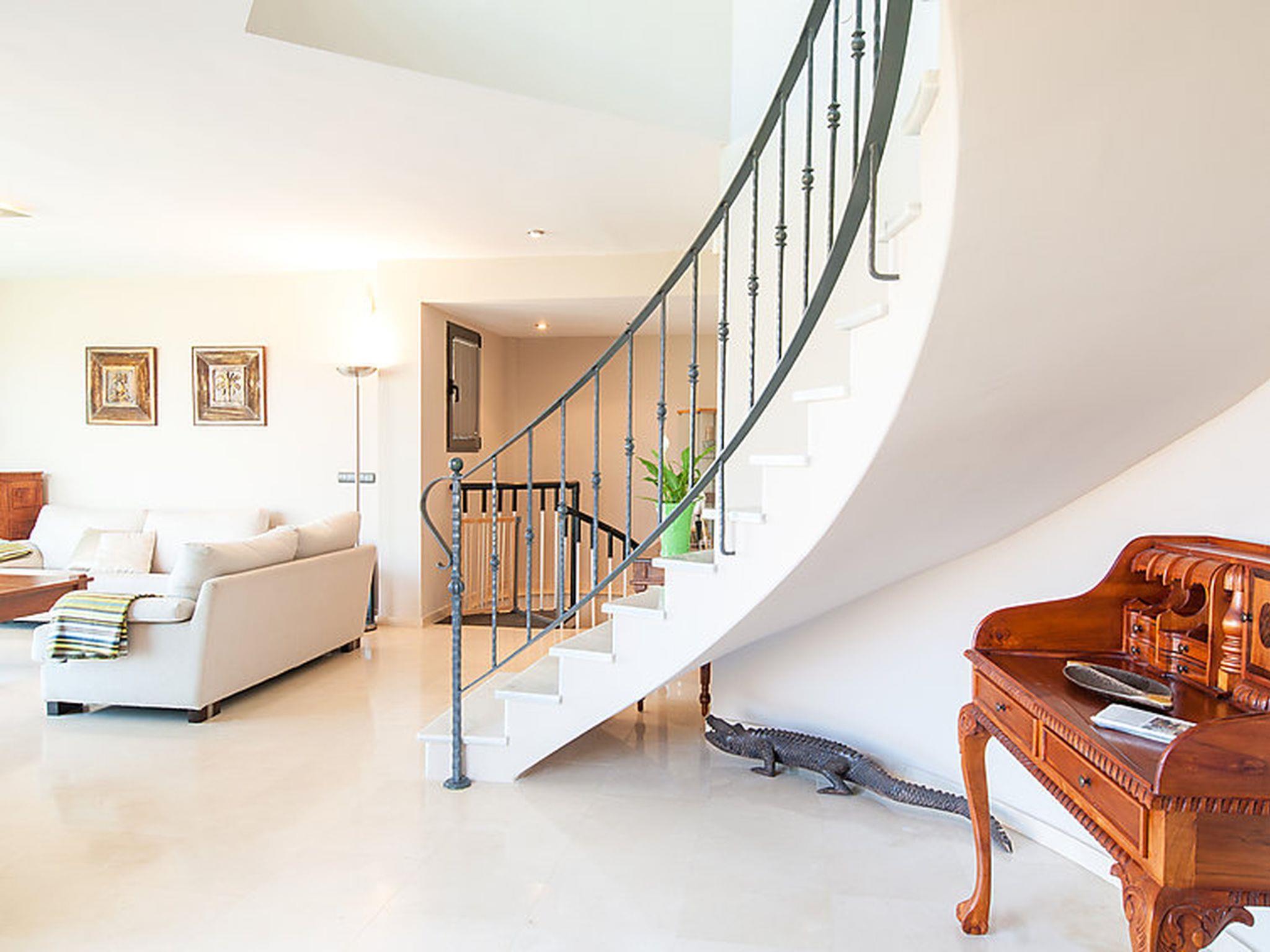 5-room house 280 m2. Modern and cosy furnishings: living room with satellite TV, digital TV and hi-fi system. Exit to the patio. Open kitchen (oven, dishwasher, 4 ceramic glass hob hotplates, toaster, kettle, microwave, freezer, electric coffee machine) with dining nook. On the lower ground floor: dining room with dining table. 1 room with 1 french bed and air conditioning. Upper floor: 1 room with 1 french bed, shower/WC and air conditioning. 1 room with 2 beds, bath/WC and air conditioning. Patio 310 m2. Terrace furniture, barbecue, deck chairs. View of the sea, the garden, the countryside and golf course. Facilities: washing machine, safe, iron, children's high chair, baby cot for up to 2 year olds, hair dryer. Internet (WiFi, free). Parking (fenced), garage (1 car). Please note: non-smoking house. Maximum 1 pet/ dog allowed. 2020-T7230 // Reg. Nr.: ESFCTU0000350120003160250000000000000VV-35-1-00151041