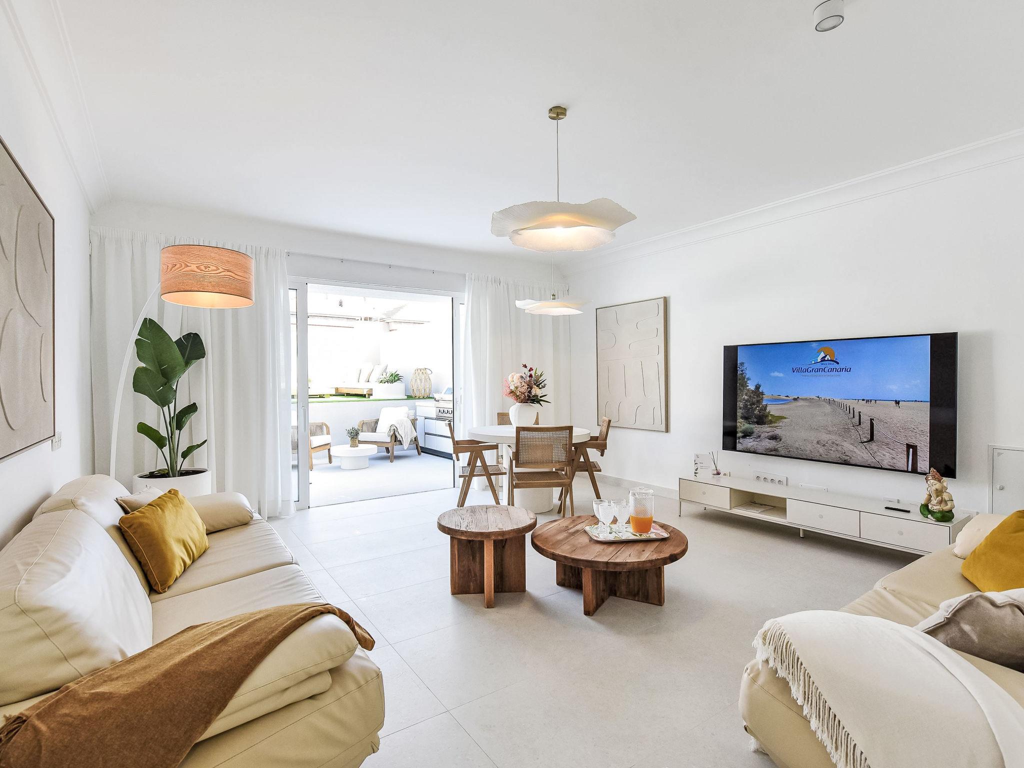 "Meloneras Hills 16", 5-room villa 280 m2 on 3 levels. Object suitable for 8 adults. Comfortable and cosy furnishings: living room with TV, flat screen and air conditioning. Exit to the patio. 3 rooms, each room with 2 beds (90 cm, length 90 cm), air conditioning. 1 room with 1 double bed (150 cm, length 200 cm), air conditioning. Open kitchen (oven, dishwasher, 4 ceramic glass hob hotplates, toaster, kettle, microwave, freezer, electric coffee machine). 3 bathrooms, bath/WC. Natural stone floors. Porch. Terrace furniture, deck chairs (4), covered balcony. Facilities: washing machine, dryer, iron, children's high chair, baby cot for up to 2 year olds, hair dryer. Internet (WiFi, free). Garage. Please note: suitable for families. Non-smoking house. 1 small pet/ dog allowed. 2025-T0844 // Reg. Nr.: ESFCTU0000350120001770840000000000000VV-35-1-00141264