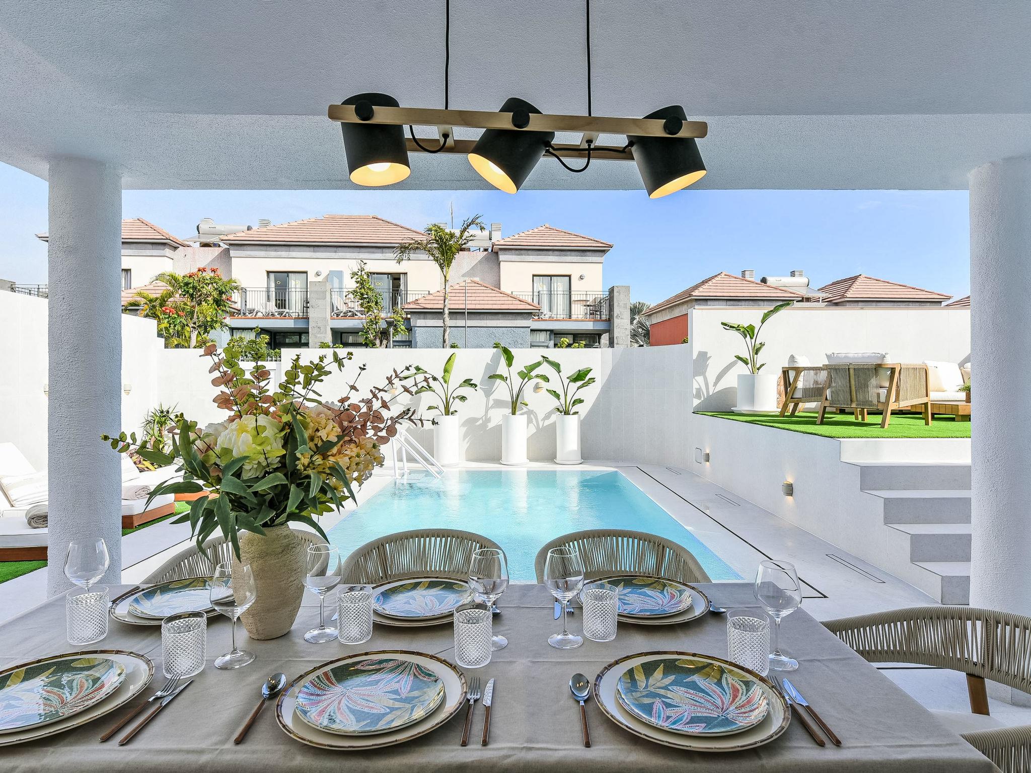 Very cosy, comfortable villa "Meloneras Hills 16". In the centre of Meloneras, in the resort de Gran Canaria, excellent location: right in the centre but still quiet. Private: swimming pool angular (7 x 3 m, depth 1 - depth 50 cm, seasonal availability: 01.Jan. - 31.Dec.). Outdoor shower, patio. In the house: internet access, WiFi, air conditioning, washing machine, tumble dryer. Roofed, parking. Bus stop "Faro de Maspalomas" 1.1 km. Object suitable for 8 adults. The owner does not accept any youth groups. Neighbourhood highly sensitive to noise. Quietness and good behaviour expected.