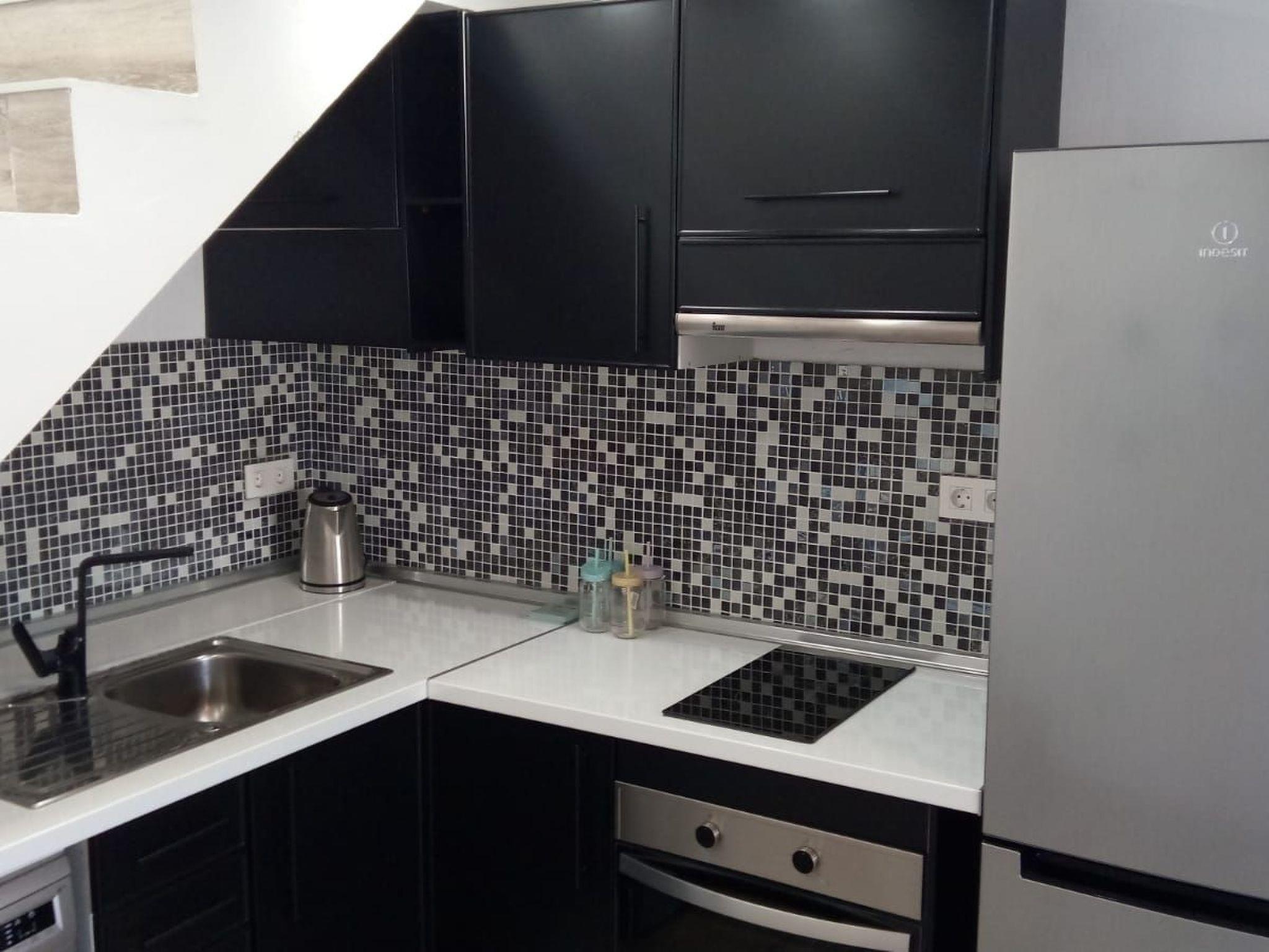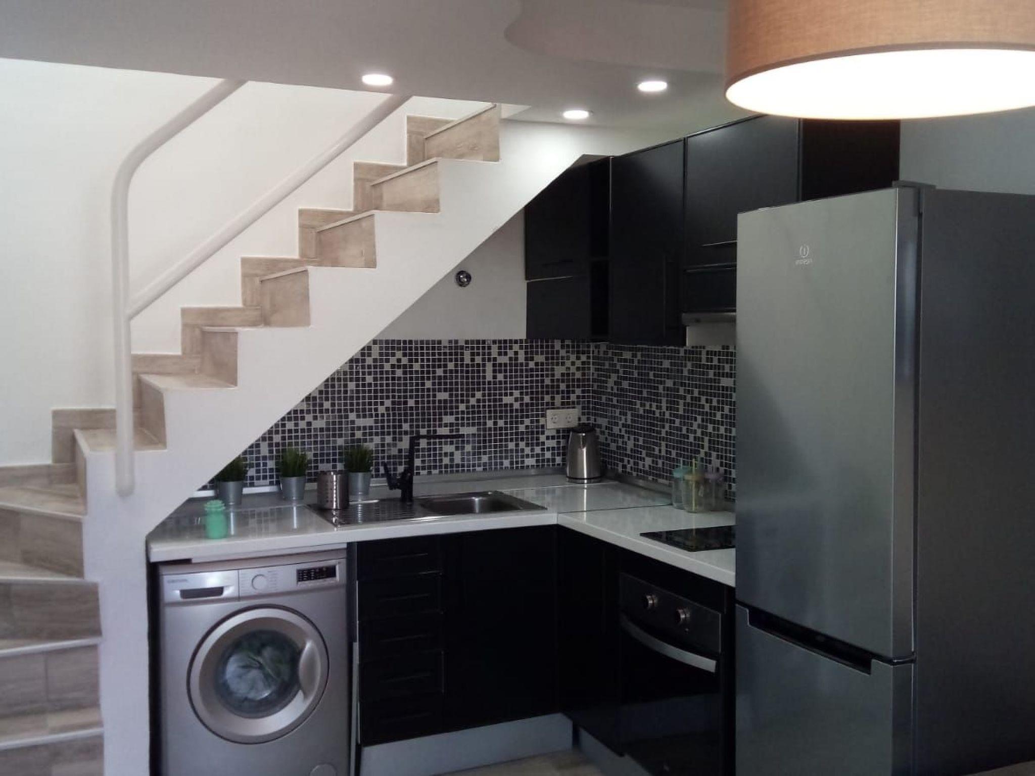 The kitchen is well equipped for 4 people with fridge with freezer, microwave, toaster, kettle, washing machine, electric cookers, plates, glasses, cups, cutlery, pots and pans.
