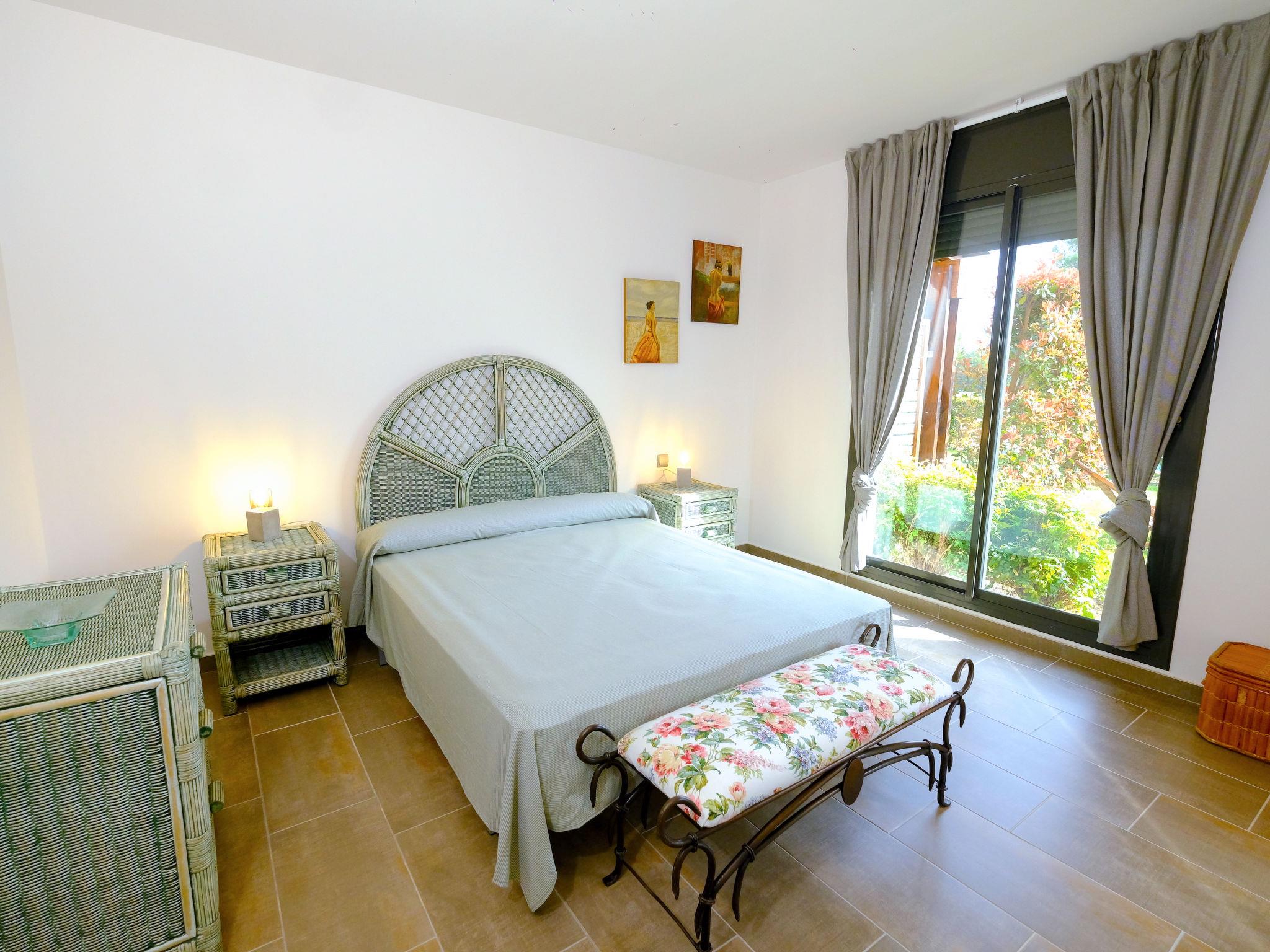 3-room apartment 131 m2, on the ground floor. Practical and comfortable furnishings: living/dining room 25 m2 with sliding door curtain with dining table, satellite TV, air conditioning and forced-air heating. Exit to the patio. 1 room with sliding door with 1 french bed (150 cm, length 190 cm). Exit to the garden. 1 room with 1 pull-out bed (2 pers. 2 x 90 cm, length 190 cm). Exit to the garden. Open kitchen (oven, 3 ceramic glass hob hotplates, toaster, kettle, microwave, electric coffee machine) with bar. Bath/bidet/WC, shower/bidet/WC. Patio. Terrace furniture. Beautiful view of the swimming pool, the garden and golf course. Facilities: washing machine, iron, children's high chair, baby cot for up to 2 year olds, hair dryer. Internet (WiFi, free). Parking (1 car) at the house. Please note: no lift. HUTT061956 // Reg. Nr.: ESFCTU00004303200016910900000000000000HUTT-061956-499