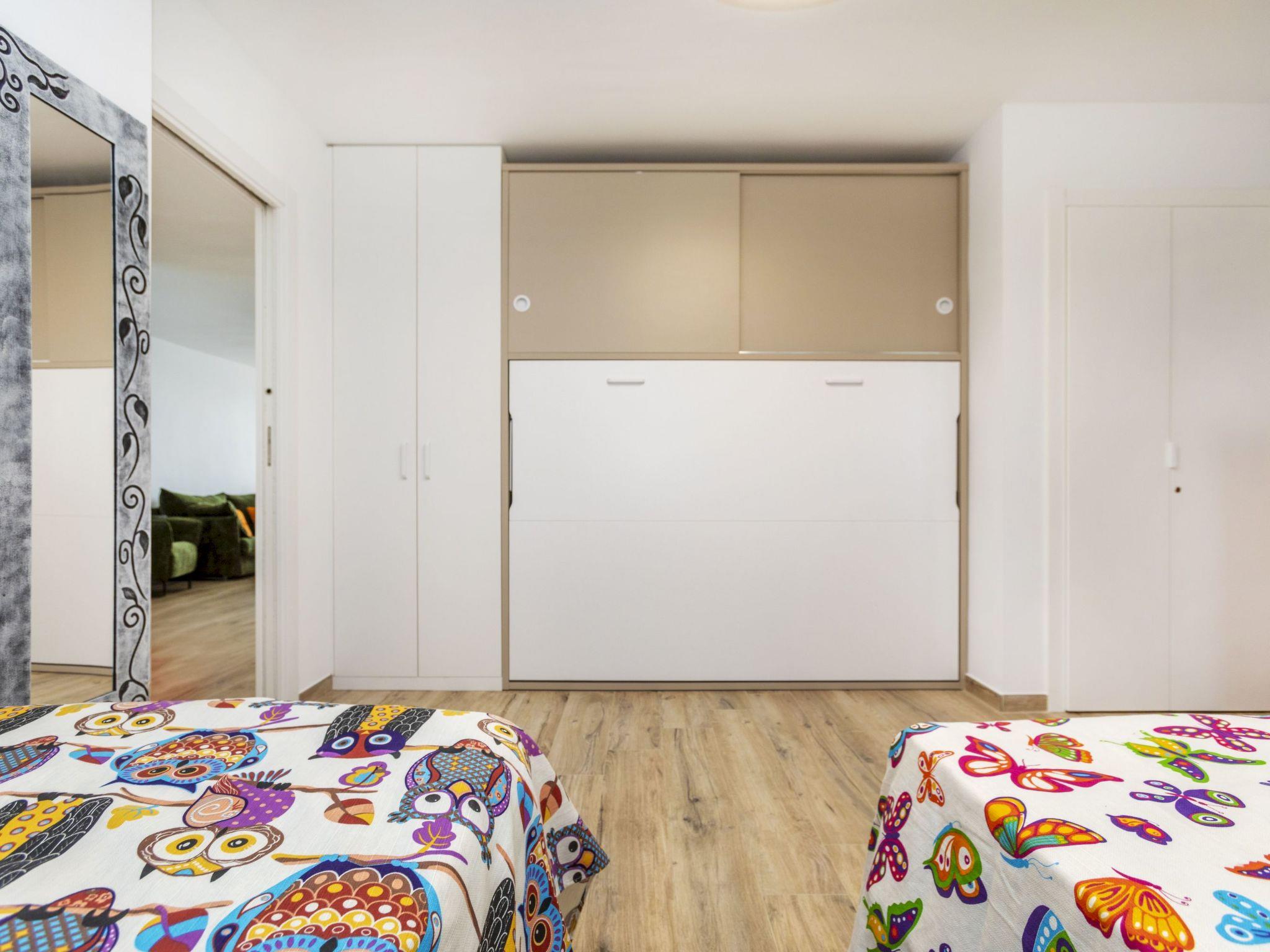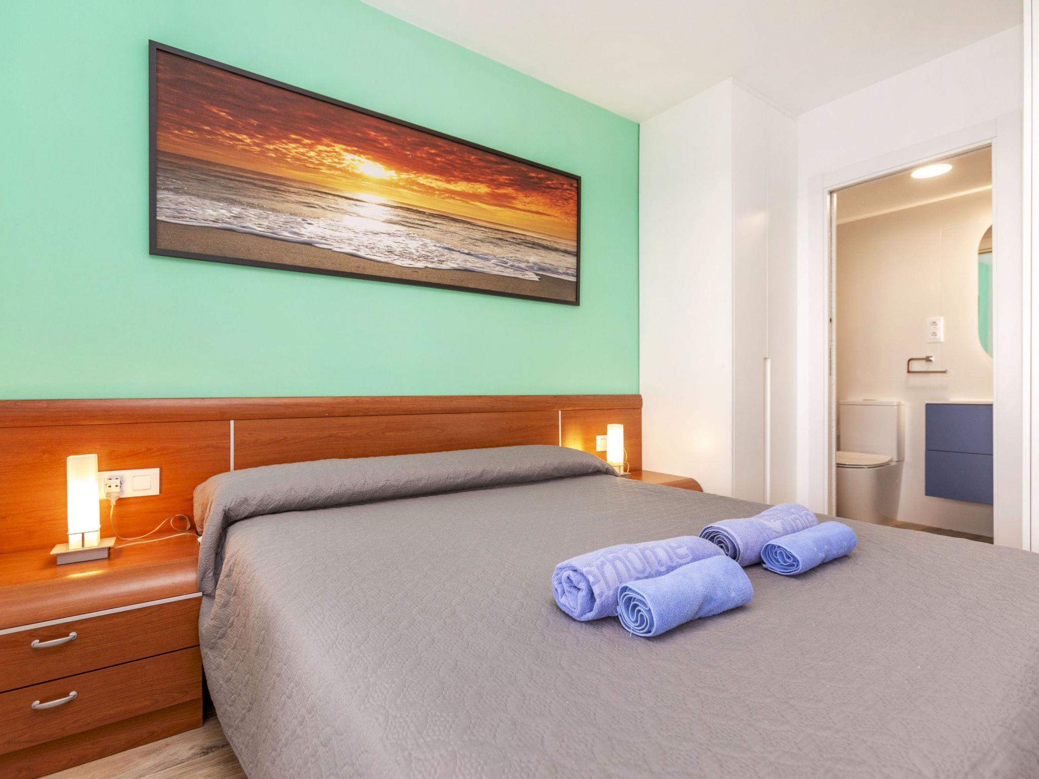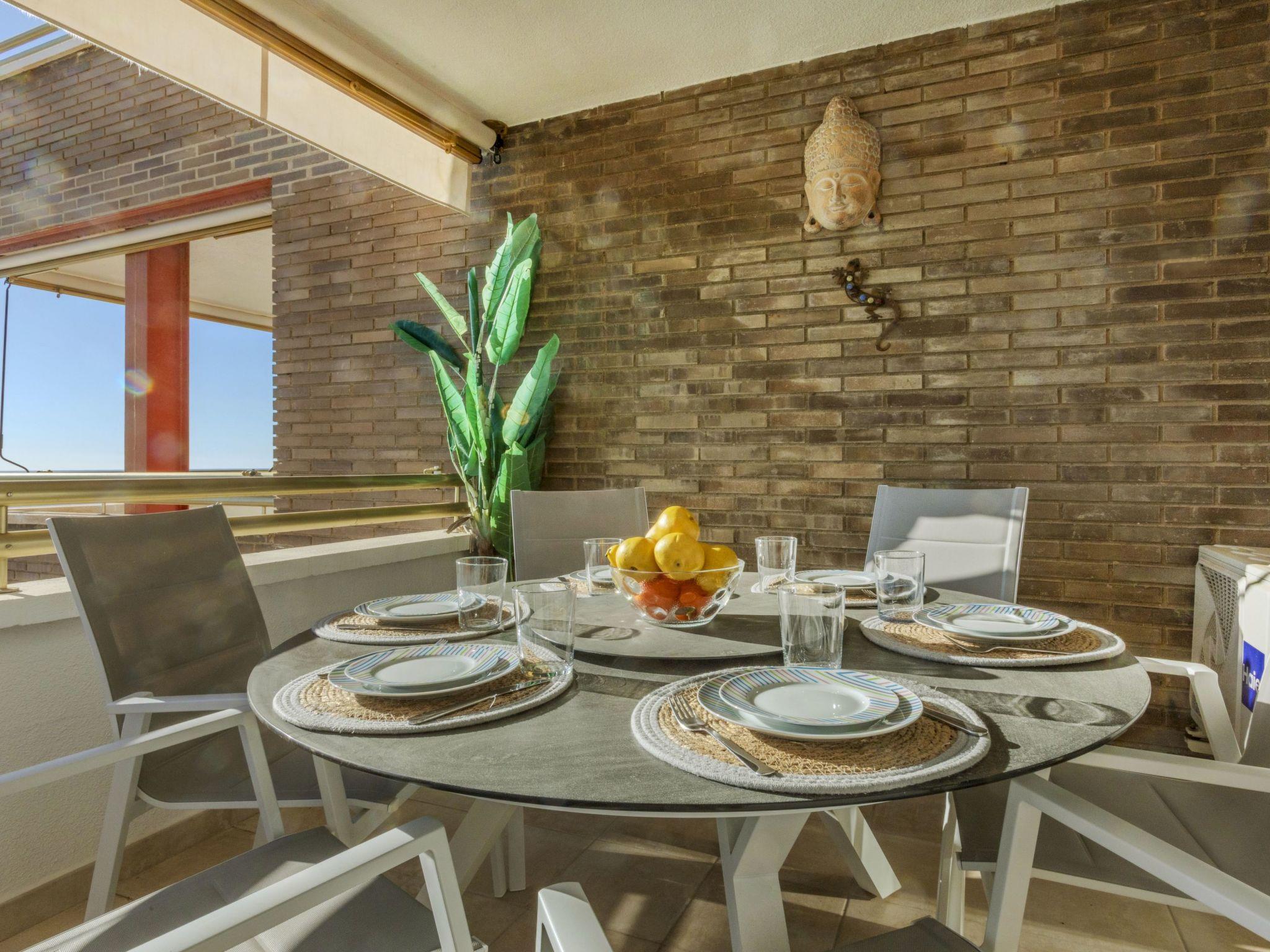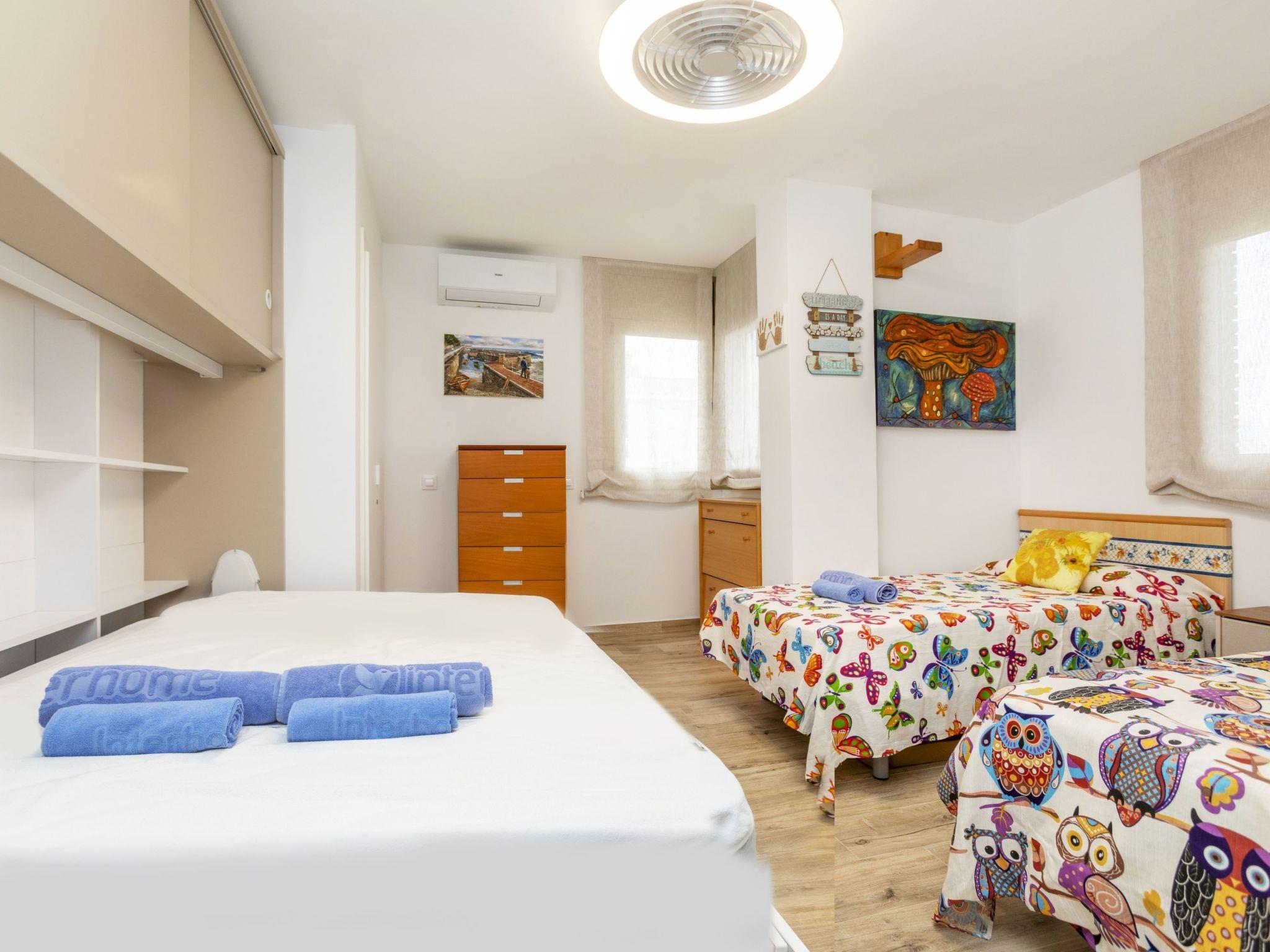 "Los Delfines", 3-room apartment 70 m2 on 9th floor. Practical and comfortable furnishings: living/dining room with digital TV and air conditioning. Exit to the terrace. 1 room with 1 french bed (150 cm, length 190 cm), shower/WC, digital TV, air conditioning and fan. 1 room with 2 beds (90 cm, length 190 cm), 1 wall-trunk bed (140 cm, length 190 cm). Kitchen (oven, dishwasher, 3 ceramic glass hob hotplates, toaster, kettle, electric coffee machine). Shower/WC. Air-conditioning, forced-air heating. Terrace. Terrace furniture. Facilities: washing machine, dryer, iron, hair dryer. Internet (WiFi, free). Parking space n s/n no asignada (fenced) at the house. Please note: non-smokers only. HUTT-010989 // Reg. Nr.: ESFCTU00004303200003602900000000000000HUTT-010989-789