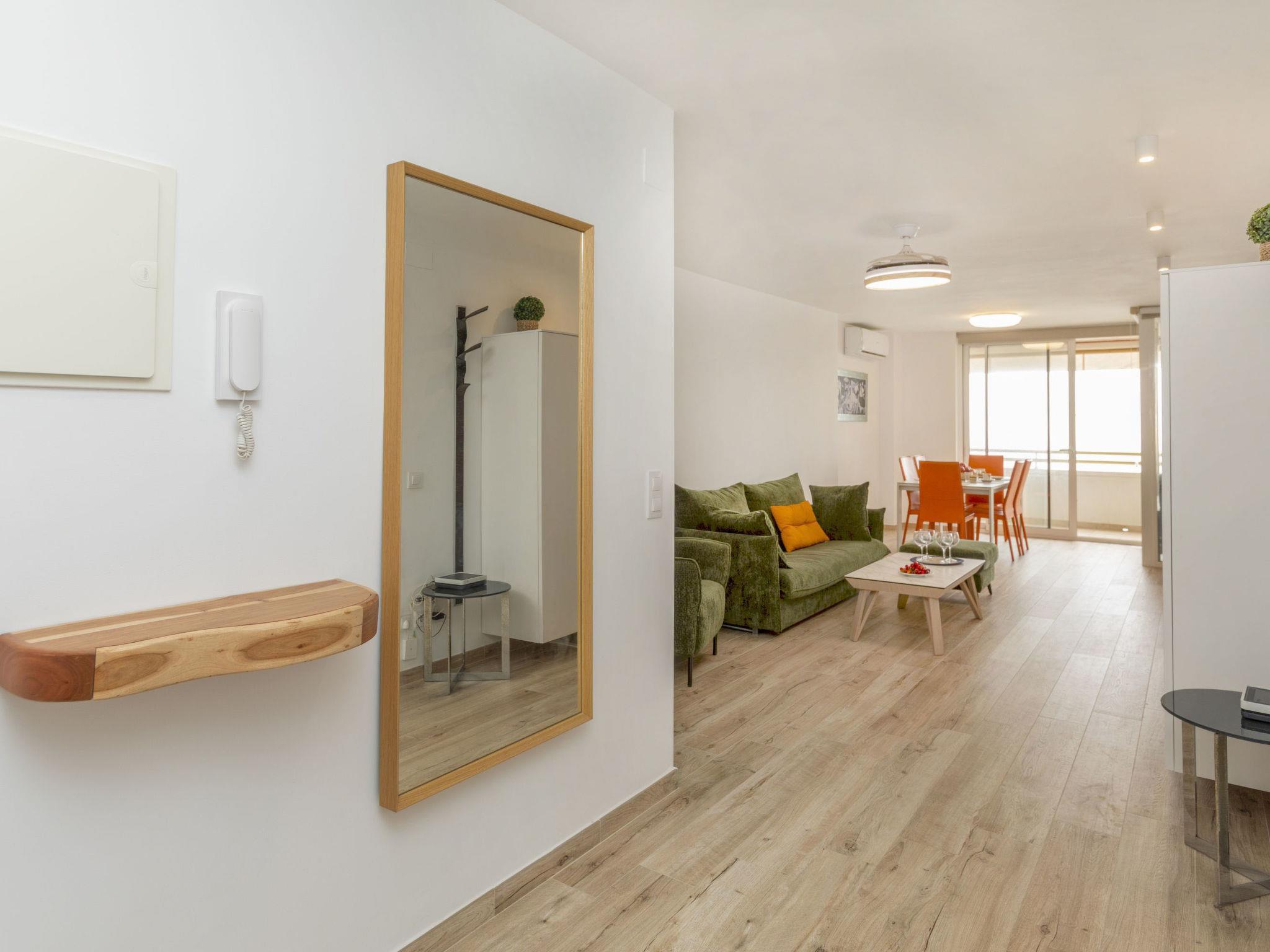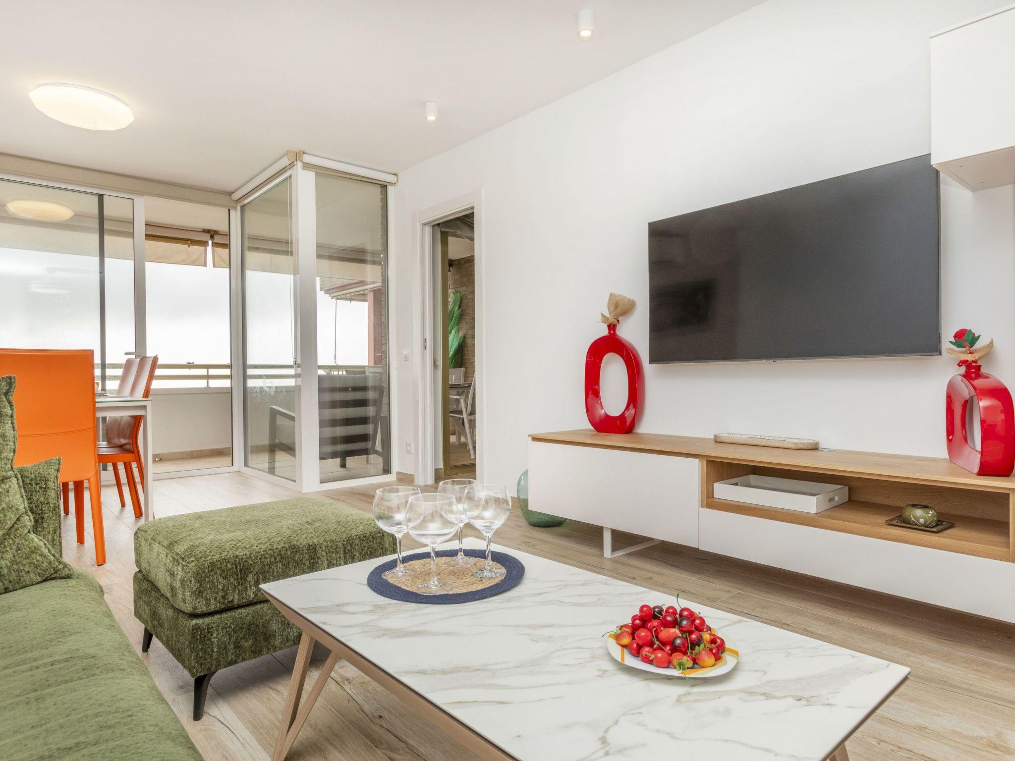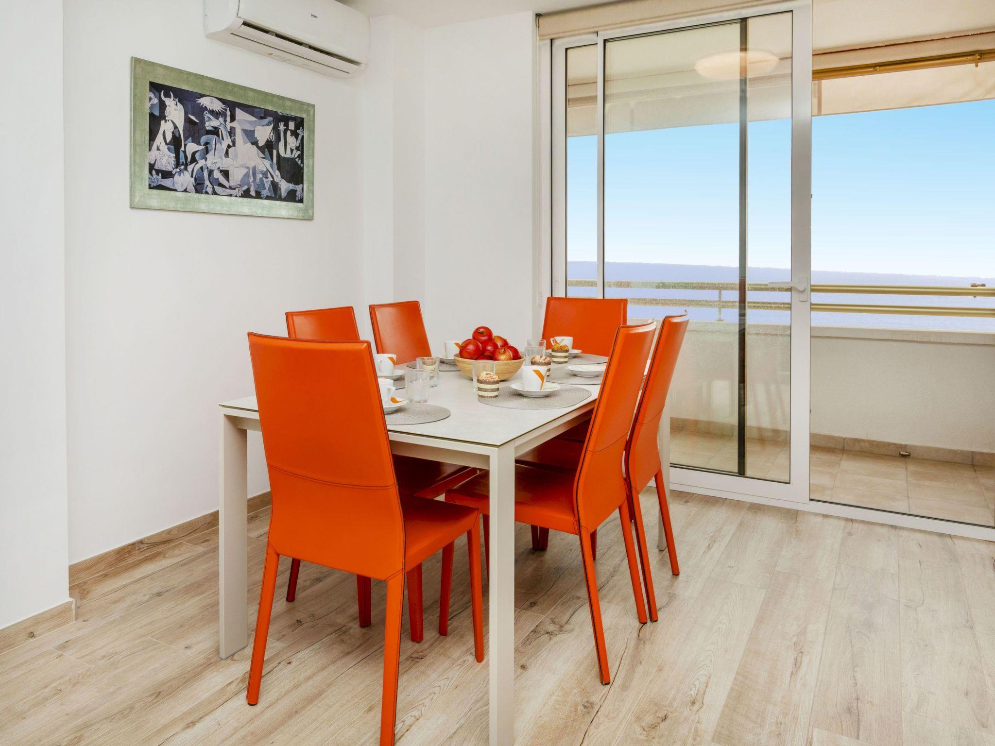 "Los Delfines", 3-room apartment 70 m2 on 9th floor. Practical and comfortable furnishings: living/dining room with digital TV and air conditioning. Exit to the terrace. 1 room with 1 french bed (150 cm, length 190 cm), shower/WC, digital TV, air conditioning and fan. 1 room with 2 beds (90 cm, length 190 cm), 1 wall-trunk bed (140 cm, length 190 cm). Kitchen (oven, dishwasher, 3 ceramic glass hob hotplates, toaster, kettle, electric coffee machine). Shower/WC. Air-conditioning, forced-air heating. Terrace. Terrace furniture. Facilities: washing machine, dryer, iron, hair dryer. Internet (WiFi, free). Parking space n s/n no asignada (fenced) at the house. Please note: non-smokers only. HUTT-010989 // Reg. Nr.: ESFCTU00004303200003602900000000000000HUTT-010989-789