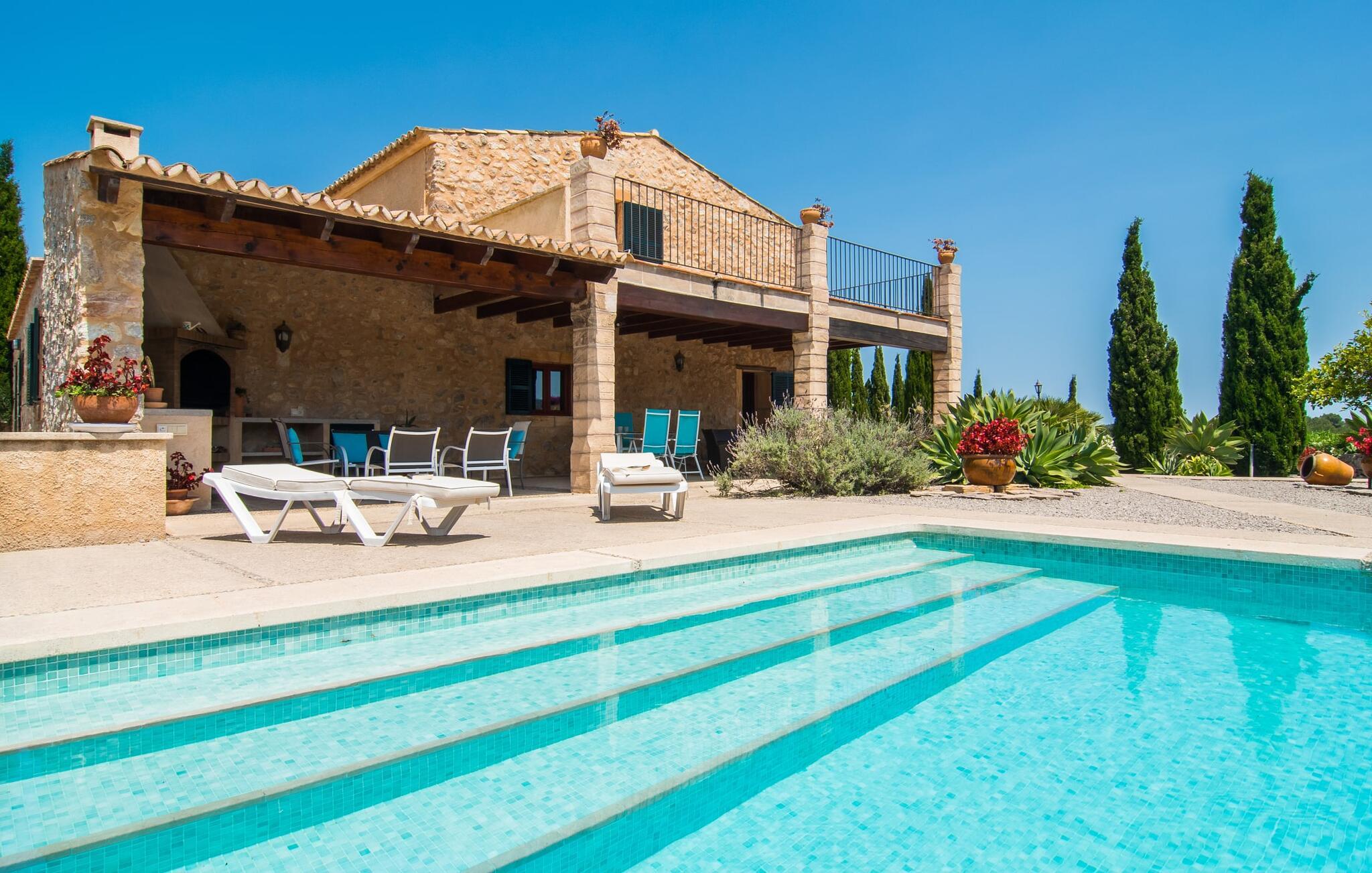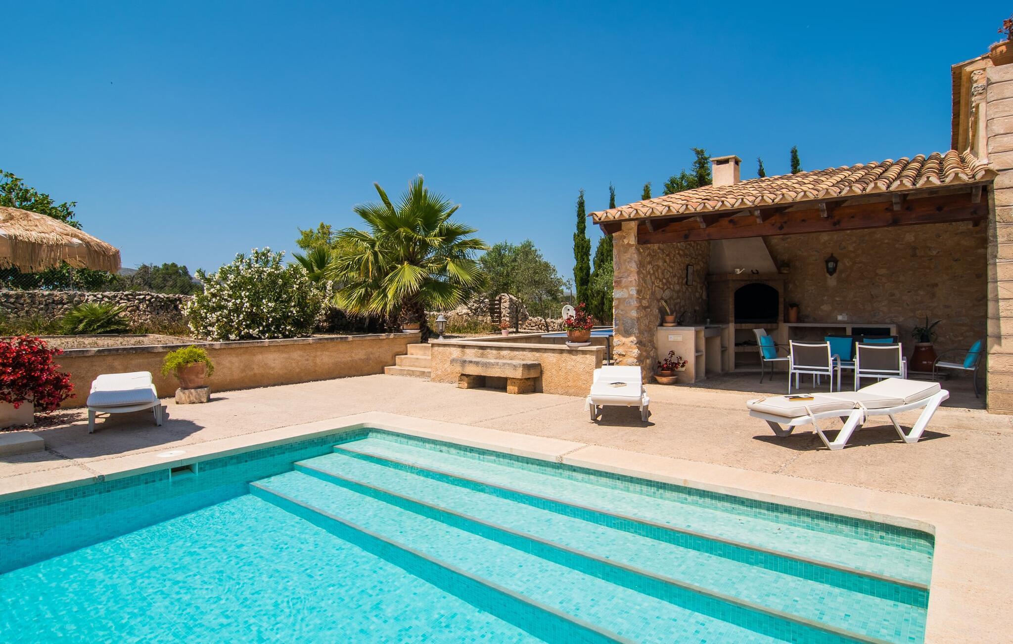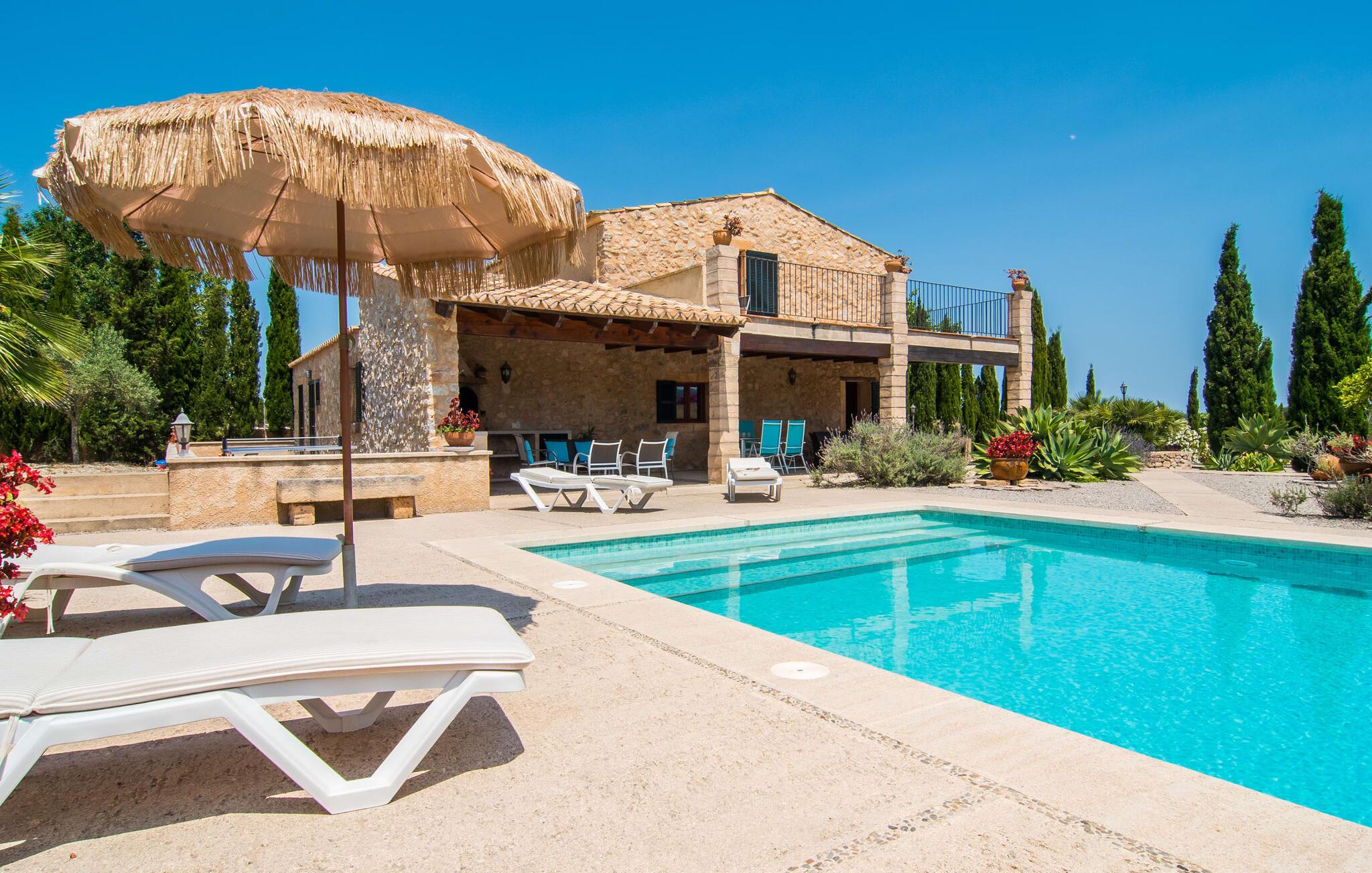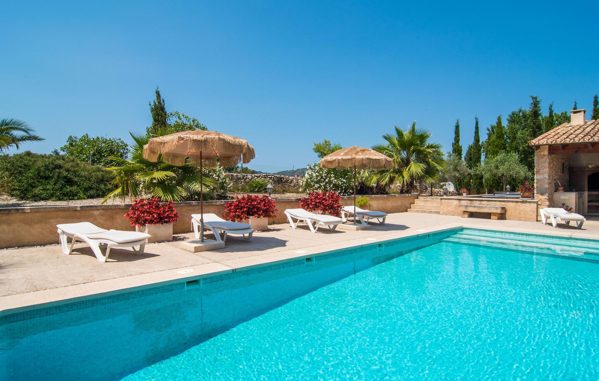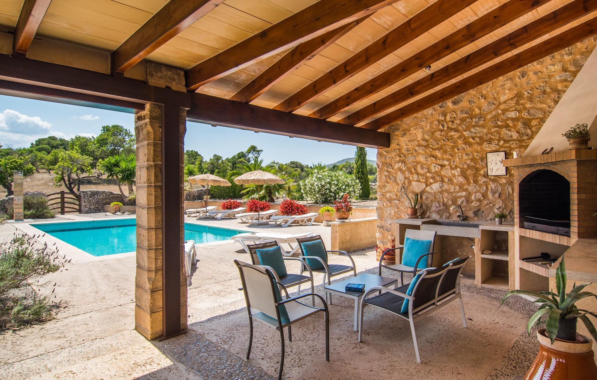 Den sjarmerende Villa Nonga ligger mellom Artà (4 km) og San Llorenc (10 km) på en 42 000 kvadratmeter stor, kjærlig anlagt tomt. Siden det ikke er noen direkte naboer, kan du føle deg helt privat under oppholdet. Så hvis du er ute etter avslappende fred og ro, har du kommet til rett sted. Velholdte gruslagte og terrasserte områder, dekorativt og løst strukturert av små stier, vakker beplantning, trapper og små murer, preger den smakfulle utendørsatmosfæren og inviterer deg til å oppholde deg i det fri. I alt 10 svært attraktive uteserveringer er tilgjengelige for dette formålet. I tillegg finnes det seks komfortable solsenger som er plassert rett ved bassenget og innbyr til avslapping. Det store svømmebassenget er lett tilgjengelig via en romersk trapp, er grunt og varierer i dybde mellom 0,80 m og 2,20 m. På varme dager kan du forfriske deg herlig her. Fra den store overbygde terrassen rett ved siden av huset har du god utsikt over bassengområdet, slik at eventuelle barn som leker i vannet sammen med deg, kan holdes under godt oppsyn. Du kan spise elegant på ulike lenestoler og stoler i den luftige skyggen mens du nyter den fantastiske utsikten over hagelandskapet. En grill er tilgjengelig for hyggelige grillkvelder, slik at du kan trylle frem et kulinarisk måltid på varme kvelder og runde av dagen i en hyggelig atmosfære.