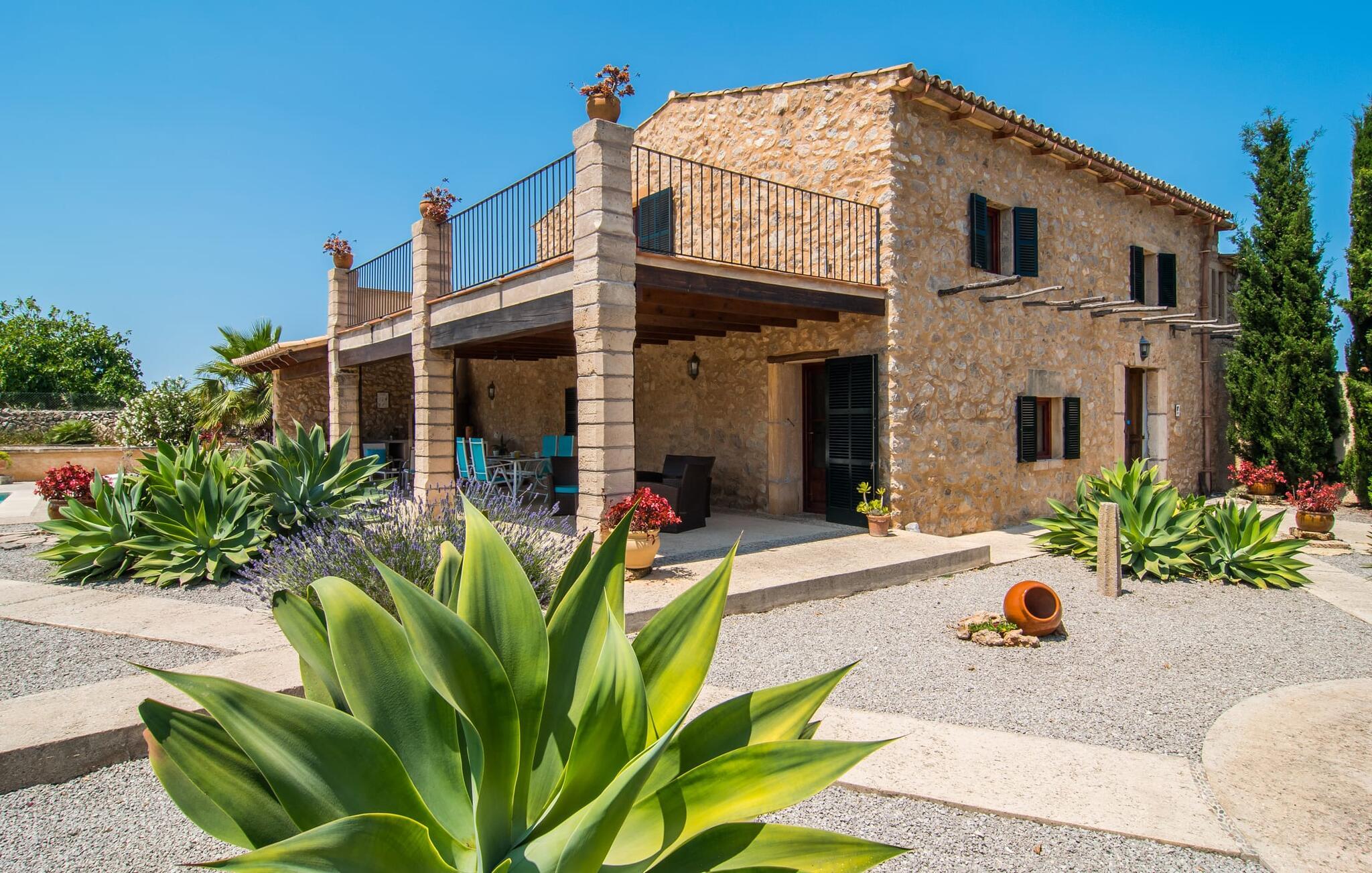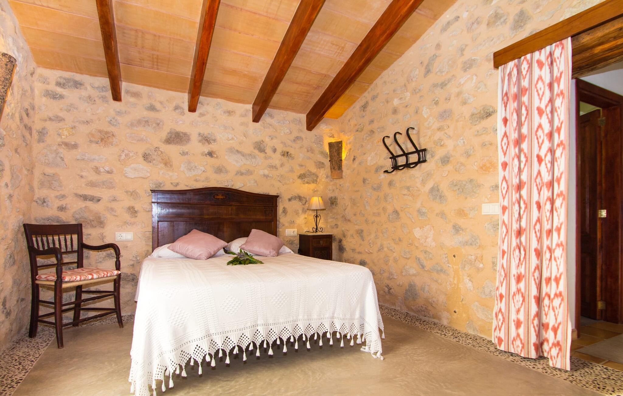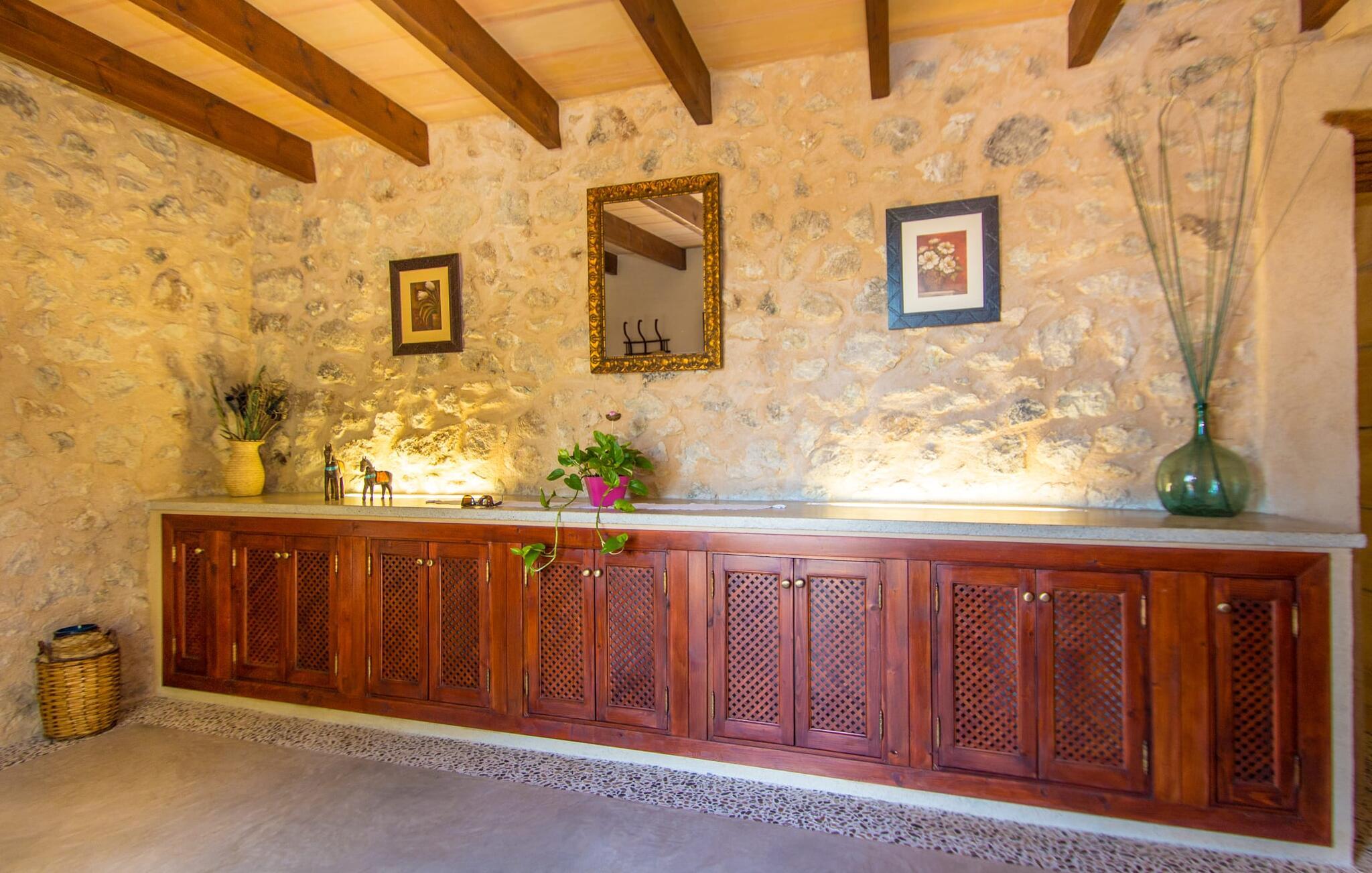 Når du kommer inn i villaen, blir du møtt av en koselig kombinasjon av autentisitet og moderne møbler. Det unike oppholdsrommet med sine rustikke natursteinvegger, synlige takbjelker og perfekt harmoniserende steingulv er et unikt høydepunkt. Her er det lyse, moderne sofaer hvor du kan slappe av når som helst på dagen. Original belysning og dekorasjon avrunder den individuelle stilen på en stemningsfull måte, der du som gjest garantert får lyst til å bli værende. For de som ønsker det, tilbyr dette rommet muligheten til å underholde seg med en god film takket være den store flatskjerm-TV-en med satellittforbindelse som er installert her. Det romslige kjøkkenet, innredet i typisk mallorcinsk stil, tilbyr alt du trenger for dine daglige behov i tillegg til spiseplassen, inkludert kaffemaskin, vannkoker og mange andre funksjoner. Soverommene er designet på en helt spesiell måte og gir det ideelle grunnlaget for en avslappende nattesøvn. En seng på 1,60 x 2,00 meter og to på 0,90 x 1,90 meter står til disposisjon for dette formålet. Her finner alle en soveplass etter egen smak. De to badene er både funksjonelle og dekorative og har rikelig med naturlig lys. Strykejern og hårføner er tilgjengelig i huset, slik at du ikke trenger å kaste bort bagasjeplass ved å ta med ditt eget hjemmefra.