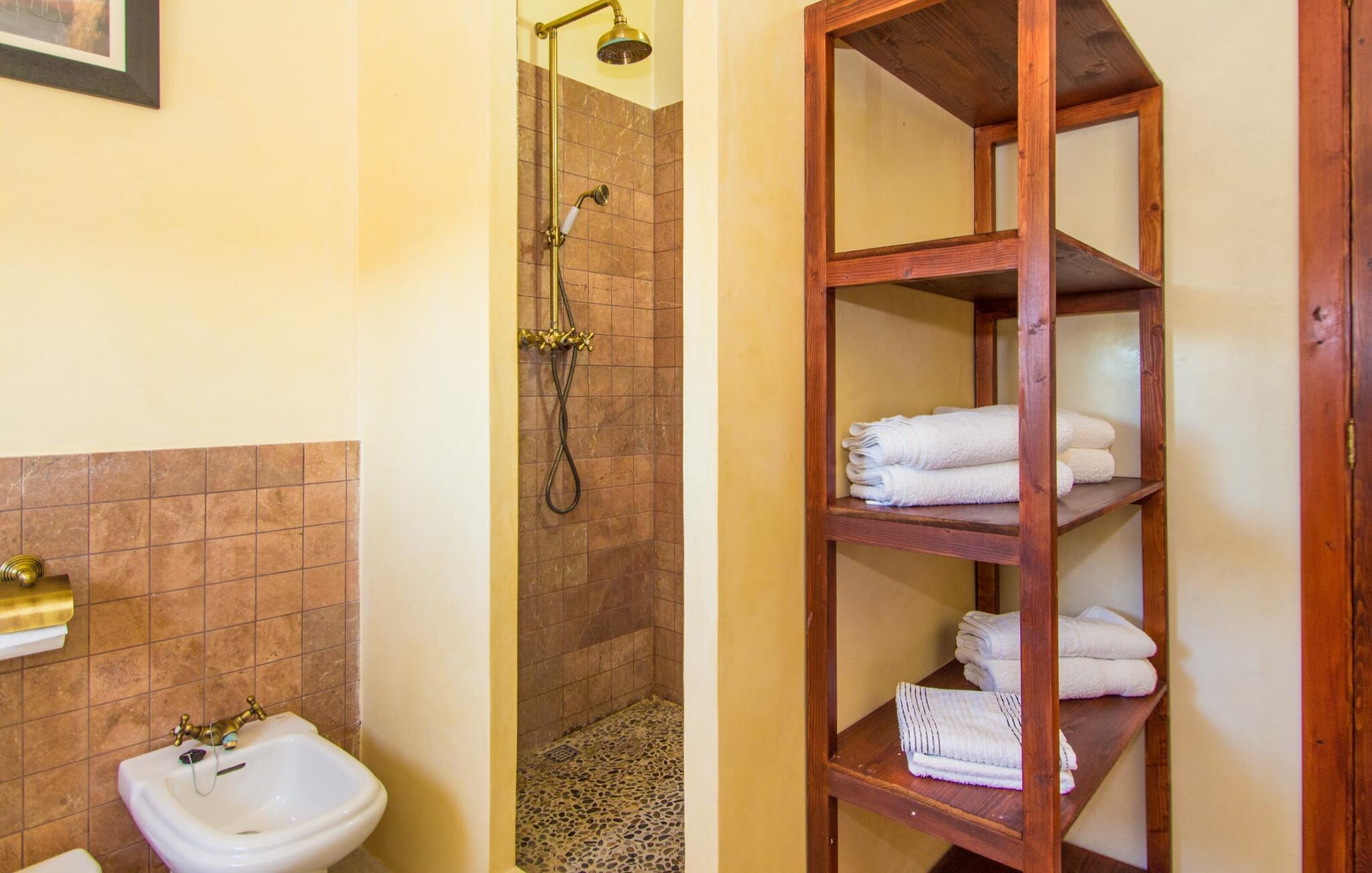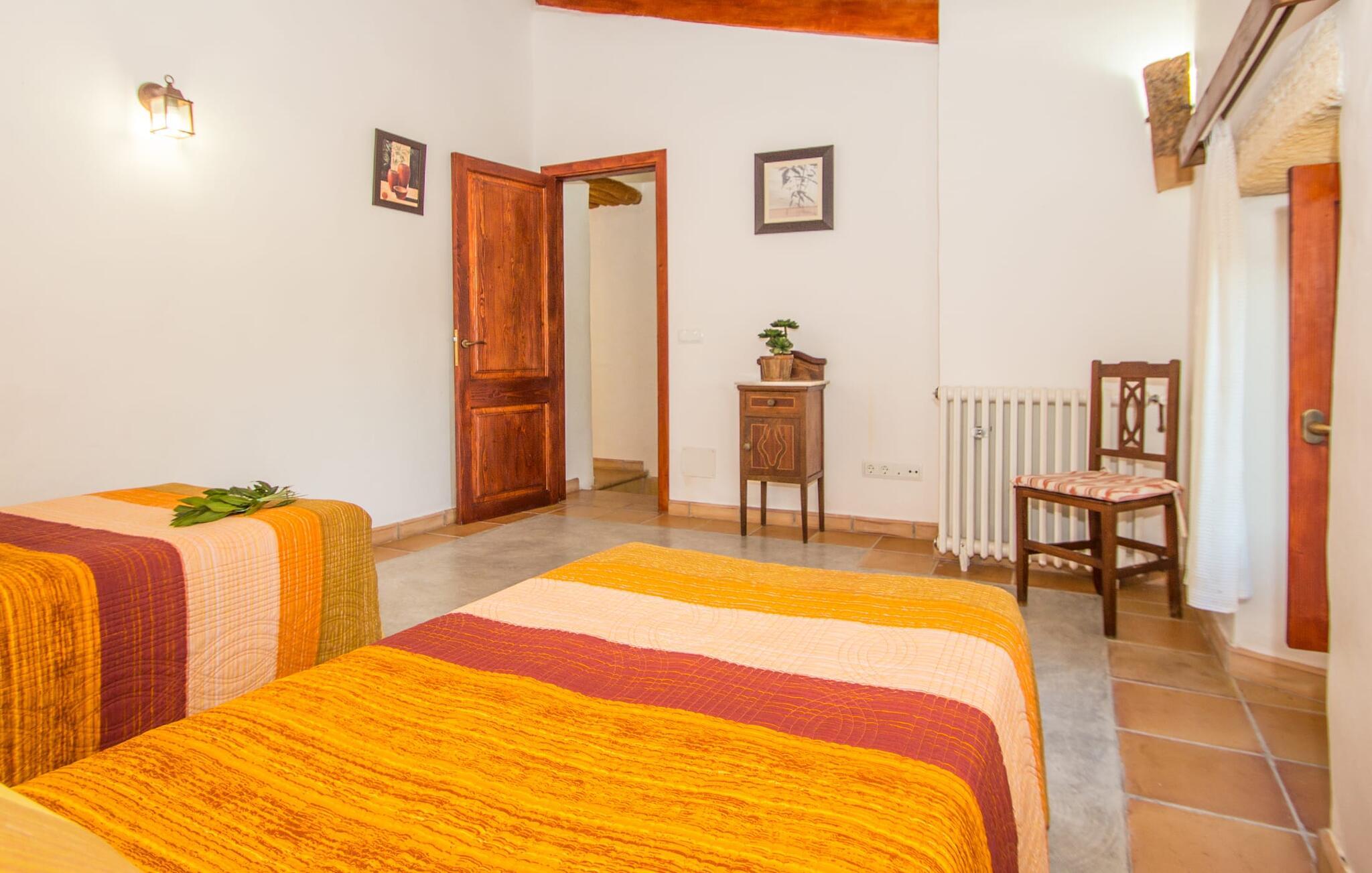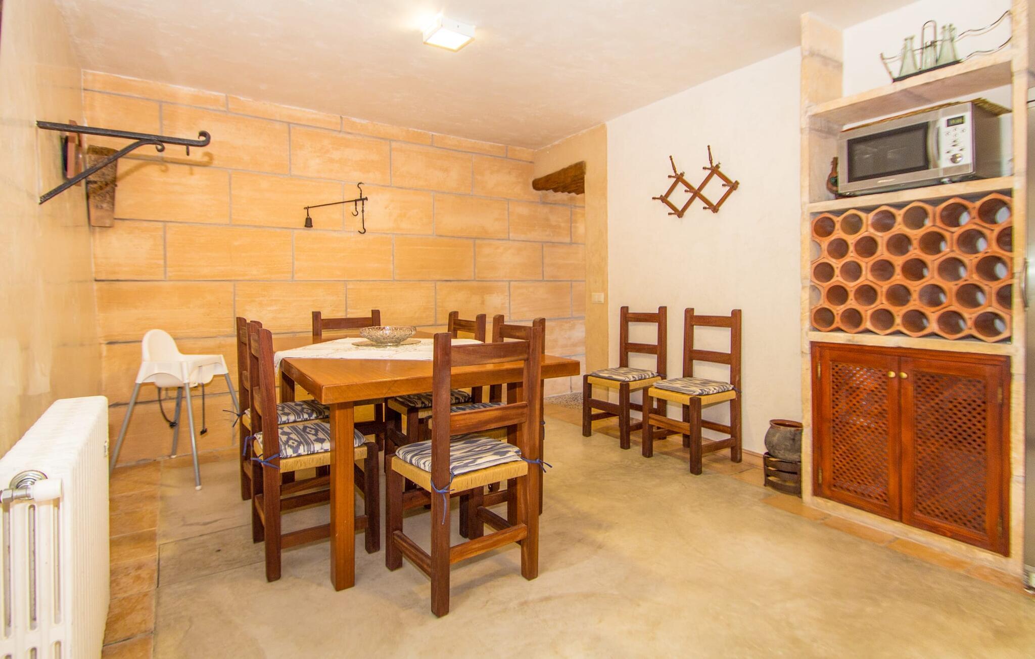 Når du kommer inn i villaen, blir du møtt av en koselig kombinasjon av autentisitet og moderne møbler. Det unike oppholdsrommet med sine rustikke natursteinvegger, synlige takbjelker og perfekt harmoniserende steingulv er et unikt høydepunkt. Her er det lyse, moderne sofaer hvor du kan slappe av når som helst på dagen. Original belysning og dekorasjon avrunder den individuelle stilen på en stemningsfull måte, der du som gjest garantert får lyst til å bli værende. For de som ønsker det, tilbyr dette rommet muligheten til å underholde seg med en god film takket være den store flatskjerm-TV-en med satellittforbindelse som er installert her. Det romslige kjøkkenet, innredet i typisk mallorcinsk stil, tilbyr alt du trenger for dine daglige behov i tillegg til spiseplassen, inkludert kaffemaskin, vannkoker og mange andre funksjoner. Soverommene er designet på en helt spesiell måte og gir det ideelle grunnlaget for en avslappende nattesøvn. En seng på 1,60 x 2,00 meter og to på 0,90 x 1,90 meter står til disposisjon for dette formålet. Her finner alle en soveplass etter egen smak. De to badene er både funksjonelle og dekorative og har rikelig med naturlig lys. Strykejern og hårføner er tilgjengelig i huset, slik at du ikke trenger å kaste bort bagasjeplass ved å ta med ditt eget hjemmefra.