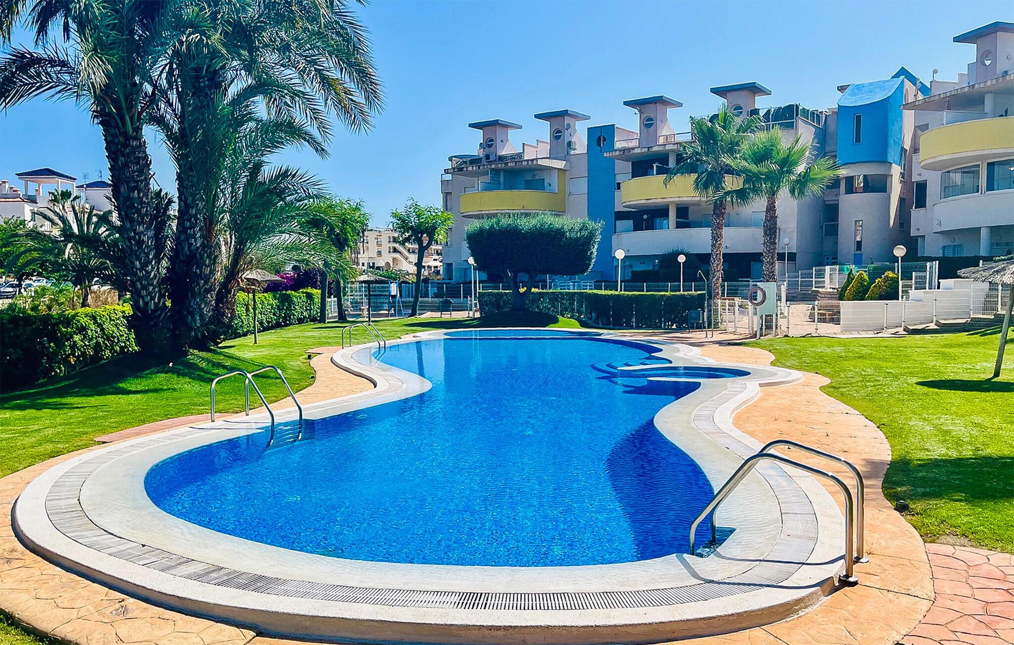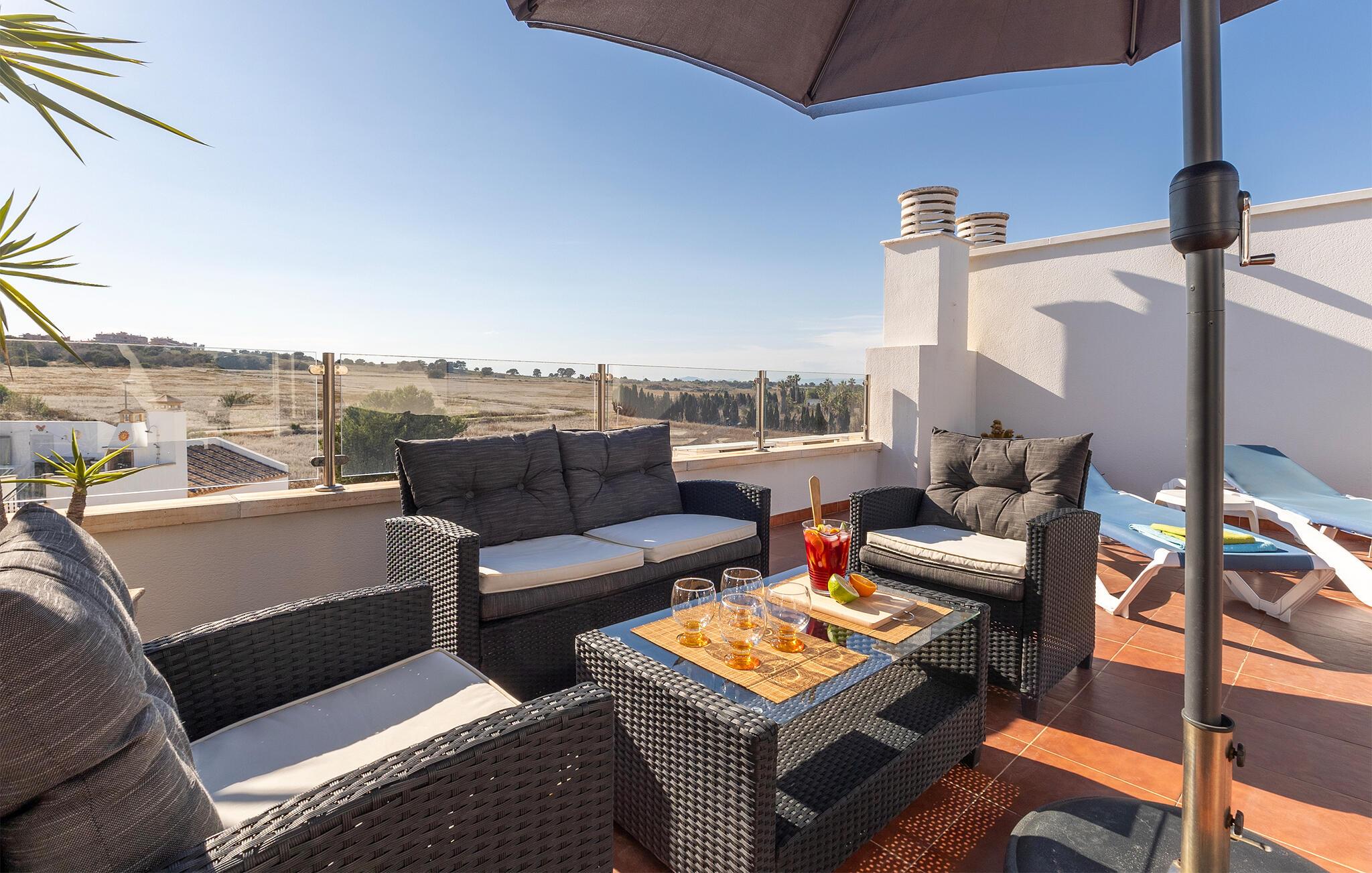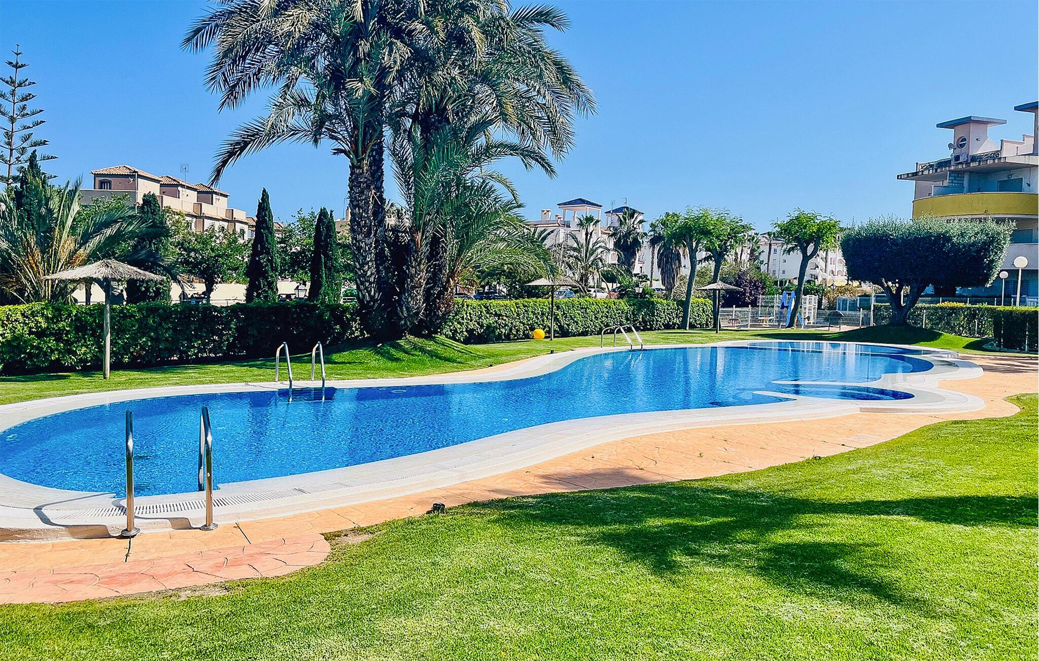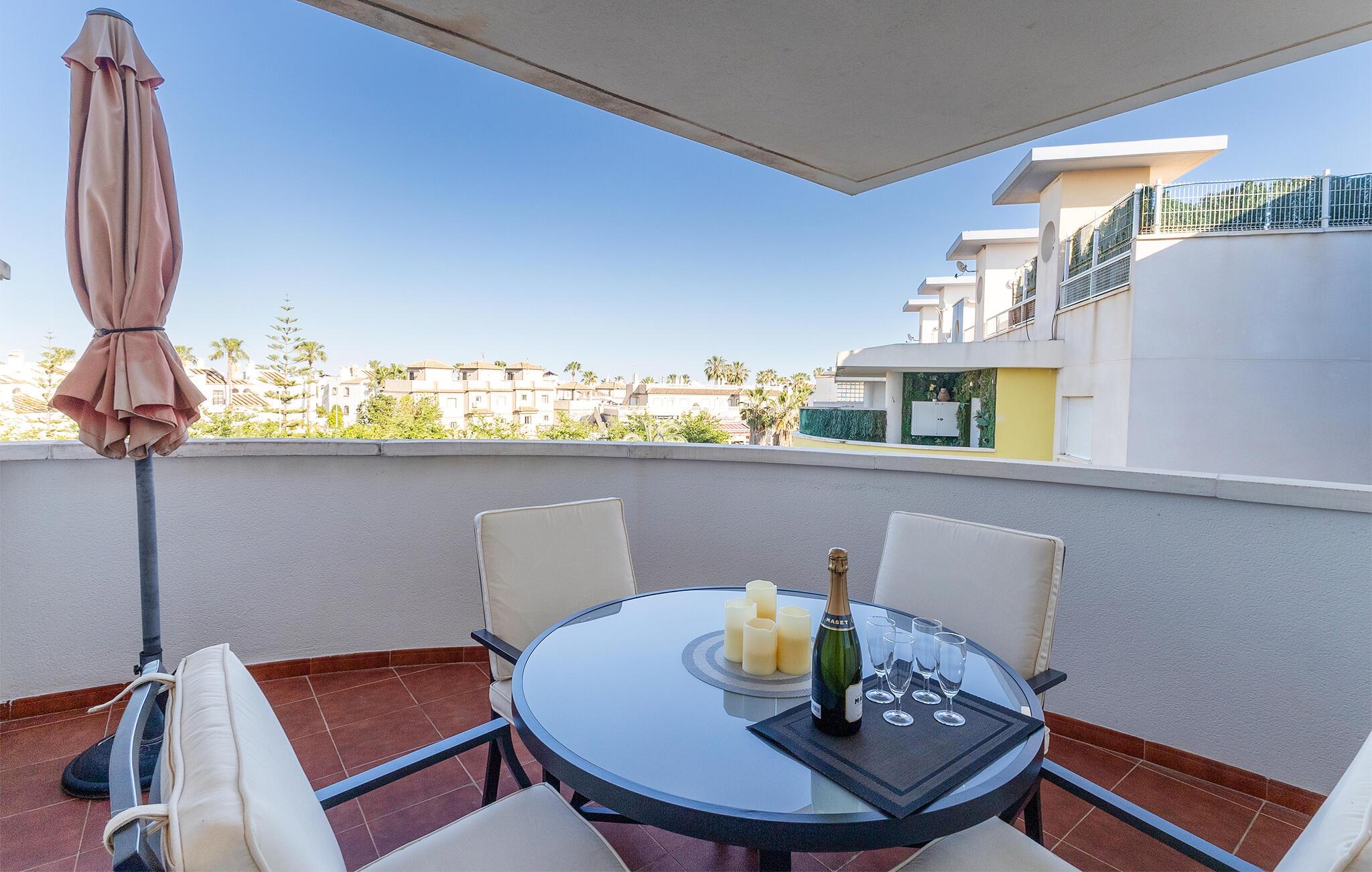 Tilbring en avslappende ferie med stil i denne ferieleiligheten med terrasse og tilgang til bassenget.