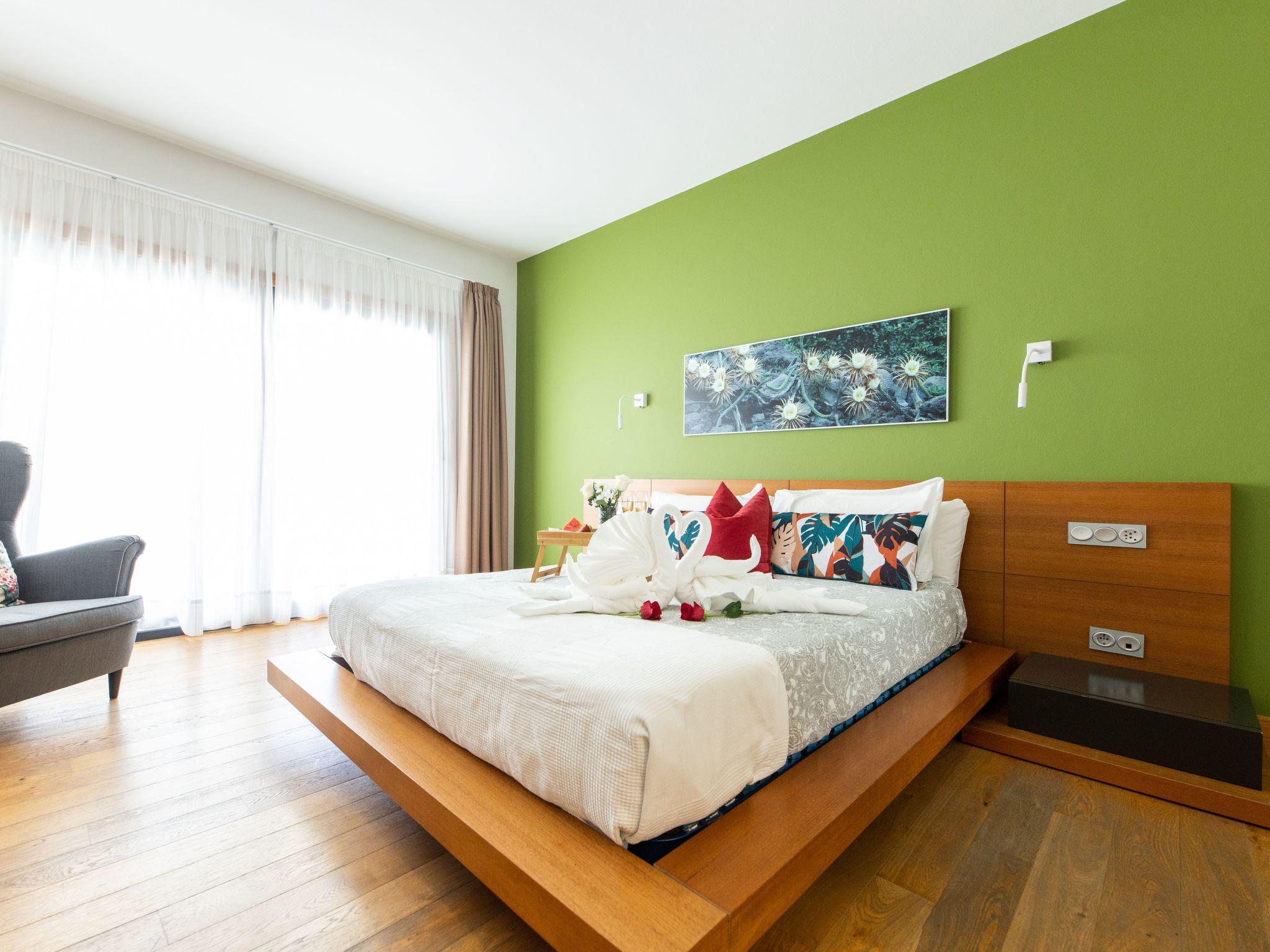 The interior of each villa features three cosy bedrooms; the master bedroom has an en-suite bathroom that includes a hydro-massage shower and Jacuzzi, offering an extra touch of indulgence to your stay. The separate kitchen is fully equipped with top of the line appliances and utensils, accompanied by a utility room with washing machine, tumble dryer, and other necessities for an extended stay. In addition, the living room offers modern conveniences such as a television with access to satellite channels and free wifi, ensuring both entertainment and comfort.