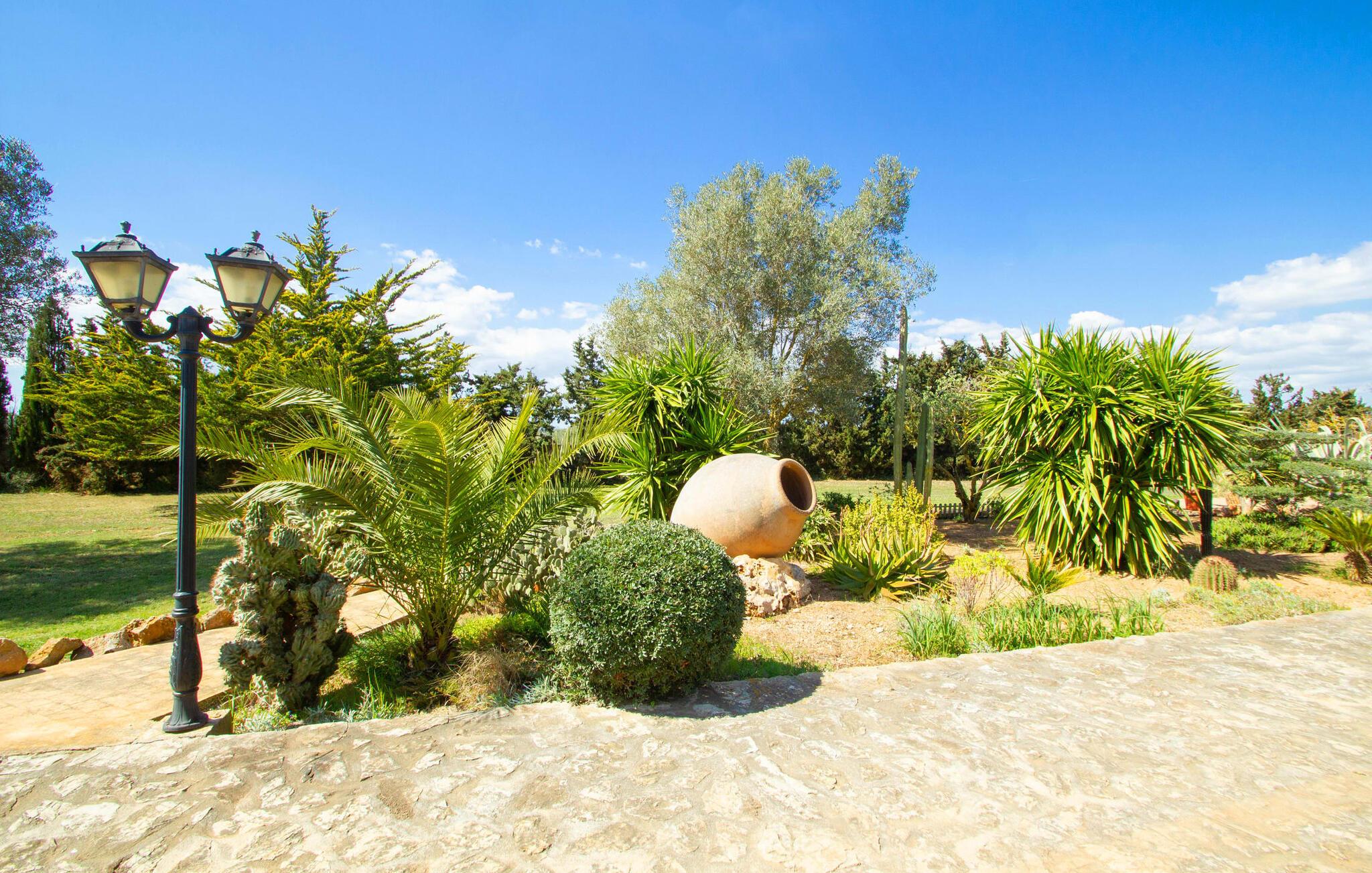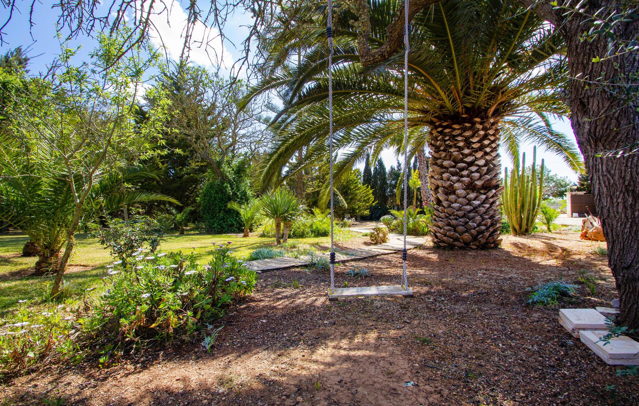 Oasis des Trenc er et sant paradis for familier. Her er det god plass til å leke og løpe rundt i den velstelte hagen med en flott plen, så barna vil føle seg hjemme her. Her er det huske, trampoline og ikke minst et vakkert, flislagt basseng med noen få trappetrinn for enkel tilgang. Og: Takket være de mange trærne og palmene er det lett å finne skyggefulle steder. Foreldrene kan slappe av i solsengene eller fyre opp grillen, som har funnet sin plass på terrassen. Med sin fasade i naturstein og røde puss, smelter villaen harmonisk inn i omgivelsene. Søte dekorative elementer, en liten sti, potteplanter i alle størrelser gir eiendommen en varm og kjærlig velkomst. På den overbygde terrassen med et vakkert spisebord kan du nyte den herlige middelhavsbrisen til frokost om morgenen eller runde av dagen sammen om kvelden.