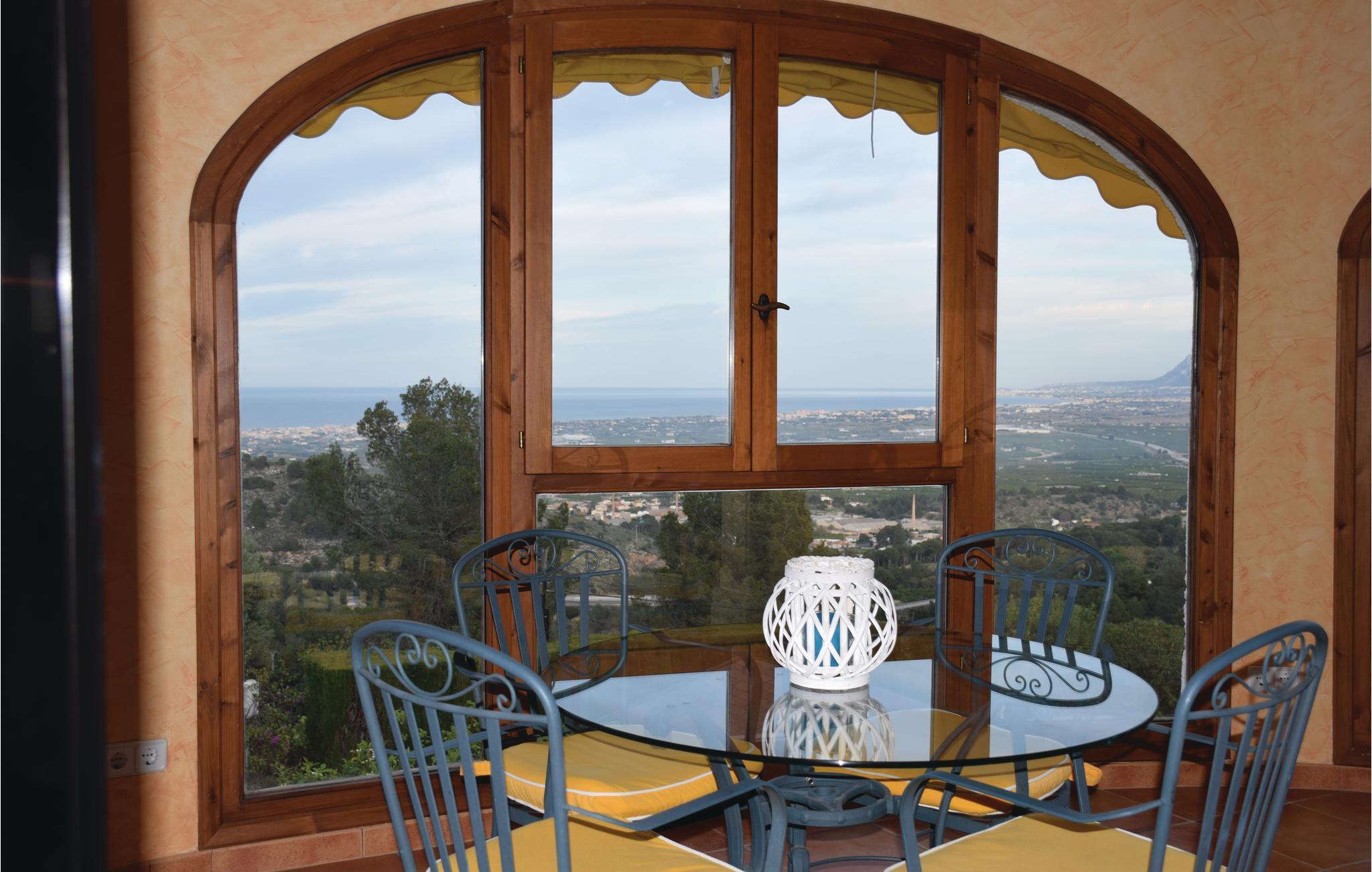 Dette panoramahuset ligger på en høyde, omtrent 3 km fra Oliva og 20 km fra Denia. Med sine gulv-til-tak-vinduer har boligen en fantastisk utsikt over Gallinera-dalen, naturparken Marjal Oliva Pego og Denia med Montgo-fjellet. På en klar dag kan du se så langt som til øya Ibiza. Bassenget med romerske trapper ligger på en 1000 m² stor tomt omgitt av frukttrær, en plen og en blomsterhage. Omgitt av plantasjer vil du merke duften av appelsiner når de blomstrer. Huset har også et bassenghus (med dusj og vask).