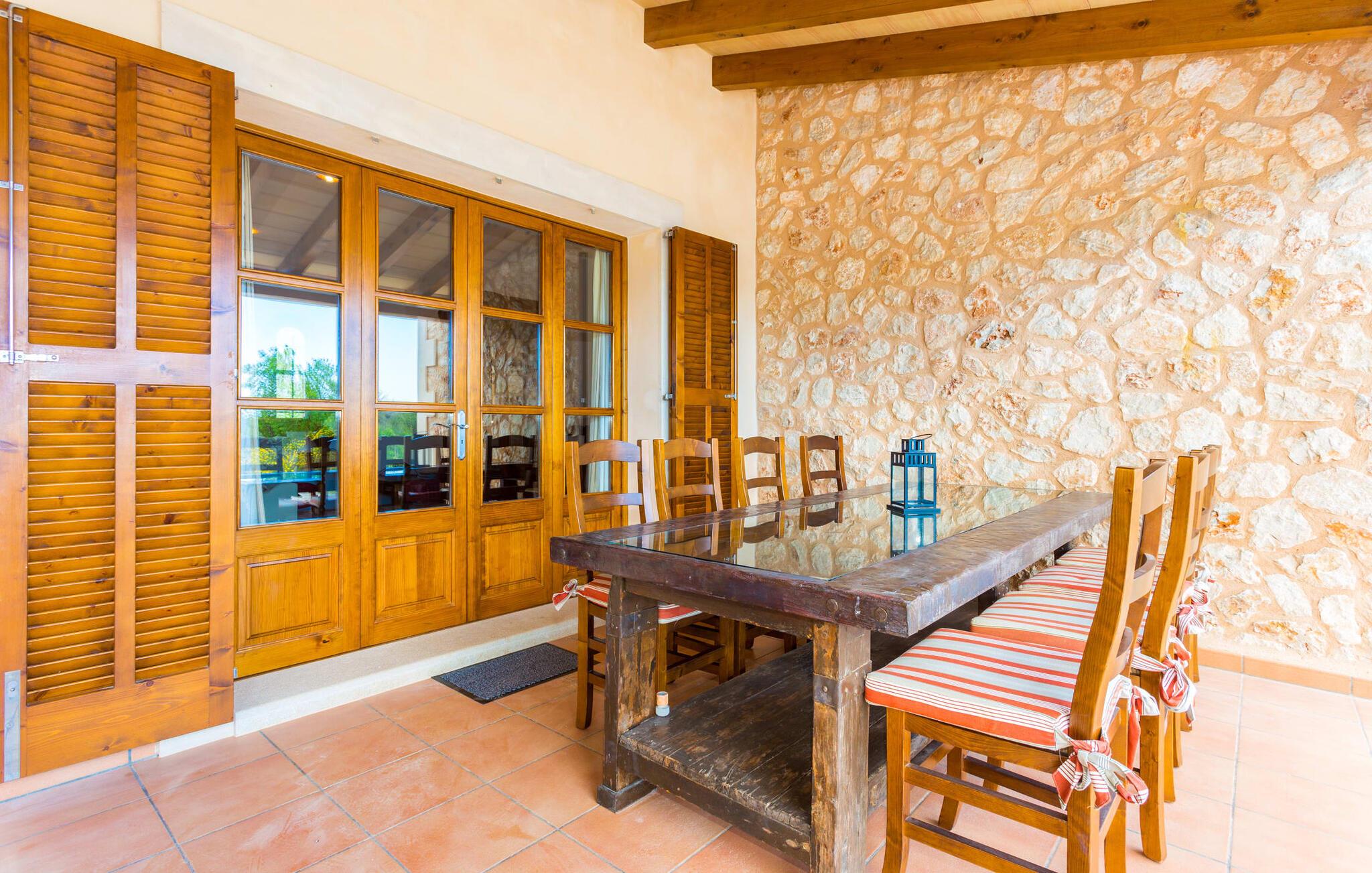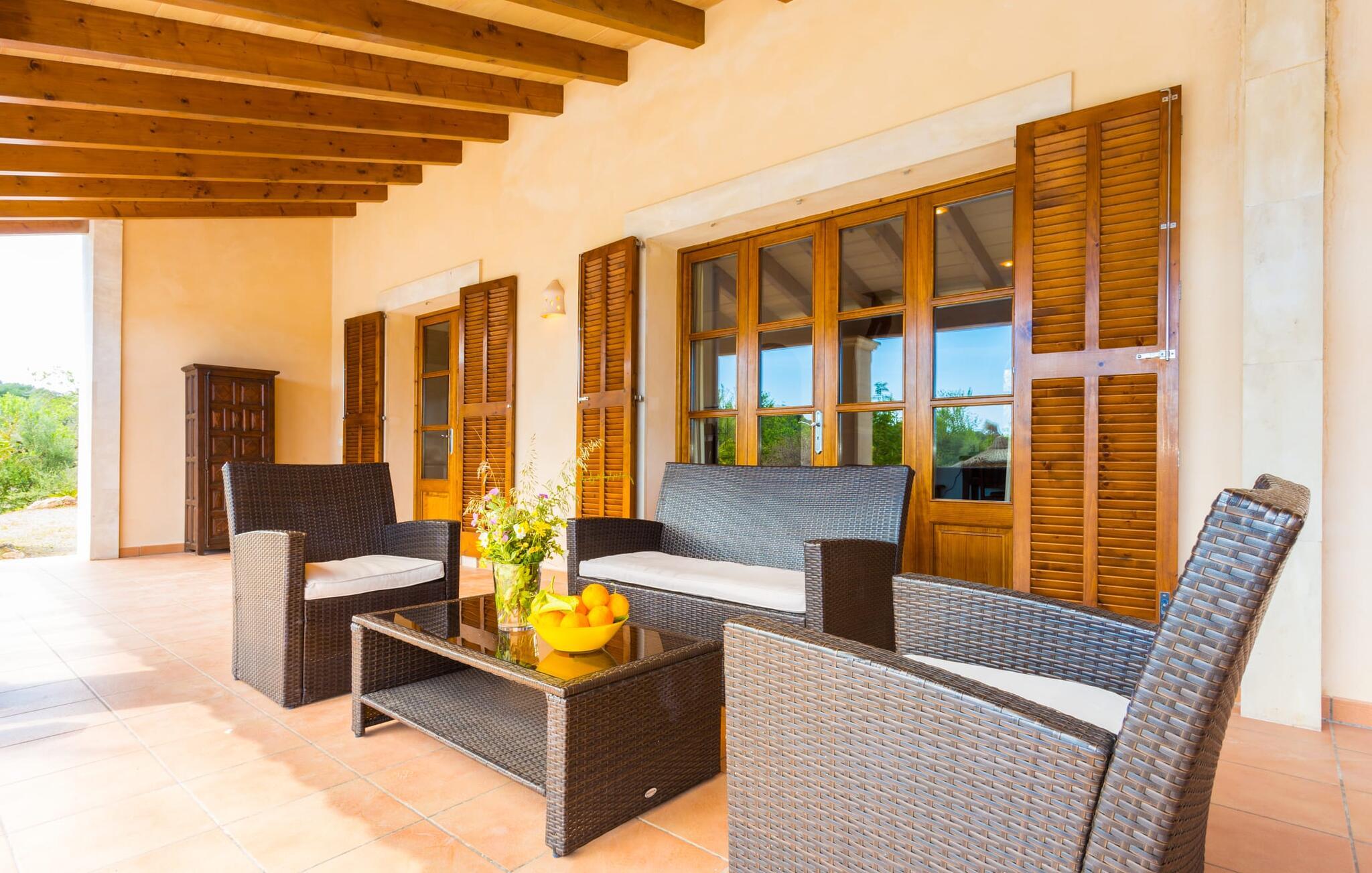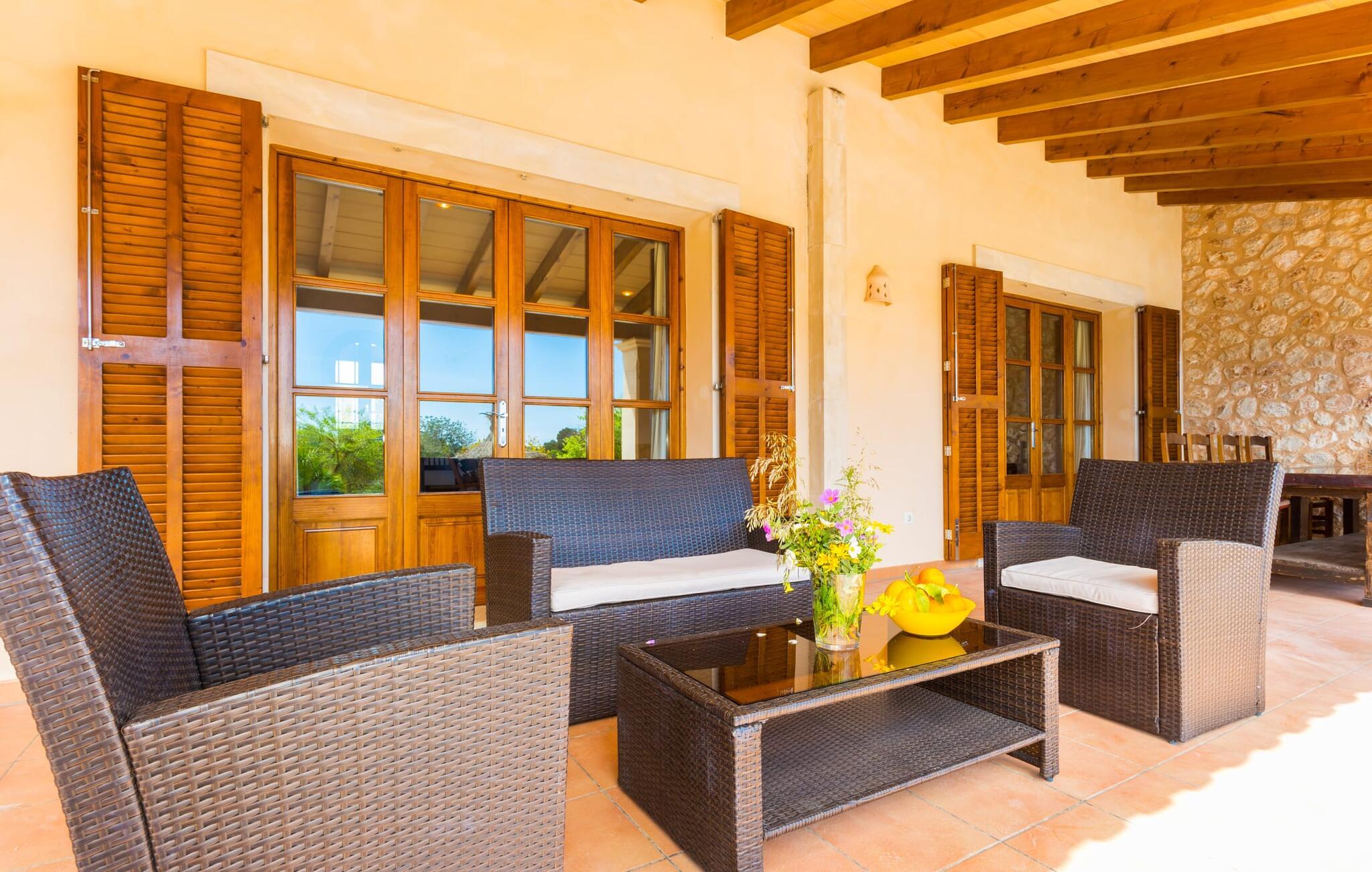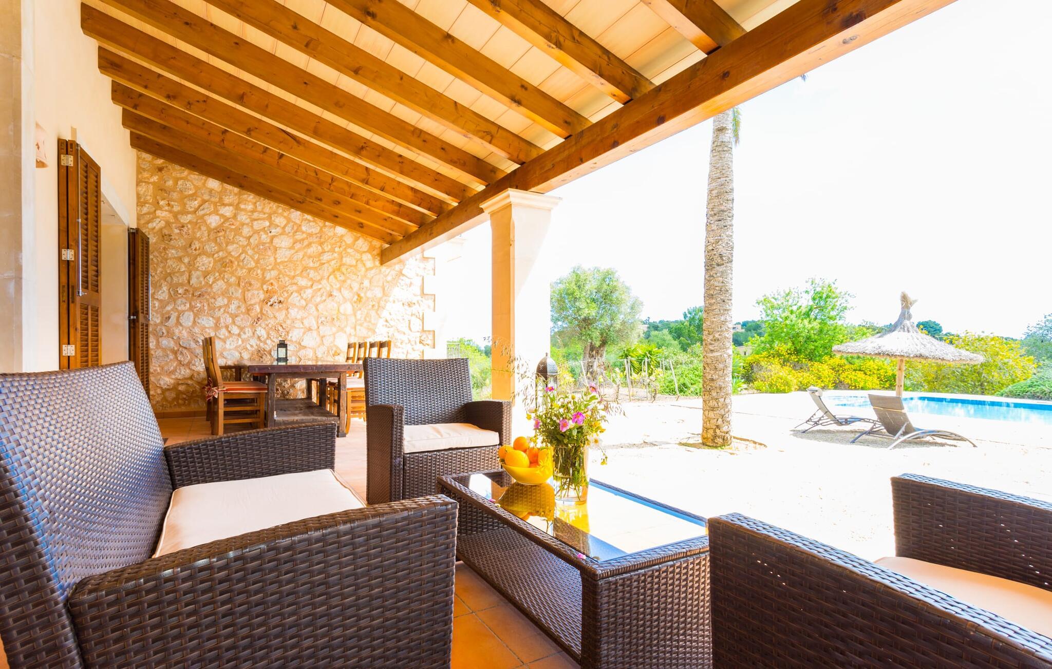 Hvis du er nysgjerrig når du ankommer, vil en spasertur rundt huset føre deg til bassengområdet på bare noen få skritt. Det romslige bassenget, som har en elegant avrundet inngang og innbyr til svømmeturer, er omgitt av en flislagt terrasse med solsenger. Utsikten er fascinerende uansett hvor du står: enten over nabobuskene eller ut i det vide landskapet mot bygningen, foran hvilken de to palmetrærne og den fastmonterte parasollen står. Hvis du finner din perfekte plass på en av de mange solsengene, kanskje med en kjølig drink i hånden, kan du slappe av i fred og ro. Rett og slett flott: dette er den perfekte ferie! Stien til huset er asfaltert og går rundt de åpne gruslagte områdene. To trappetrinn fører deg til terrassen, som er generøst overbygd over hele lengden på den enetasjes bygningen. I tillegg til det rustikke spisebordet og den koselige sittegruppen er det mer enn nok plass til alle slags aktiviteter. Det synlige trebjelkeloftet er fargekoordinert med vinduene og skoddene, noe som skaper en hyggelig atmosfære. Den omkringliggende muren av tradisjonelt murverk avrunder utseendet. Det er også en mursteinsgrill i nærheten, som inviterer deg til å tilberede og spise mat kjøpt i nabolaget. Her er det lett å tilbringe en koselig time! De som ønsker skygge, vil finne god plass under de to parasollene og på den overbygde terrassen.