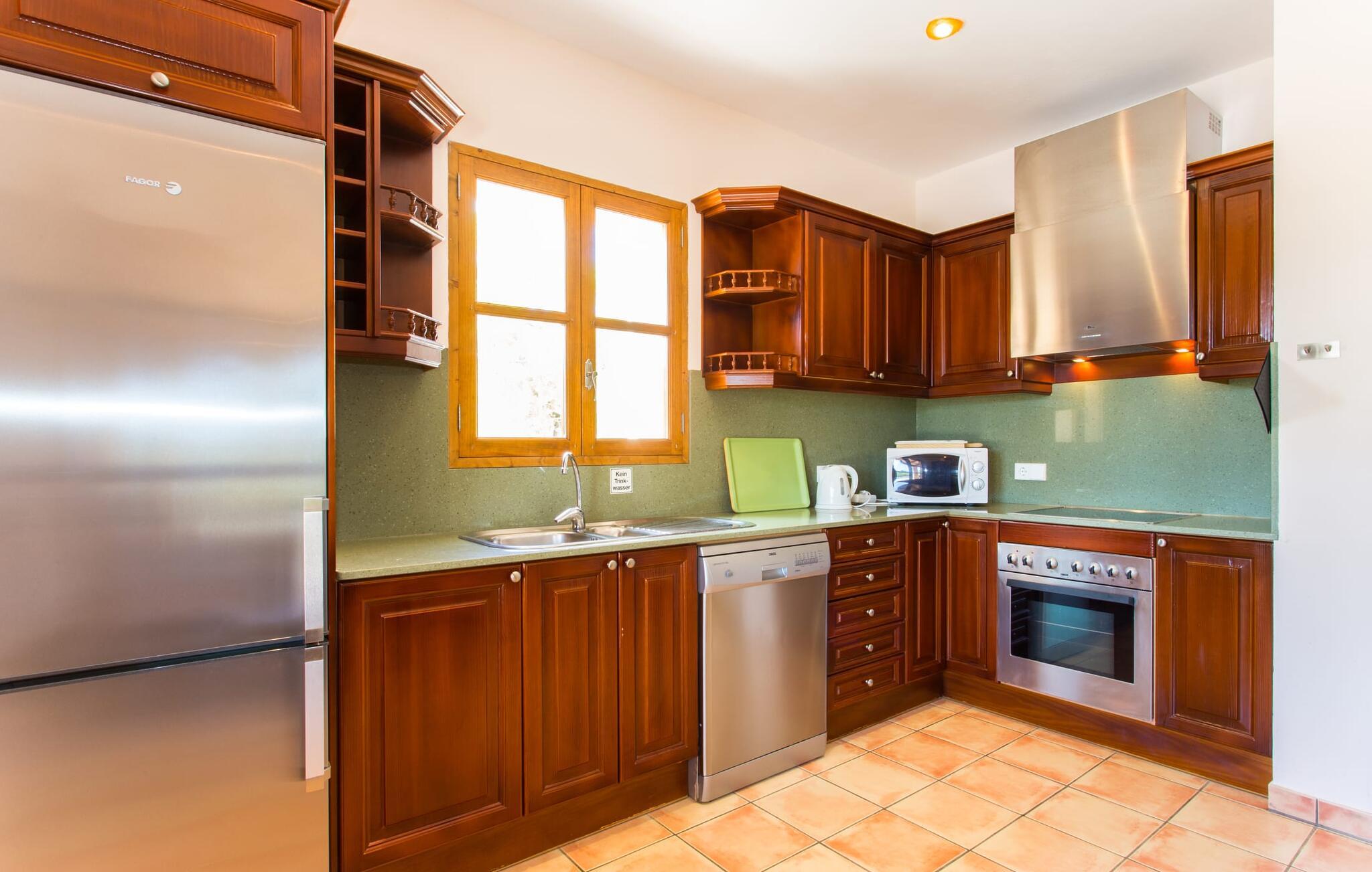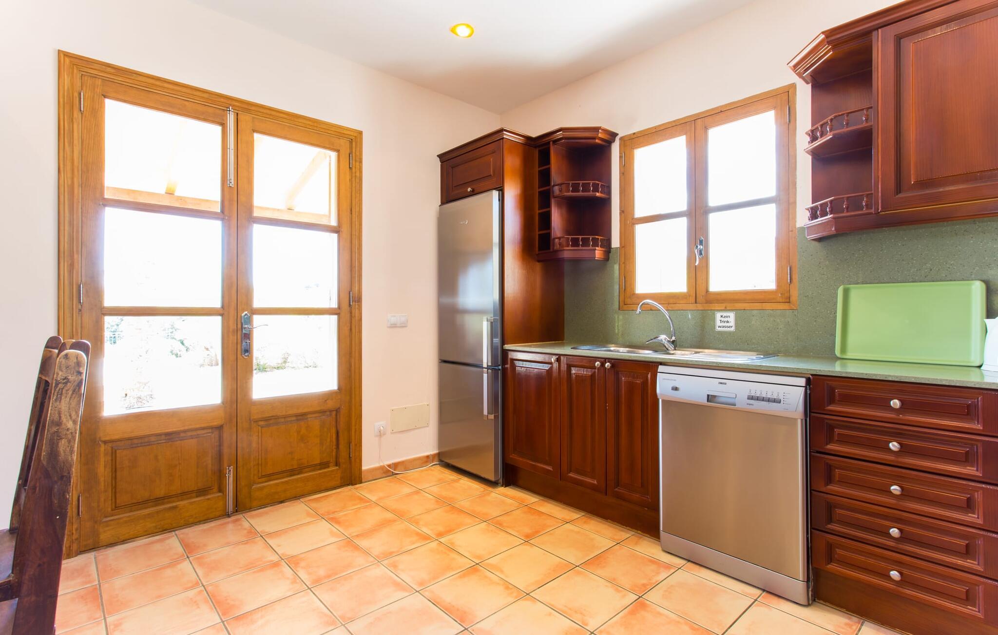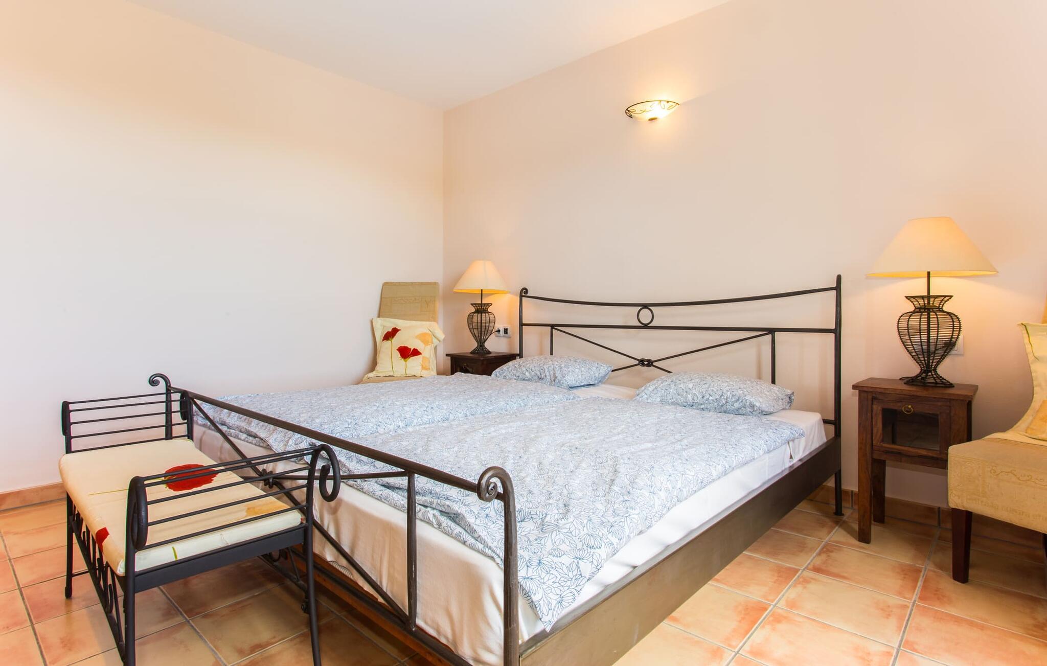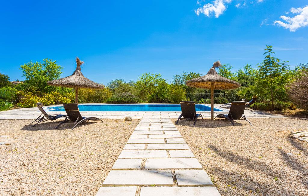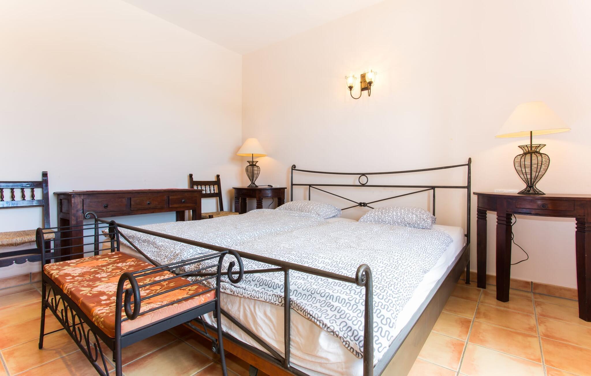Hvis du er nysgjerrig når du ankommer, vil en spasertur rundt huset føre deg til bassengområdet på bare noen få skritt. Det romslige bassenget, som har en elegant avrundet inngang og innbyr til svømmeturer, er omgitt av en flislagt terrasse med solsenger. Utsikten er fascinerende uansett hvor du står: enten over nabobuskene eller ut i det vide landskapet mot bygningen, foran hvilken de to palmetrærne og den fastmonterte parasollen står. Hvis du finner din perfekte plass på en av de mange solsengene, kanskje med en kjølig drink i hånden, kan du slappe av i fred og ro. Rett og slett flott: dette er den perfekte ferie! Stien til huset er asfaltert og går rundt de åpne gruslagte områdene. To trappetrinn fører deg til terrassen, som er generøst overbygd over hele lengden på den enetasjes bygningen. I tillegg til det rustikke spisebordet og den koselige sittegruppen er det mer enn nok plass til alle slags aktiviteter. Det synlige trebjelkeloftet er fargekoordinert med vinduene og skoddene, noe som skaper en hyggelig atmosfære. Den omkringliggende muren av tradisjonelt murverk avrunder utseendet. Det er også en mursteinsgrill i nærheten, som inviterer deg til å tilberede og spise mat kjøpt i nabolaget. Her er det lett å tilbringe en koselig time! De som ønsker skygge, vil finne god plass under de to parasollene og på den overbygde terrassen.