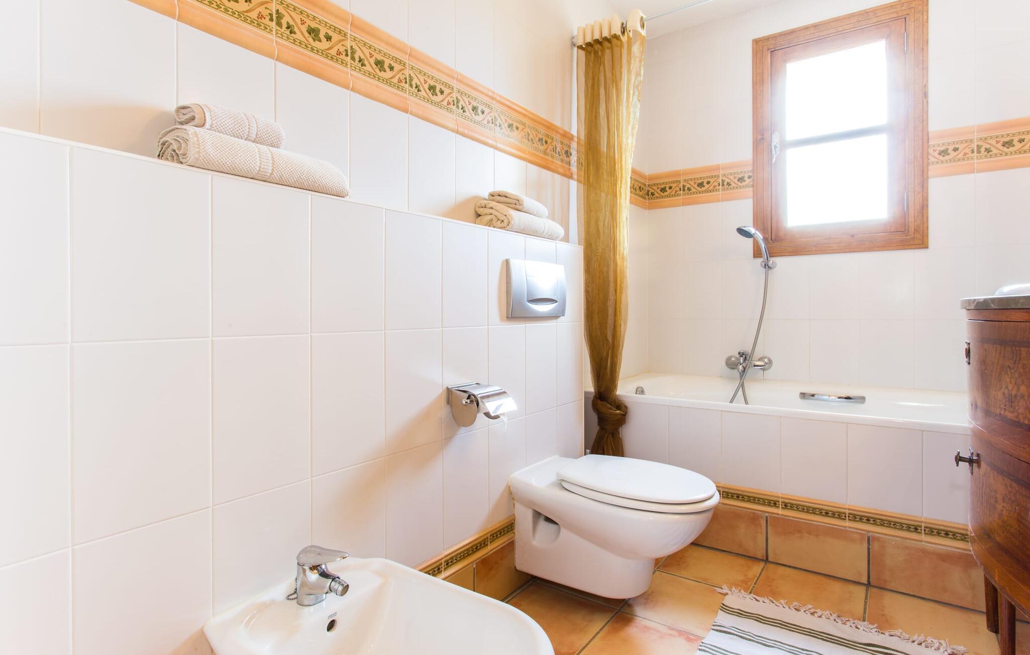 Gulvet i huset er helt flislagt; hele eiendommen fanger solen veldig godt og fremstår derfor som veldig lys og innbydende. I bygningens første etasje finner du den åpne stuen, som er komfortabelt innredet med en blanding av moderne og tradisjonelle møbler. Du kommer garantert til å kose deg i den koselige sofagruppen, ved peisen eller foran TV-en! I tilknytning til dette ligger det åpne kjøkkenet med spiseplass, som er fullt utstyrt. Det er ytterligere to soverom og to bad i denne etasjen, hvorav det ene også har vaskemaskin. I øverste etasje er det ytterligere to doble soverom, et bad og, som et spesielt høydepunkt, en liten terrasse hvor du kan nyte mange hyggelige timer i solen. Alle soverommene er funksjonelt innredet og tilbyr rikelig med lagringsplass takket være innebygde garderober. Badene er utstyrt med badekar og dusj. De rustikke speilene, det vakre tilbehøret og den sterke belysningen vil mer enn oppfylle alle dine forventninger.