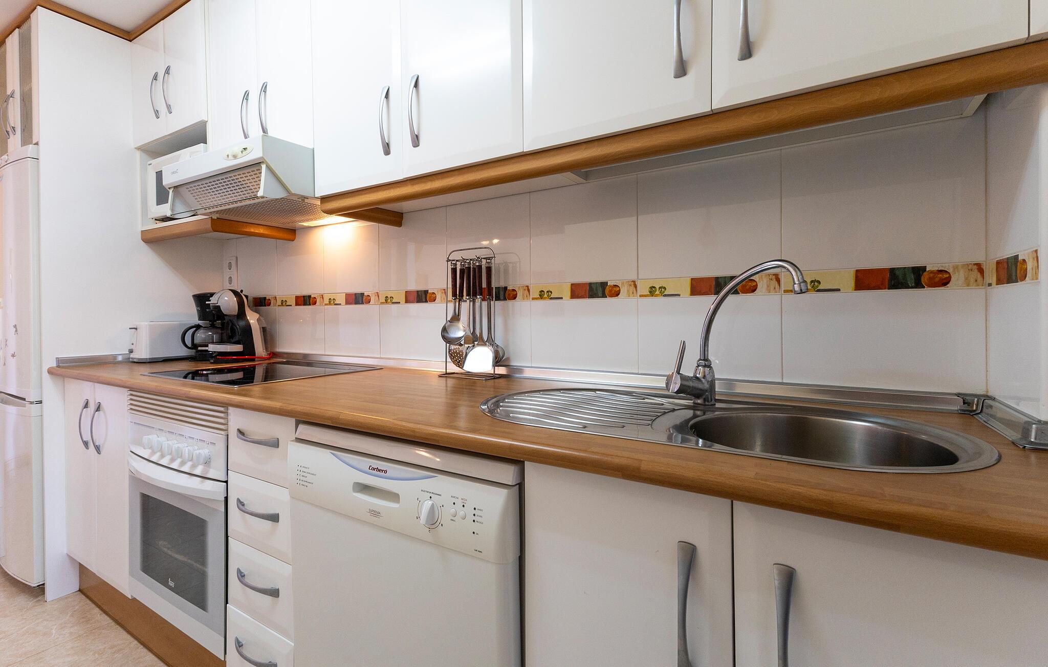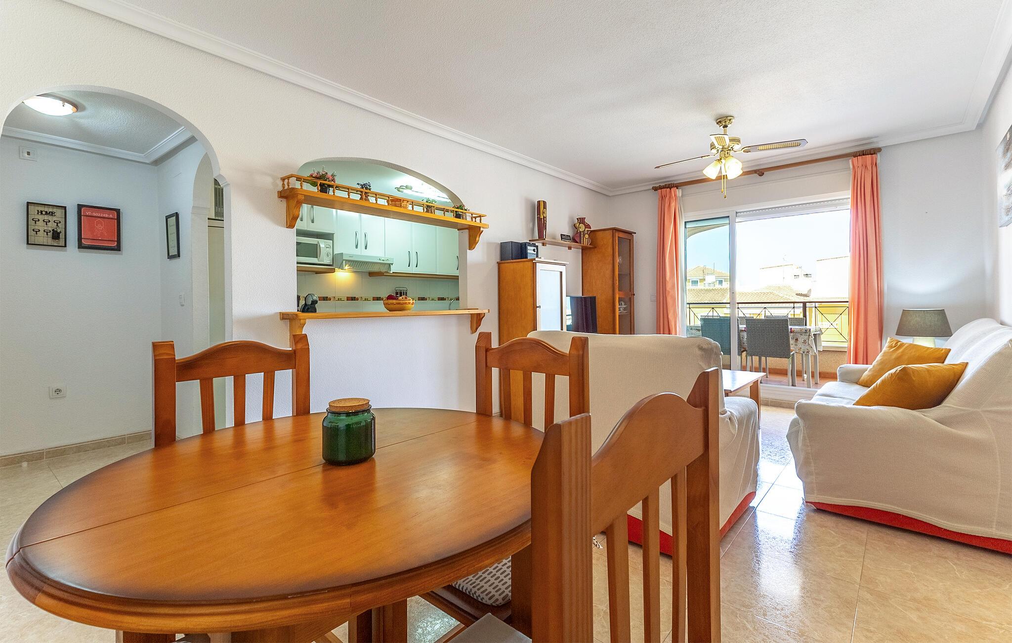 Denne komfortable ferieleiligheten ønsker deg velkommen med en lys og vennlig atmosfære. Her kan du trylle frem middelhavsretter og planlegge eventyrene dine sammen ved det innbydende spisebordet. Etter en lang dag i solen kan du slappe av her med en kveld med spill eller fordype deg i ferielesning i den koselige sofaen.