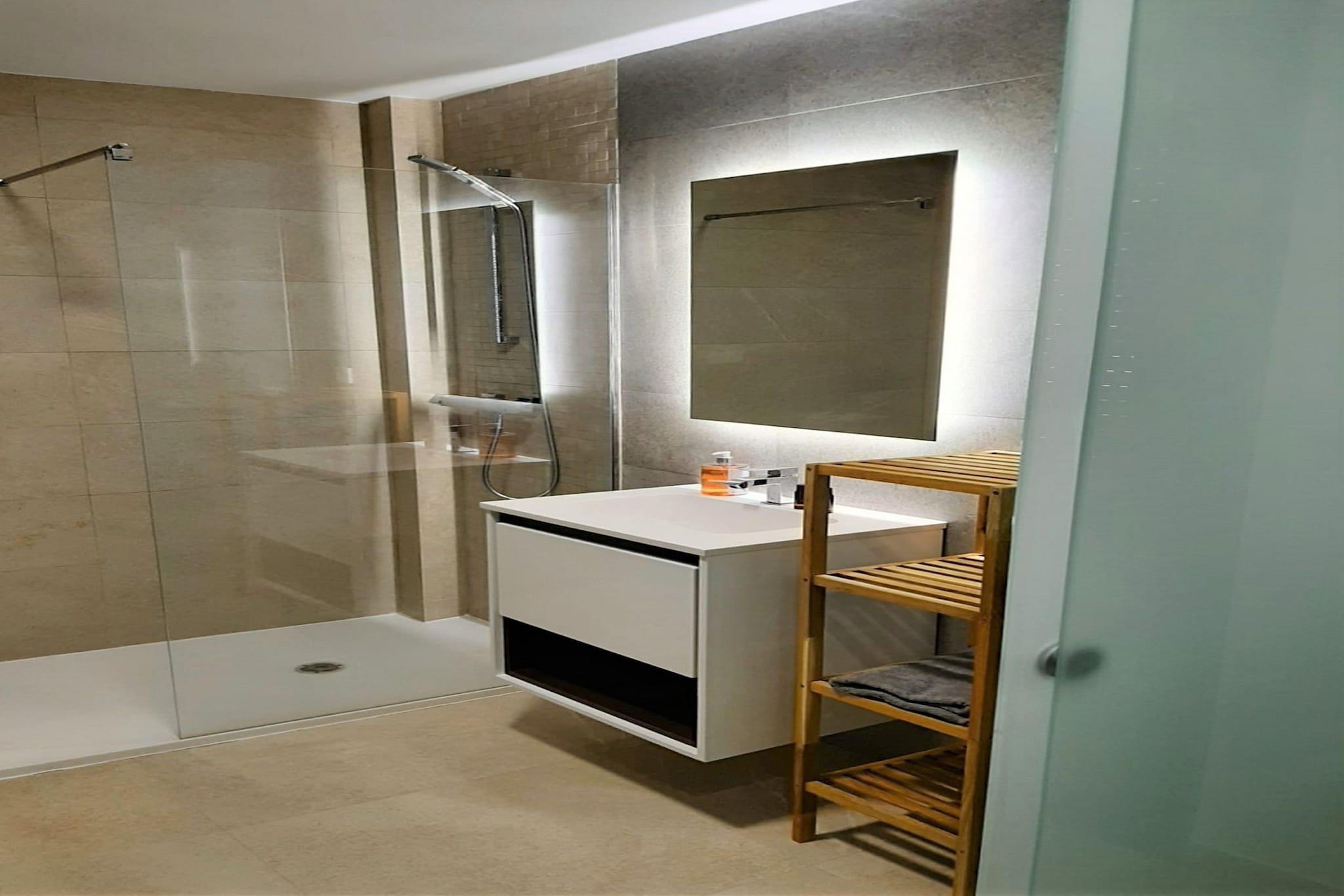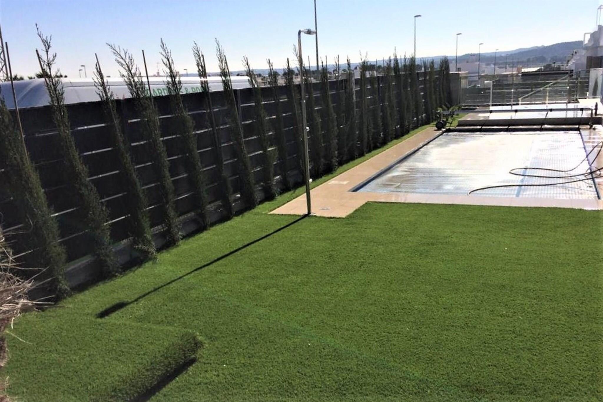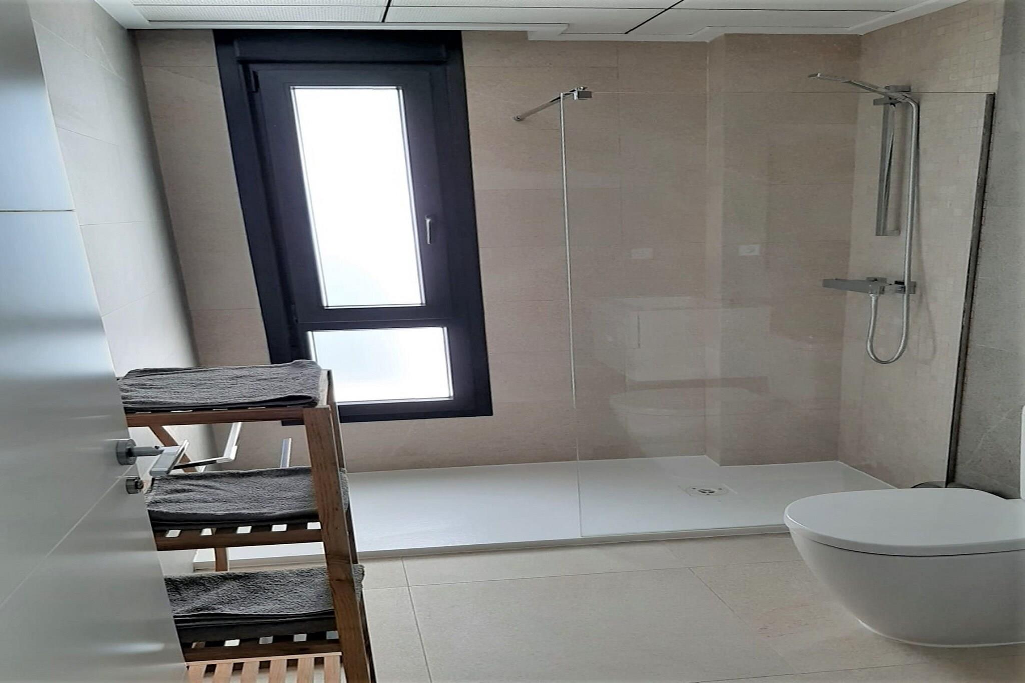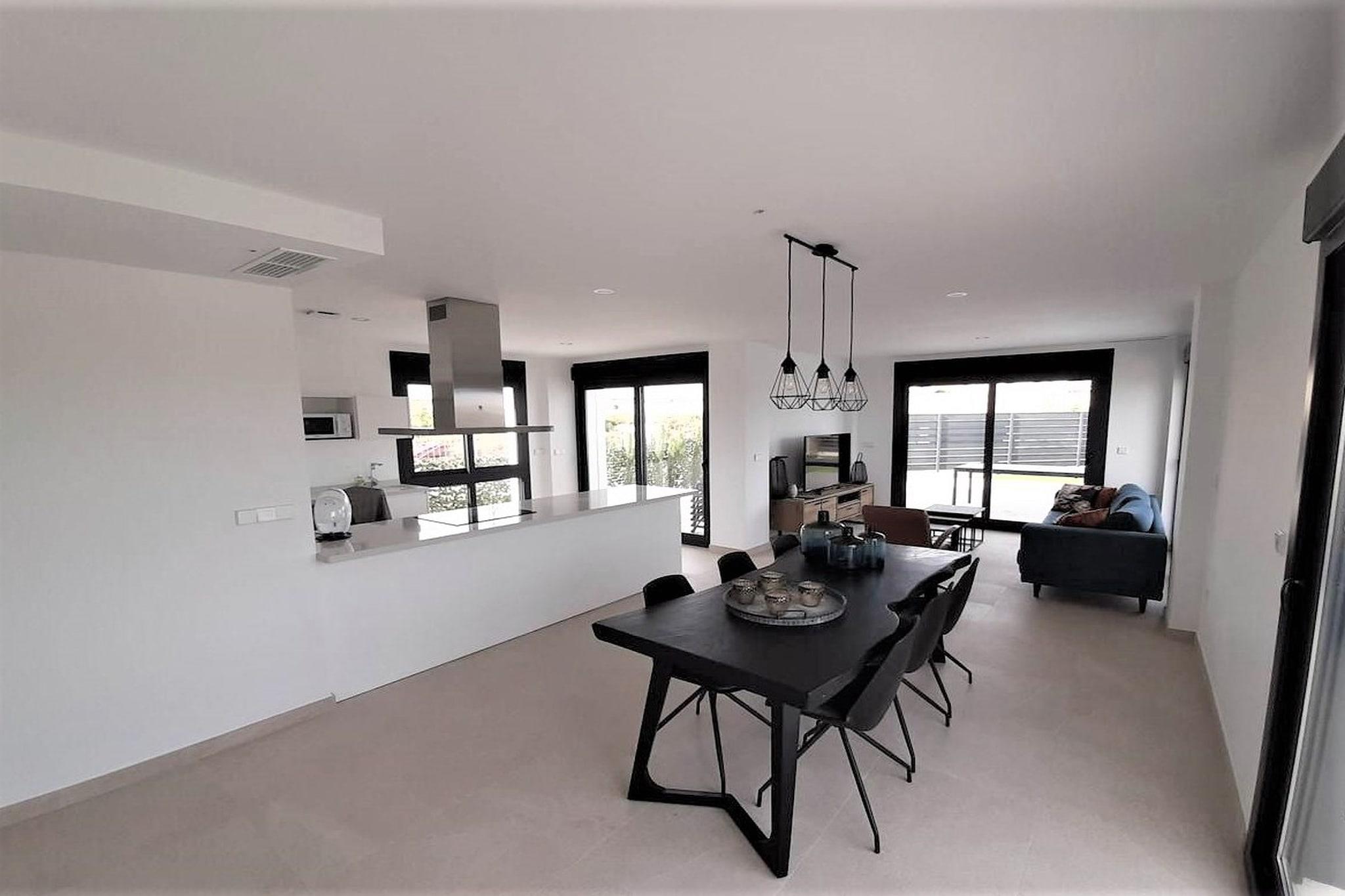 Første etasje: (Inngang, åpent kjøkken(komfyr med kokeplater(komfyr med 4 kokeplater, elektrisk), kaffetrakter, stekovn, mikrobølgeovn, oppvaskmaskin), Stue/spisestue(45 m2)(TV(flatskjerm), sittehjørne), soveværelse(9 m2)(enkeltseng(90 x 200 cm), enkeltseng(90 x 200 cm)), soveværelse(9 m2)(dobbeltseng), Sovrum med badrum(16 m2)(dobbeltseng(135 x 200 cm), dusj, håndvask, toalett), bad(dusj, håndvask, toalett)) spisebord, solarium, vaskemaskin, franske dører, oppvarming, klimaanlegg, terrasse(privat, 90 m2), terrasse(privat, 65 m2), hage(privat, 30 m2), hagemøbler, grill, parkering, svømmebasseng(privat, utendørs, 8 x 4 m., opened from Jun upto and including Sep), hengekøye, strykebrett, strykejern
