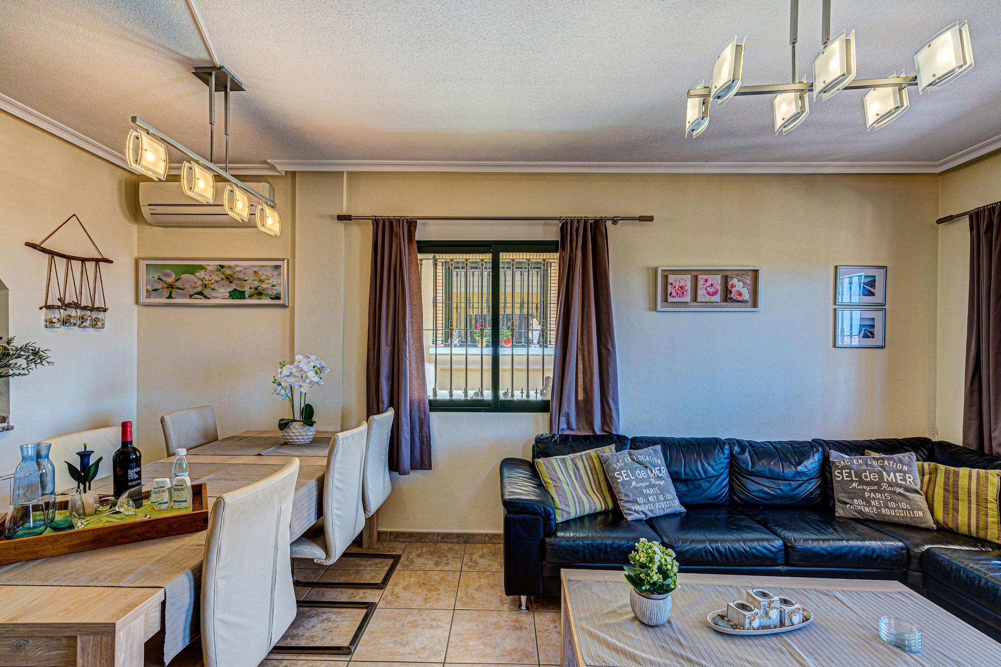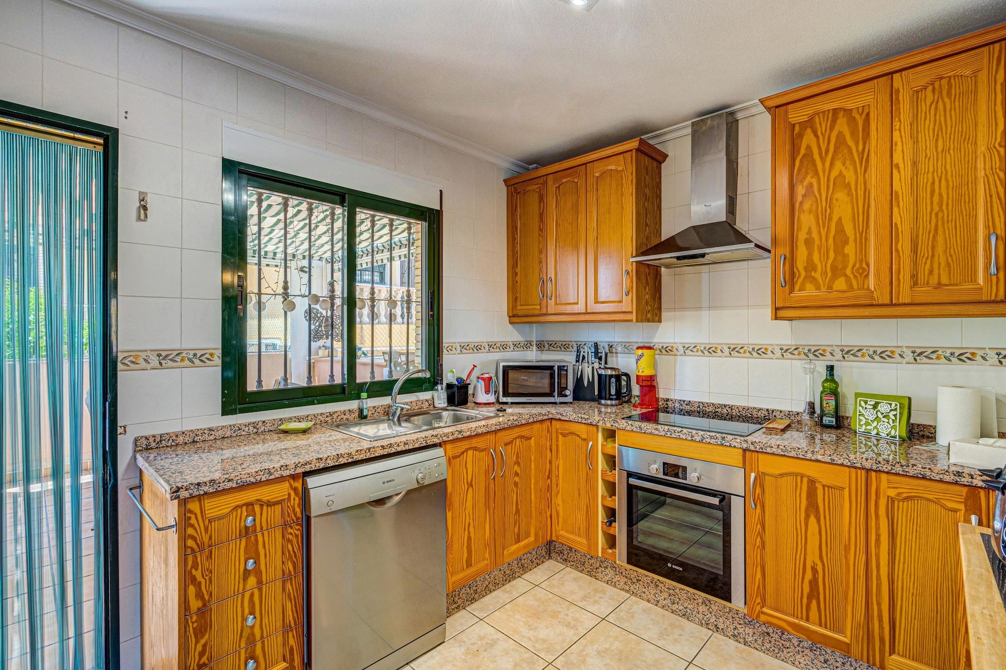 Dette sjarmerende feriehuset i Orihuela Costa tilbyr den perfekte blandingen av privatliv, komfort og kystmoro, ideelt for familier eller venner. Eiendommen er omgitt av en frodig hage og høye murer, og sikrer et fredelig og privat opphold kun få minutter fra stranden. Innvendig gir den romslige stuen og det velutstyrte kjøkkenet (med Dolce Gusto- og Senseo-maskiner) alle hjemmets bekvemmeligheter. Gå ut på den solfylte terrassen for å nyte måltider eller drinker i frisk luft. Garasjen inkluderer treningsutstyr og tre sykler, en elektrisk, slik at du kan utforske området i ditt eget tempo. Du er bare i kort avstand fra sandstrendene i Punta Prima, Playa Flamenca, La Zenia og Cabo Roig, hvor levende musikk legger til helgens sjarm. Det anerkjente kjøpesenteret La Zenia ligger bare 2 km unna, og tilbyr en livlig blanding av butikker og spisesteder. Etter en tur langs kysten kan du slappe av på en av de mange koselige restaurantene i nærheten. Gjestene har også tilgang til et felles svømmebasseng og petanqueområde, noe som legger til fritidstilbudene. Enten du soler deg, sykler eller bare slapper av i hagen, er dette hjemmet en herlig base for din Costa Blanca-flukt.