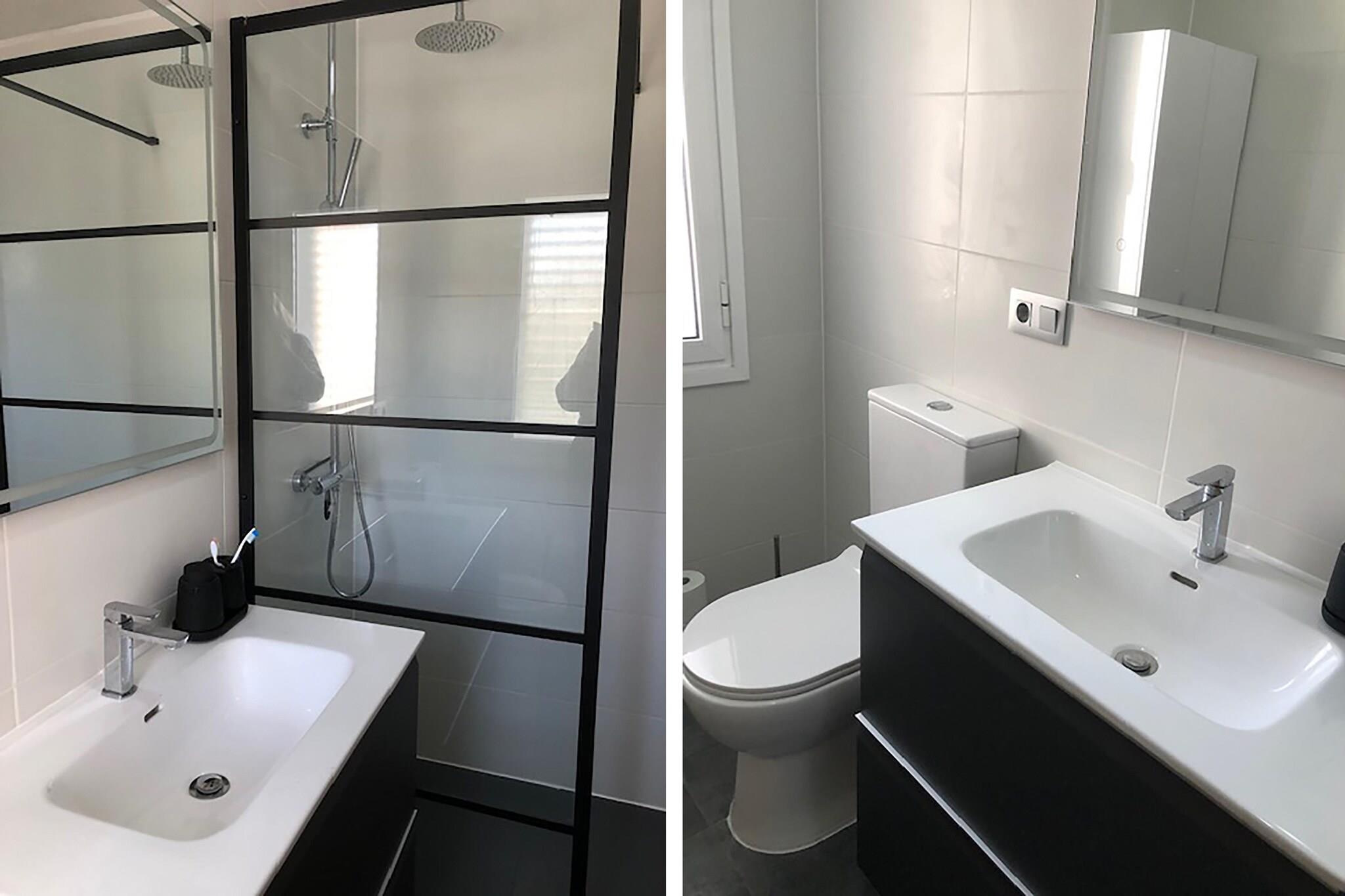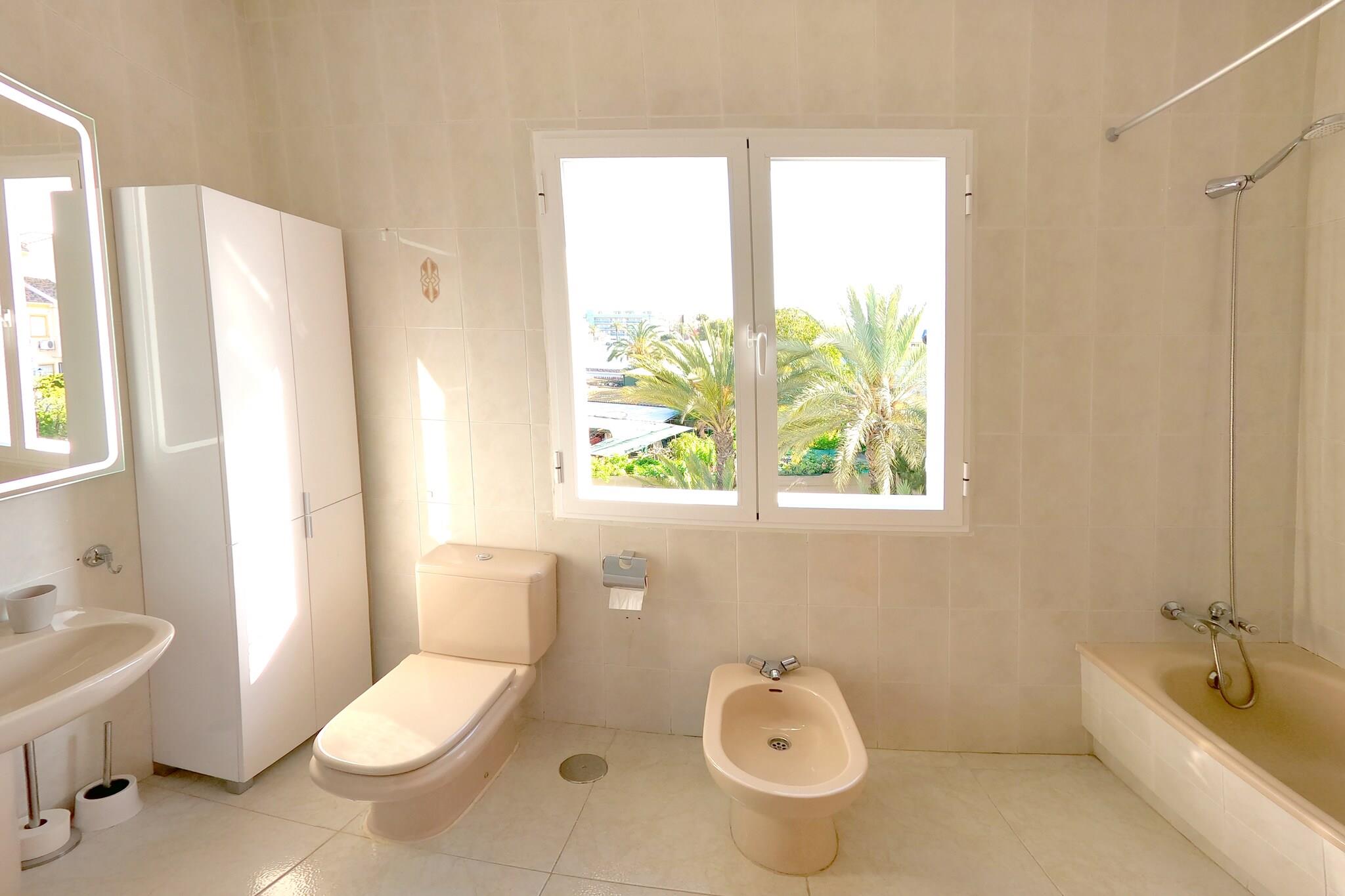 Første etasje: (Stue(TV, dekorativ peis, sittehjørne, klimaanlegg), åpent kjøkken(komfyr med kokeplater(keramisk), vannkoker, kaffetrakter(kaffepute), stekovn, mikrobølgeovn, kjøleskap med fryser), WC(toalett)) i 2. etasje: (soveværelse(dobbeltseng, balkon, klimaanlegg), soveværelse(dobbeltseng, klimaanlegg), bad(dusj(Frittstående dusj), håndvask, toalett)) i 3. etasje: (soveværelse(dobbeltseng, balkon, klimaanlegg), bad(badekar med dusj, håndvask, toalett, bidet)) vaskemaskin, franske dører, hage, hagemøbler, solsenge, grill, Parasoll, svømmebasseng(deles med andre gjester), sykler tilgjengelig, babyseng/sprinkelseng, høy barnestol, strykebrett, strykejern