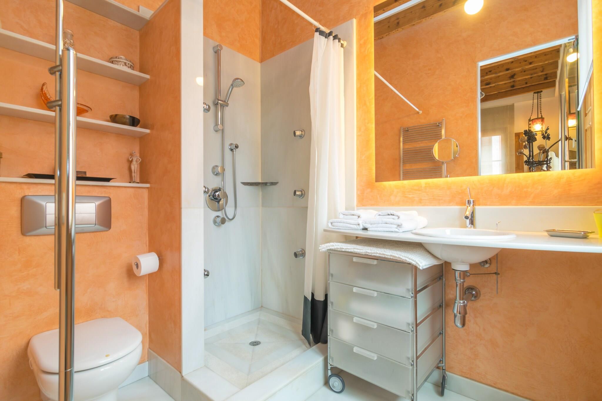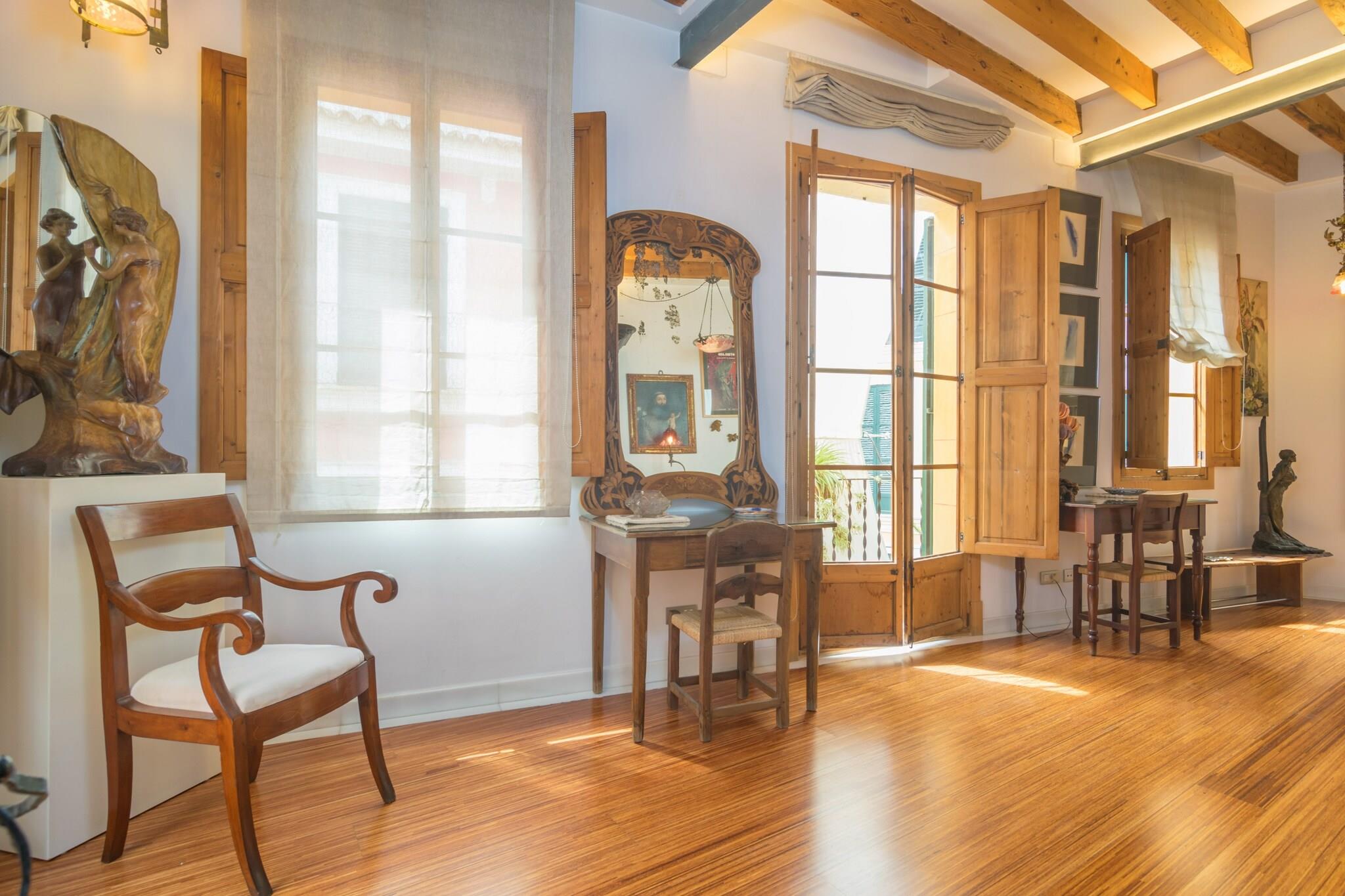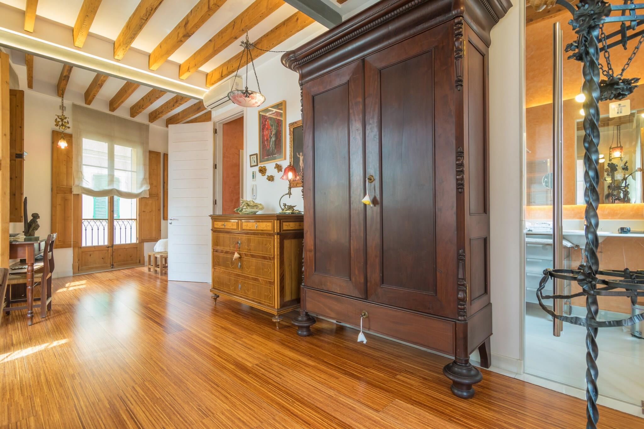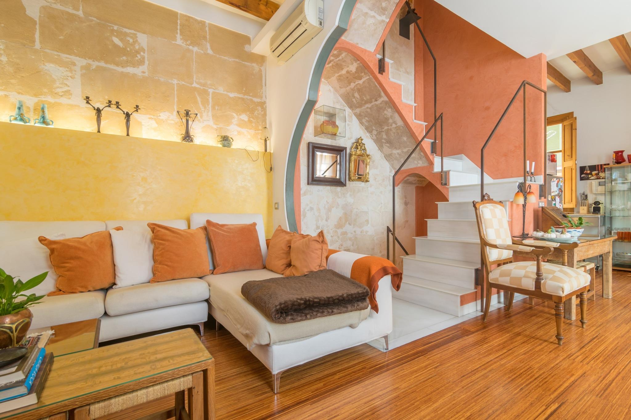 Denne femetasjes boligen ligger i Palmas historiske gamleby, og kombinerer klassisk mallorcansk karakter med moderne innslag. Interiøret er restaurert med omhu, og har varme parkettgulv, elegante antikke detaljer og moderne bekvemmeligheter. Lyse, innbydende rom inviterer deg til å føle deg hjemme, mens den nøye kuraterte designen gir en følelse av raffinement uten å ofre komfort. Hver etasje har blitt gjennomtenkt arrangert for å gi privatliv, bekvemmelighet og en følelse av flyt gjennom hele oppholdet. Stuen i andre etasje har en komfortabel sofa, TV og spiseplass sammen med et muntert kjøkken utstyrt med alt som trengs for å tilberede måltider. To soverom sørger for avslappende netter – ett med to enkeltsenger og eget dusjrom, og et annet med dobbeltseng og eget bad med massasjedusj. Alle rommene har klimaanlegg, og hjemmet inkluderer vaskerom for ekstra enkelhet. Den øvre terrassen er et høydepunkt - perfekt for kaffe ved soloppgang, slappe av i solen eller slappe av ved solnedgang med et glass vin. Et lite andre kjøkken er også tilgjengelig for lette forfriskninger. Gå ut og fordyp deg i sjarmen til Palma. I løpet av få minutter finner du travle kafeer, lokale butikker, isbarer og innbydende tapasrestauranter langs de trange gatene. Strandpromenaden og Playa de Palma-stranden ligger bare 1,3 km unna, mens fergehavnen, golfbanene og flyplassen er lett tilgjengelige.
