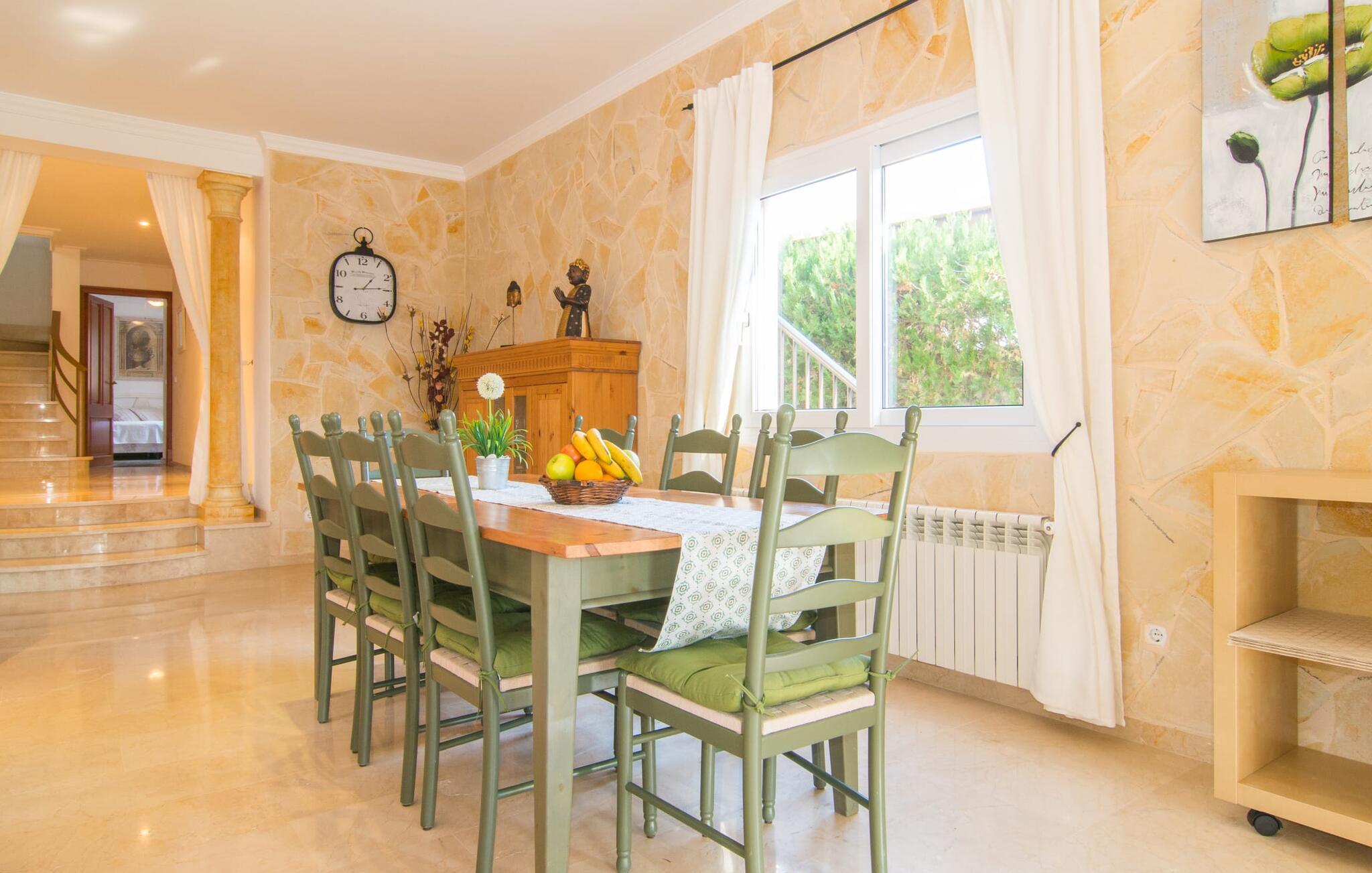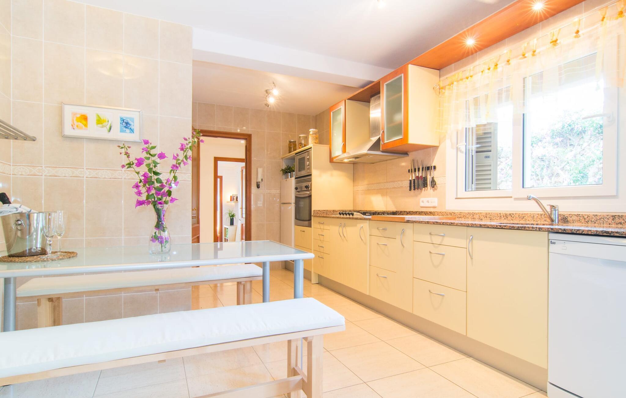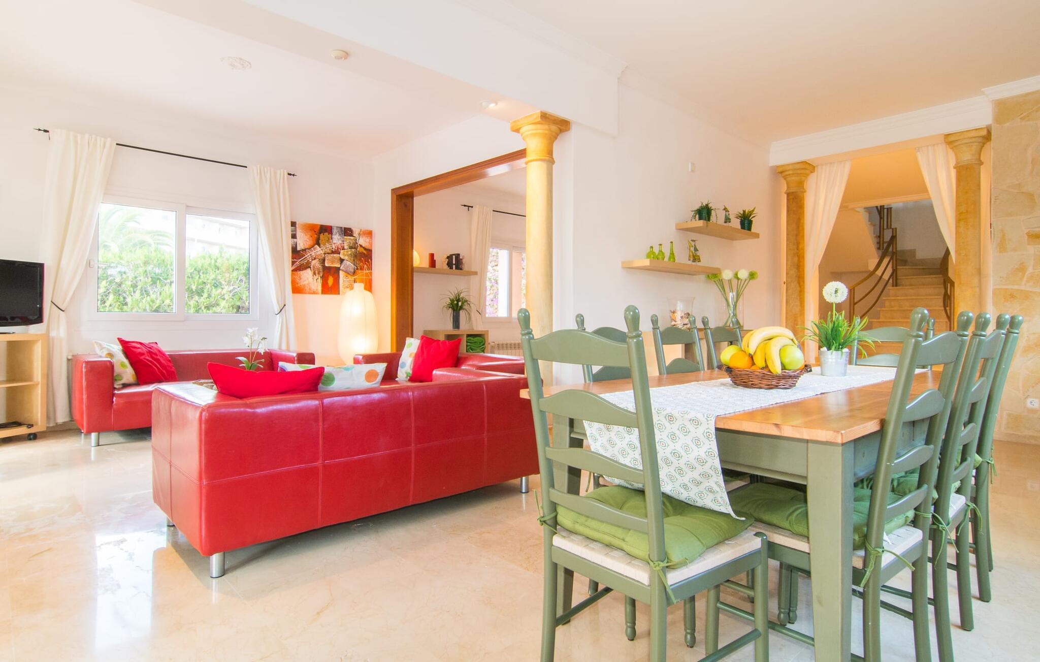 Når du kommer inn i huset, er det fargerikt, lyst og litt gresk - nei, du er ikke i feil land, Villa Palmas ligger definitivt på Mallorca. I første etasje gir jordbærrøde utkragede stoler ved peisen og komfortable skinnsofaer rundt TV-en en sterk fargeaksent foran hvite voilégardiner. Søyler fungerer som subtile romdelere, og en steinmosaikkvegg danner bakteppet for den innbydende spiseplassen. Denne blandingen av stilarter utstråler en middelhavssmak samtidig som den skaper et moderne uttrykk. Kjøkkenet er også topp utstyrt og moderne: det perfekte stedet for morgenkaffen eller for en prat med kokken mens han/hun rører i grytene. En intern trapp (eller den eksterne trappen for natteravner) fører til de tre soverommene i første etasje, hvorav noen har utgang til balkongterrassen. Det er et fjerde soverom i første etasje. Du vil bli glad for å vite at alle soverommene har eget bad. Et ekstra gjestetoalett sørger for størst mulig privatliv. To av soverommene har også en ekstra seng, egnet for barn. Og nå som du har sett Villa Palmas på sitt beste, er du klar til å utforske øyas mørkere sider.