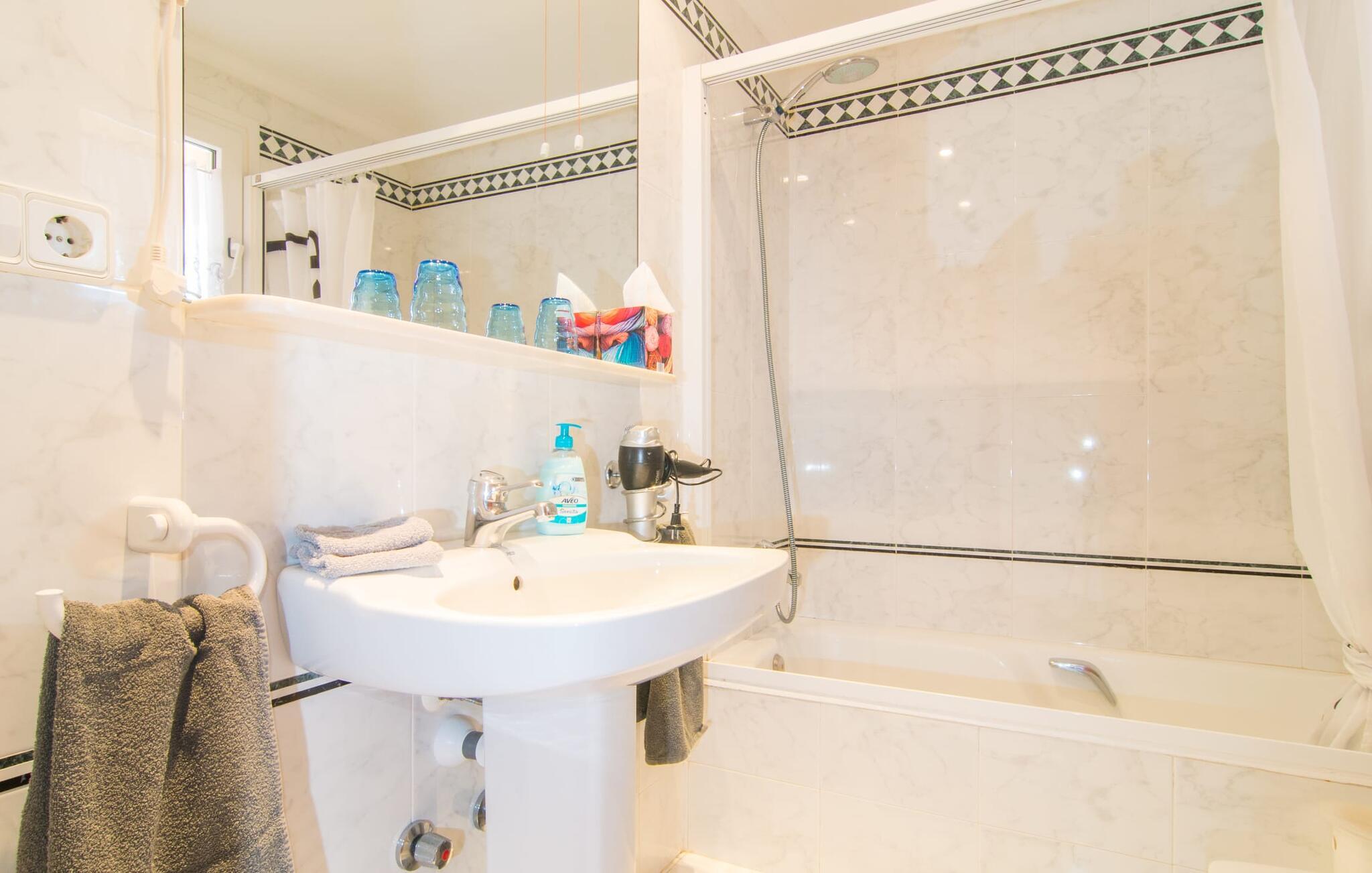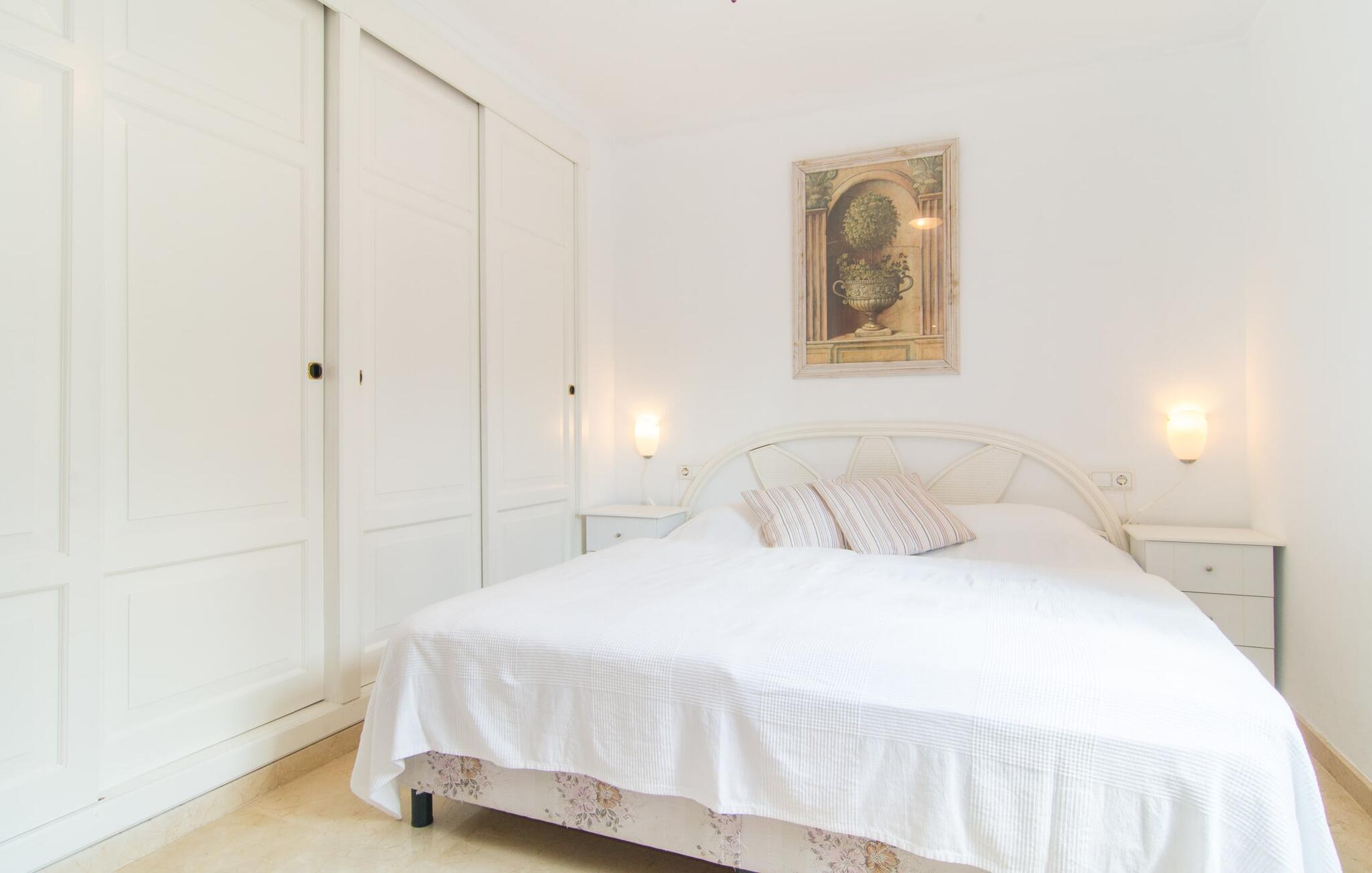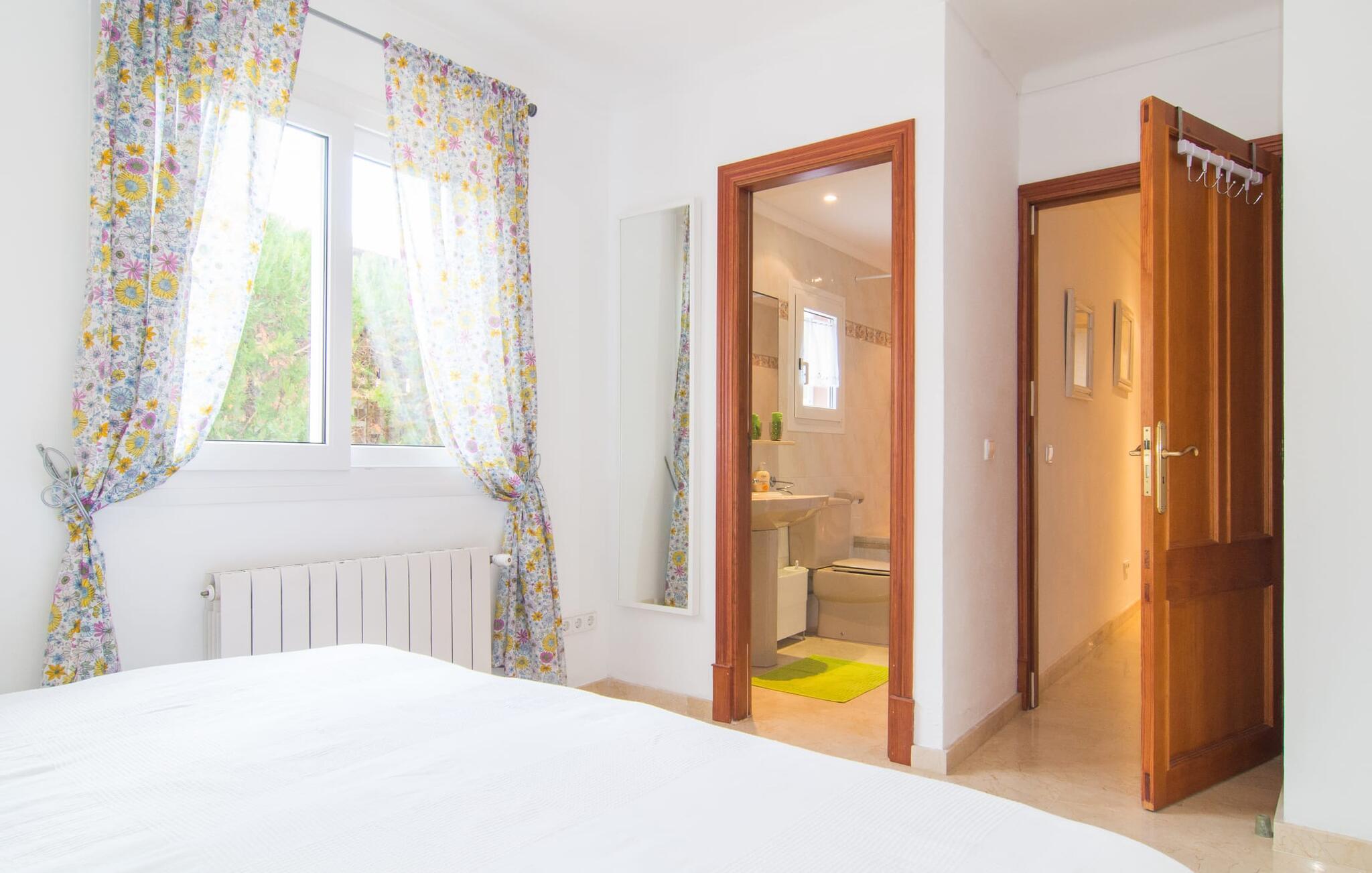 Når du kommer inn i huset, er det fargerikt, lyst og litt gresk - nei, du er ikke i feil land, Villa Palmas ligger definitivt på Mallorca. I første etasje gir jordbærrøde utkragede stoler ved peisen og komfortable skinnsofaer rundt TV-en en sterk fargeaksent foran hvite voilégardiner. Søyler fungerer som subtile romdelere, og en steinmosaikkvegg danner bakteppet for den innbydende spiseplassen. Denne blandingen av stilarter utstråler en middelhavssmak samtidig som den skaper et moderne uttrykk. Kjøkkenet er også topp utstyrt og moderne: det perfekte stedet for morgenkaffen eller for en prat med kokken mens han/hun rører i grytene. En intern trapp (eller den eksterne trappen for natteravner) fører til de tre soverommene i første etasje, hvorav noen har utgang til balkongterrassen. Det er et fjerde soverom i første etasje. Du vil bli glad for å vite at alle soverommene har eget bad. Et ekstra gjestetoalett sørger for størst mulig privatliv. To av soverommene har også en ekstra seng, egnet for barn. Og nå som du har sett Villa Palmas på sitt beste, er du klar til å utforske øyas mørkere sider.