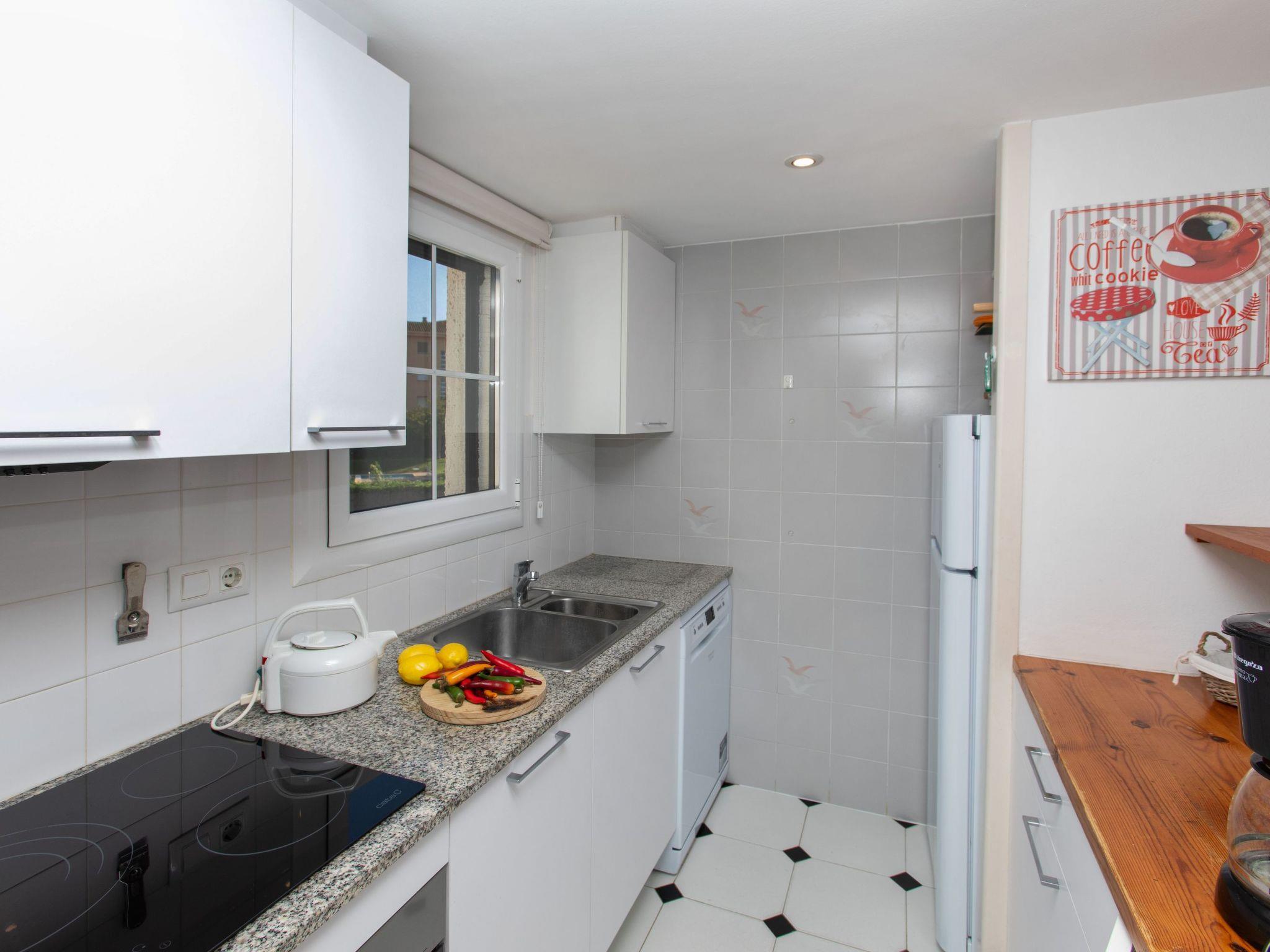 "Ducado de Golf Blue", 2-room apartment 65 m2 on 1st floor. Object suitable for 4 adults. Practical furnishings: living/dining room, on 2 levels with dining table, digital TV, flat screen and air conditioning. Exit to the terrace. 1 room with 1 french bed (160 cm, length 190 cm). 1 room with 2 beds (90 cm, length 190 cm). Open kitchen (oven, dishwasher, 4 ceramic glass hob hotplates, toaster, kettle, microwave, freezer, electric coffee machine). Bath/WC. No heating option. Terrace. Terrace furniture. View of the swimming pool. Facilities: washing machine, iron, children's high chair, baby cot, hair dryer. Internet (WiFi, free). Parking. Please note: TV only ES. HUTG-026042 // Reg. Nr.: ESFCTU00001700700012133900000000000000000HUTG-0260429