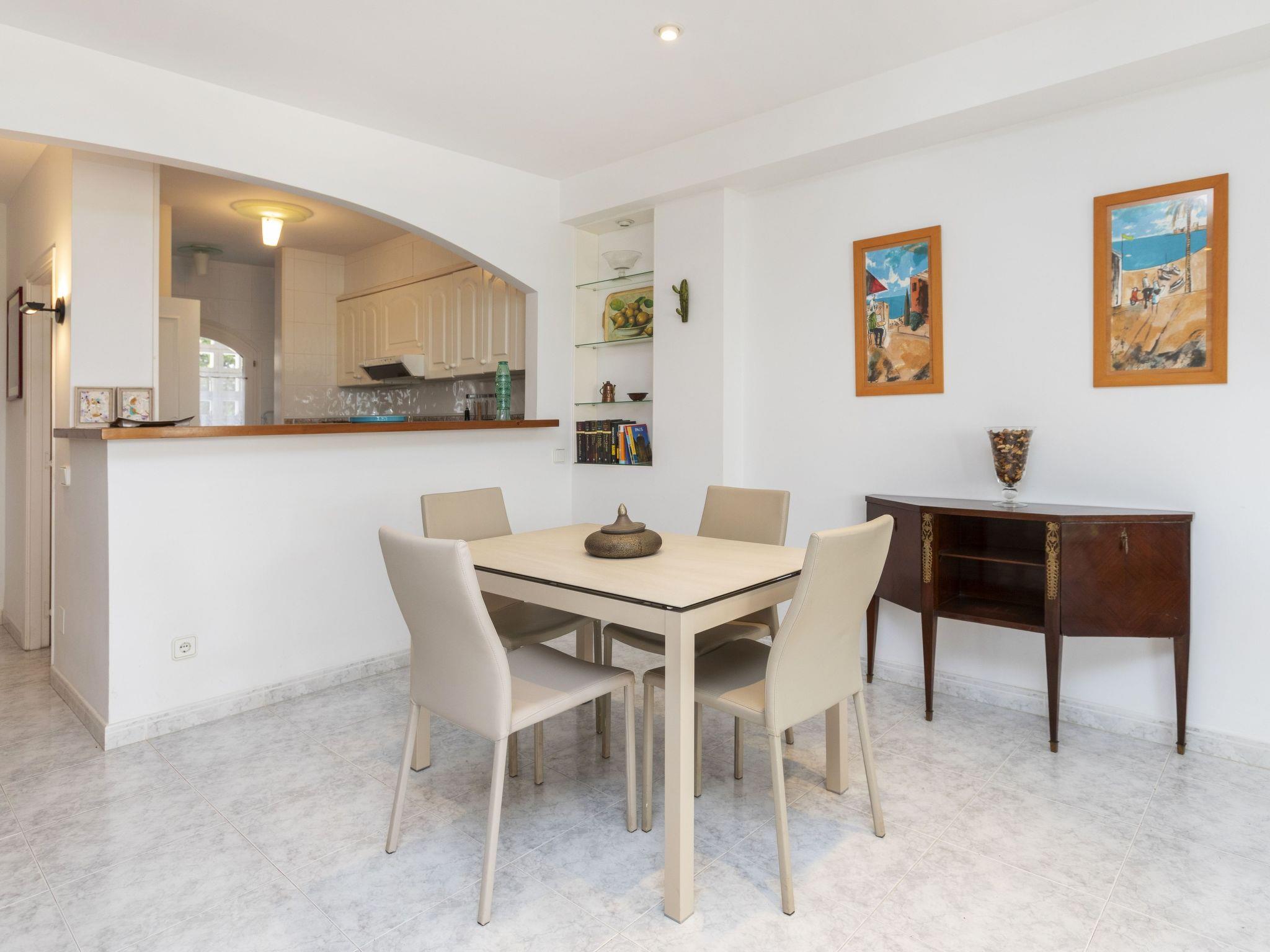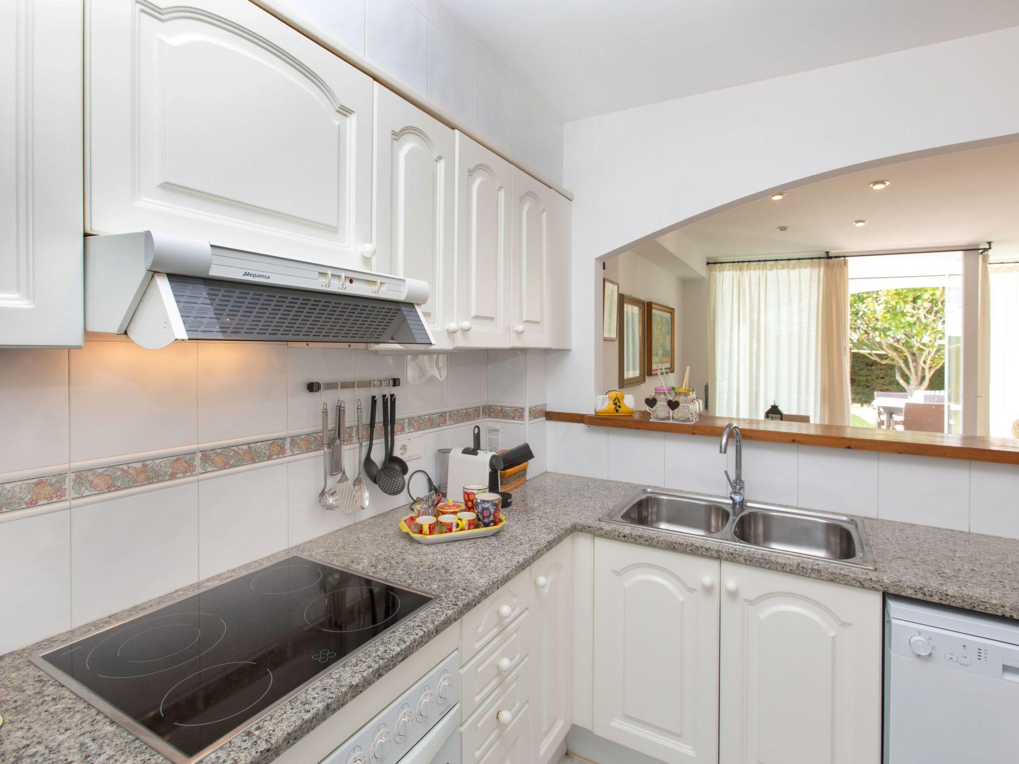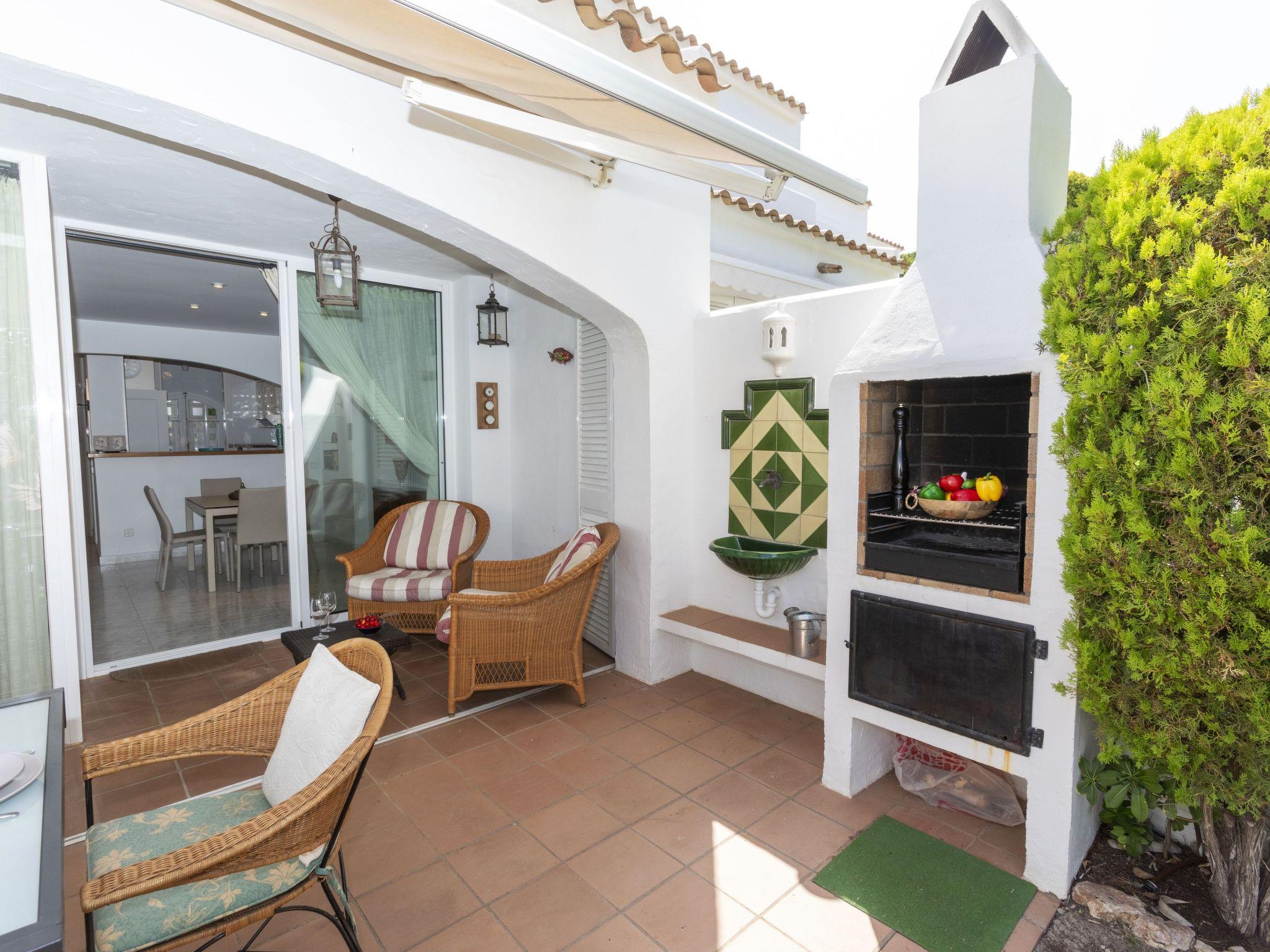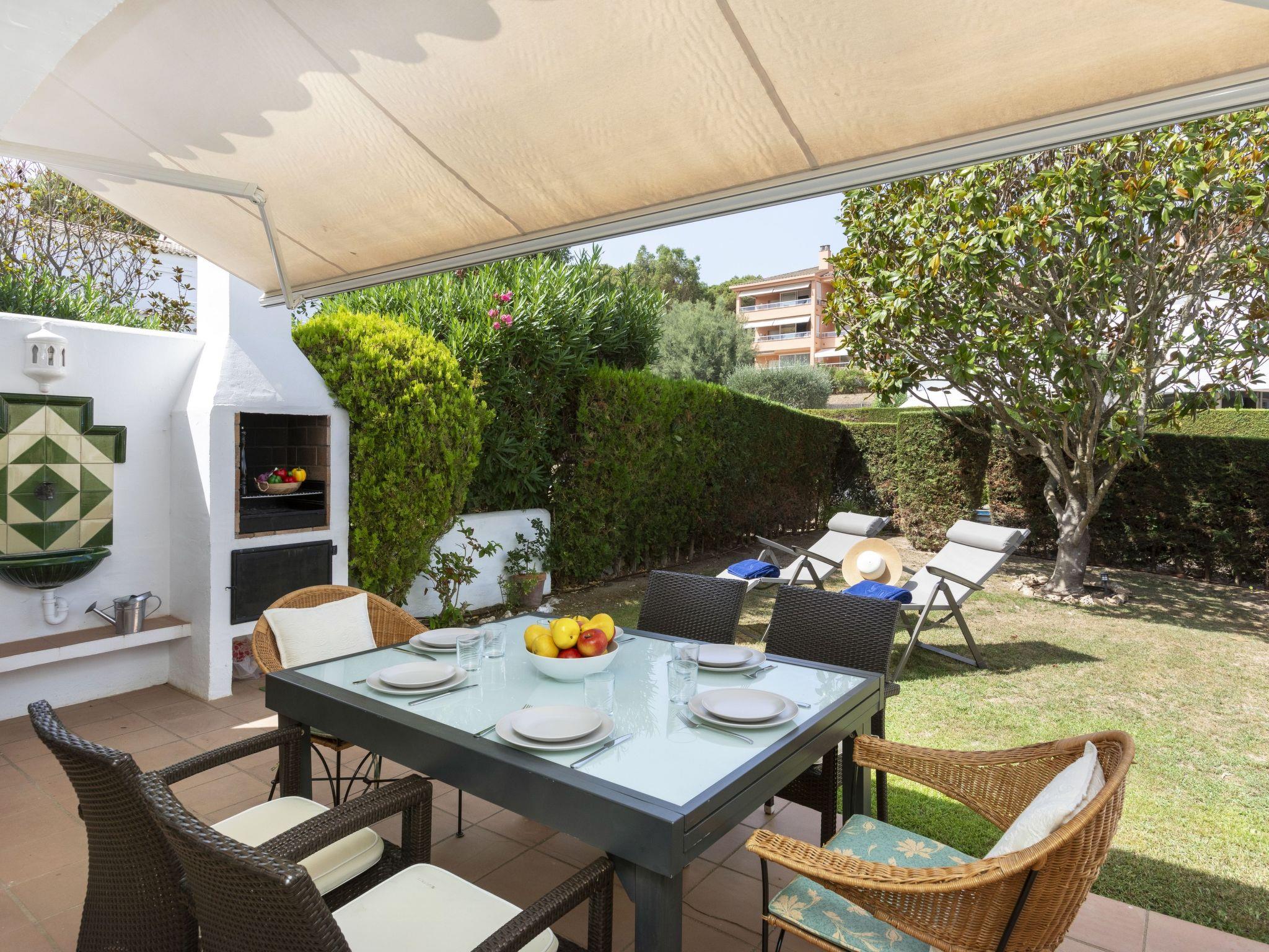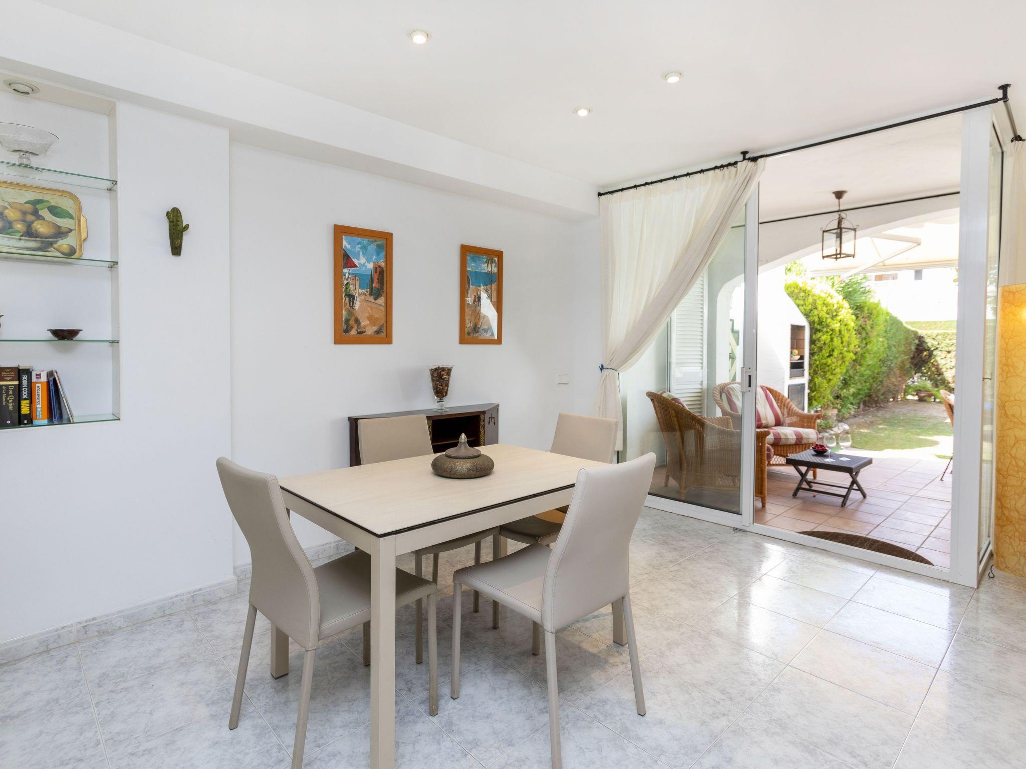 "Reserva V", 4-room terraced house 120 m2 on 2 levels. Practical and comfortable furnishings: living/dining room with digital TV. Exit to the patio. Open kitchen (oven, dishwasher, 4 ceramic glass hob hotplates, microwave, electric coffee machine) with hatch. Sep. WC. No heating option. Upper floor: 1 room with 1 french bed (135 cm, length 190 cm), shower/WC. 1 room with 2 beds (90 cm, length 190 cm). 1 children's room with 1 pull-out bed (2 pers. 2 x 85 cm, length 185 cm). Shower/WC. Very beautiful view of the garden. Facilities: washing machine, iron, children's high chair, baby cot for up to 2 year olds, hair dryer. Internet (WiFi). Parking at the house. Please note: suitable for families. TV only ES. HUTG-061962 // Reg. Nr.: ESFCTU00001700700016407700000000000000000HUTG-0619629