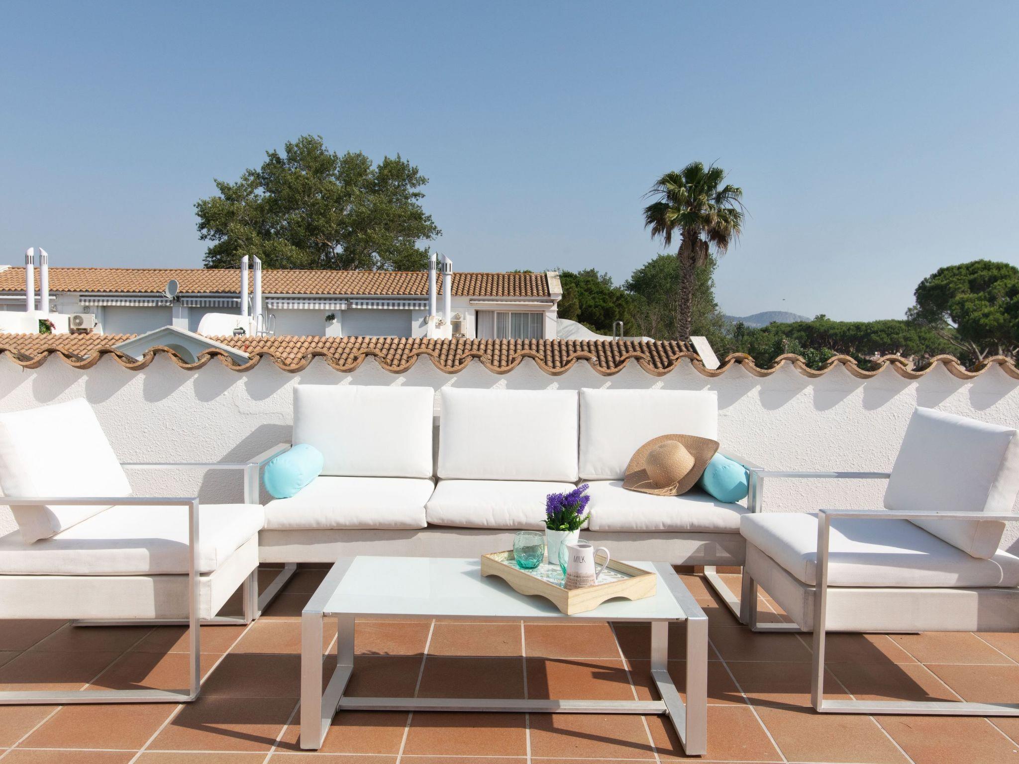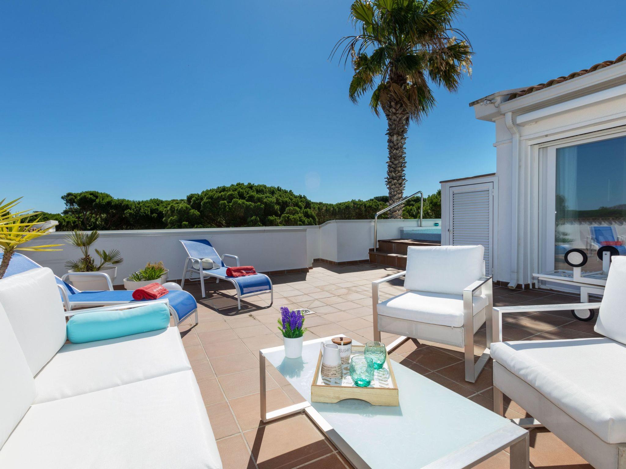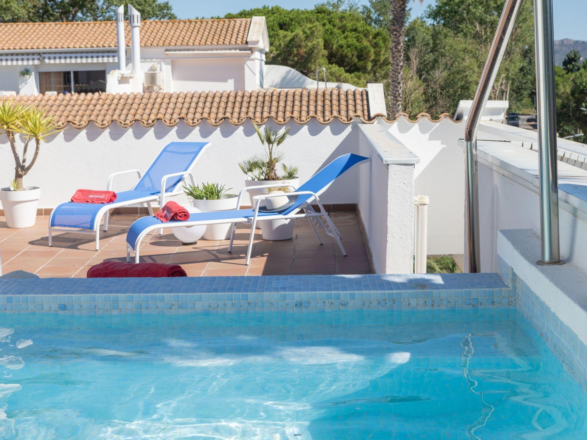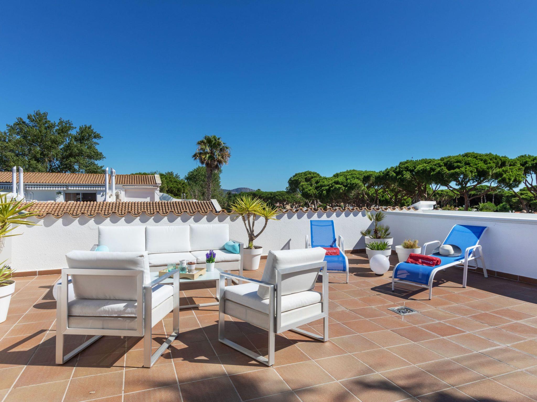 "Green Club Duplex", 3-room penthouse 105 m2 on 2 levels on 2nd floor. Fully renovated: living/dining room with air conditioning. Exit to the terrace. 1 room with 1 pull-out bed (2 x 80 cm, length 190 cm). 1 room with 2 beds (80 cm, length 190 cm). Kitchen (oven, dishwasher, 5 induction hot plates, toaster, kettle, microwave, freezer, grill, electric coffee machine) with electric heating. Shower/WC. Upper floor: 1 room with Dressing room with 1 french bed (150 cm, length 190 cm), bath/WC. Exit to the terrace, to the swimming pool. Large terrace. Terrace furniture, deck chairs (2). View of the countryside. Facilities: washing machine, dryer, iron, children's high chair, baby cot, hair dryer. Internet (WiFi, free). Parking. Please note: suitable for families. TV only ES. HUTG-063393 // Reg. Nr.: ESFCTU00001700700010157700000000000000000HUTG-0633935