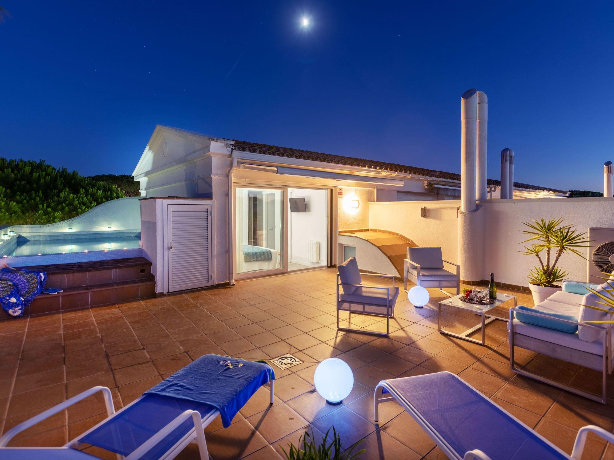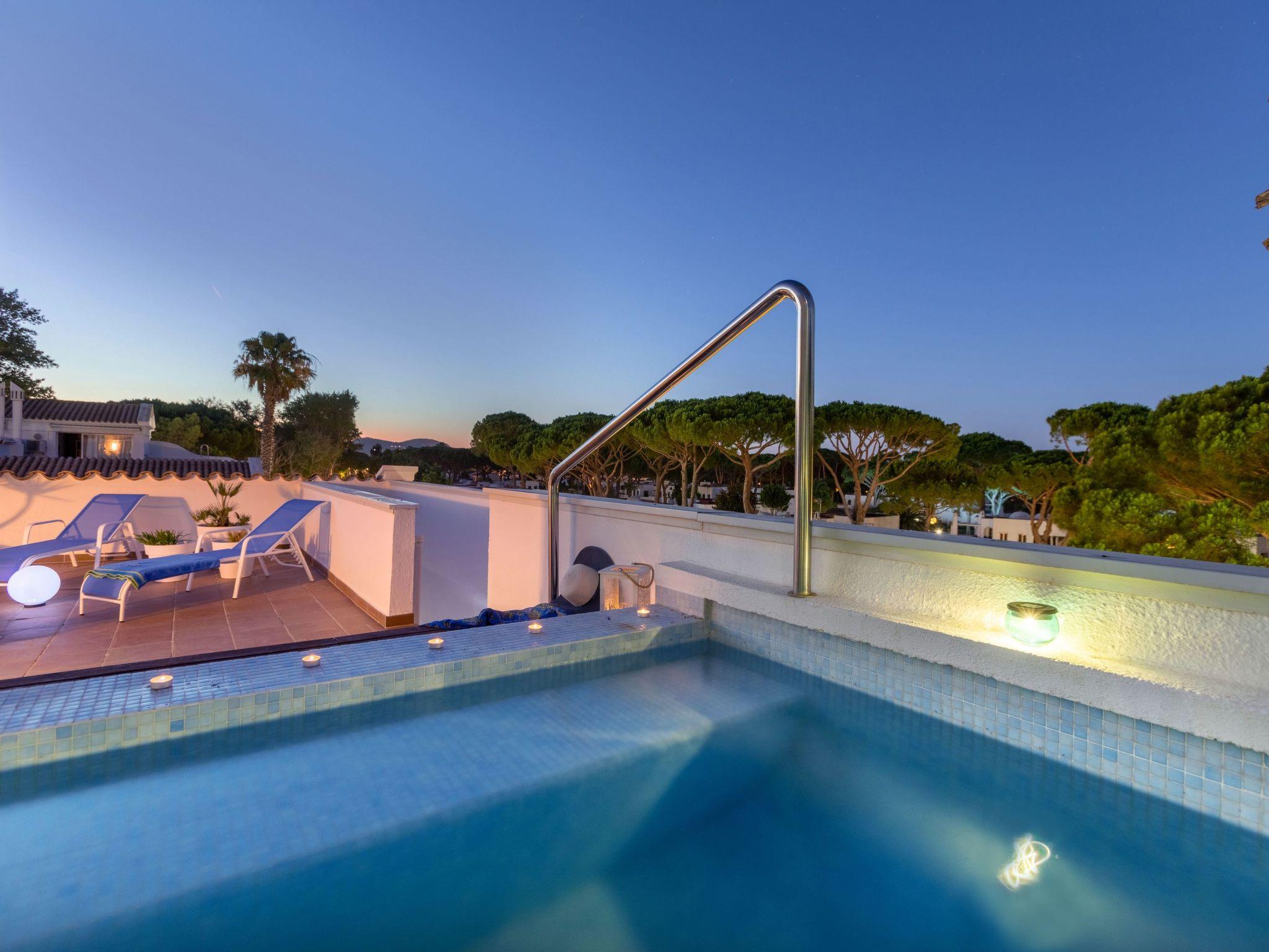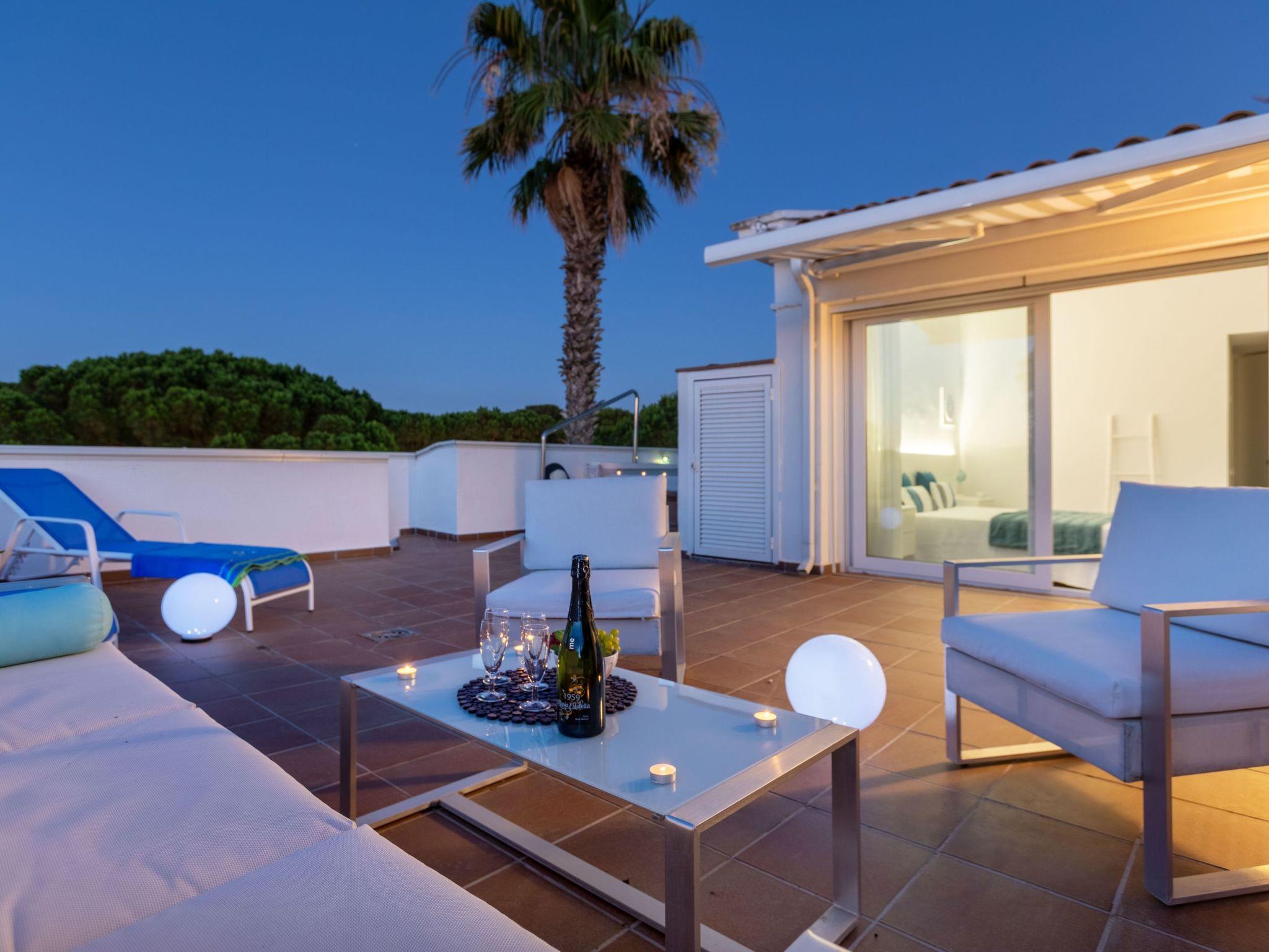 "Green Club Duplex", 3-room penthouse 105 m2 on 2 levels on 2nd floor. Fully renovated: living/dining room with air conditioning. Exit to the terrace. 1 room with 1 pull-out bed (2 x 80 cm, length 190 cm). 1 room with 2 beds (80 cm, length 190 cm). Kitchen (oven, dishwasher, 5 induction hot plates, toaster, kettle, microwave, freezer, grill, electric coffee machine) with electric heating. Shower/WC. Upper floor: 1 room with Dressing room with 1 french bed (150 cm, length 190 cm), bath/WC. Exit to the terrace, to the swimming pool. Large terrace. Terrace furniture, deck chairs (2). View of the countryside. Facilities: washing machine, dryer, iron, children's high chair, baby cot, hair dryer. Internet (WiFi, free). Parking. Please note: suitable for families. TV only ES. HUTG-063393 // Reg. Nr.: ESFCTU00001700700010157700000000000000000HUTG-0633935