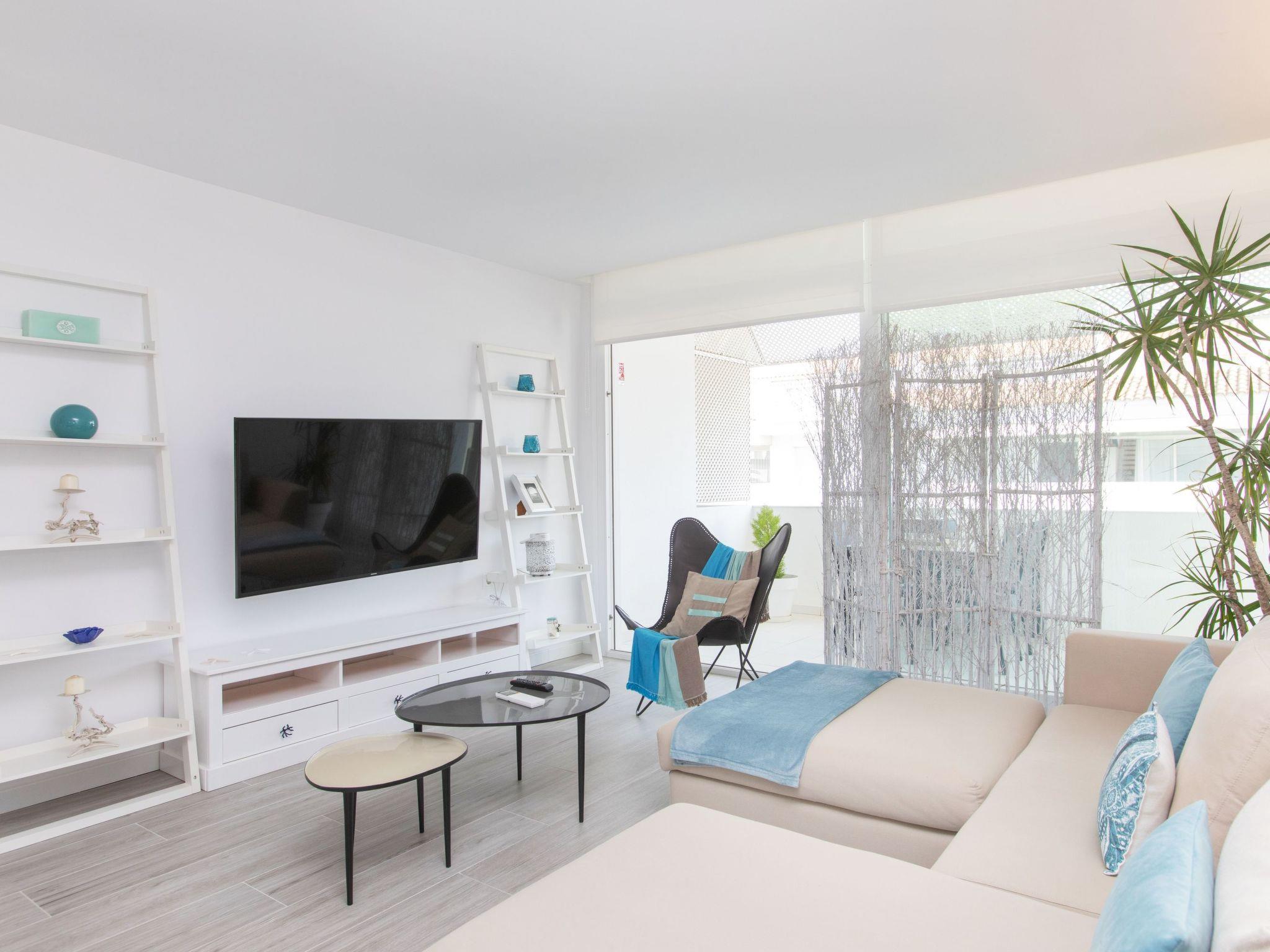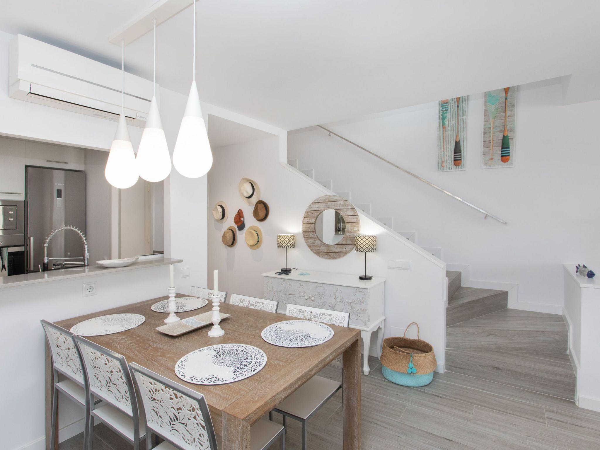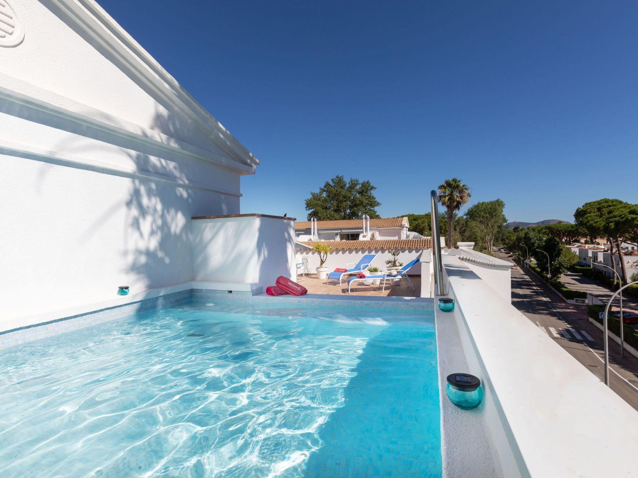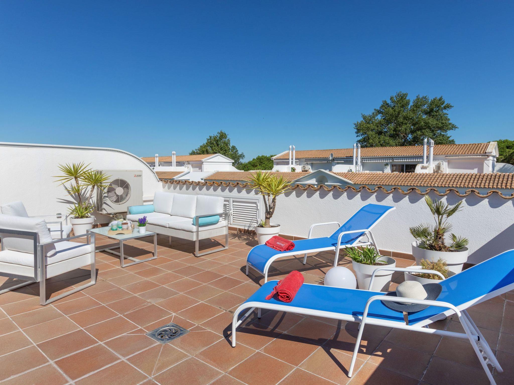 "Green Club Duplex", 3-room penthouse 105 m2 on 2 levels on 2nd floor. Fully renovated: living/dining room with air conditioning. Exit to the terrace. 1 room with 1 pull-out bed (2 x 80 cm, length 190 cm). 1 room with 2 beds (80 cm, length 190 cm). Kitchen (oven, dishwasher, 5 induction hot plates, toaster, kettle, microwave, freezer, grill, electric coffee machine) with electric heating. Shower/WC. Upper floor: 1 room with Dressing room with 1 french bed (150 cm, length 190 cm), bath/WC. Exit to the terrace, to the swimming pool. Large terrace. Terrace furniture, deck chairs (2). View of the countryside. Facilities: washing machine, dryer, iron, children's high chair, baby cot, hair dryer. Internet (WiFi, free). Parking. Please note: suitable for families. TV only ES. HUTG-063393 // Reg. Nr.: ESFCTU00001700700010157700000000000000000HUTG-0633935