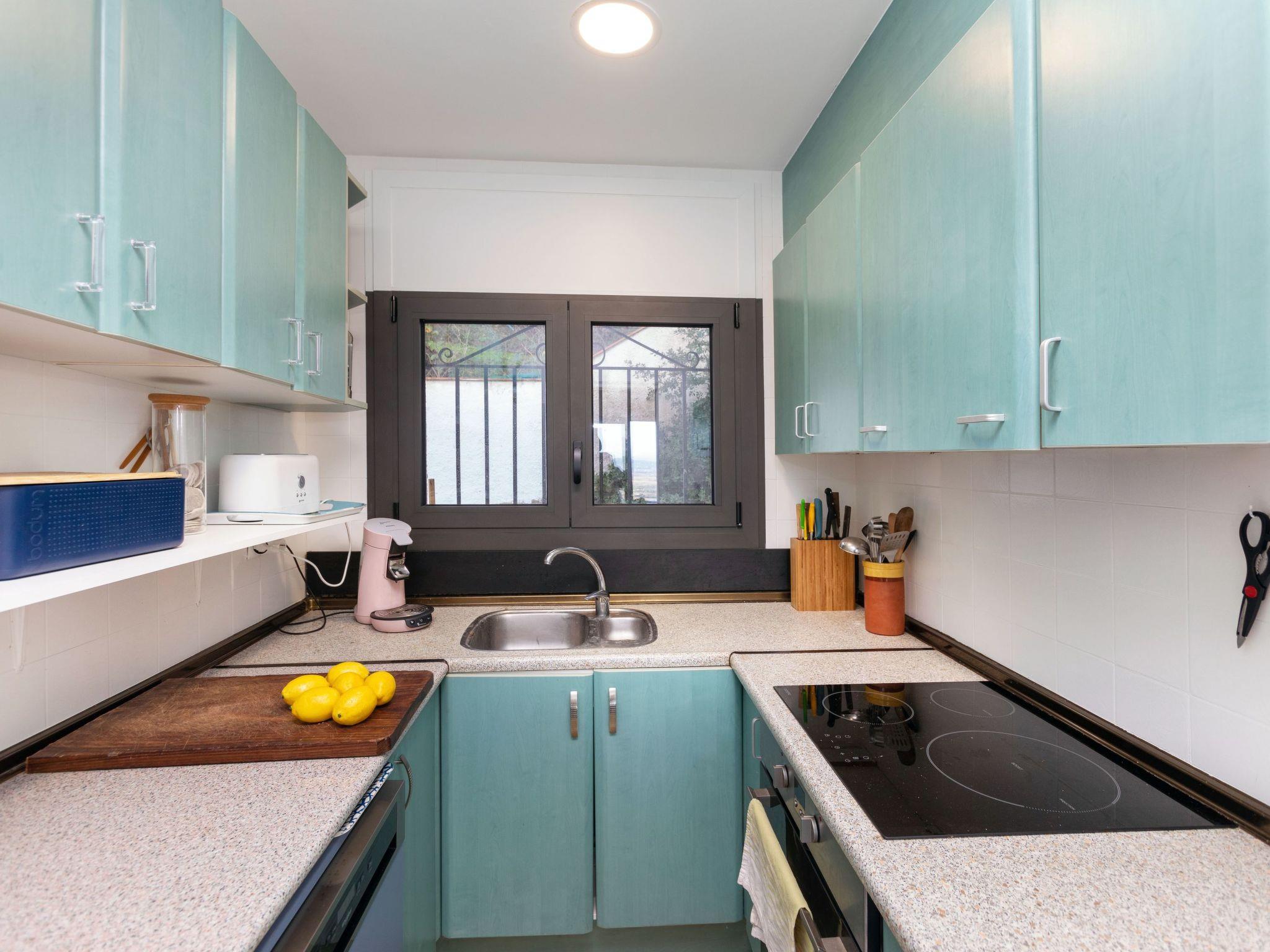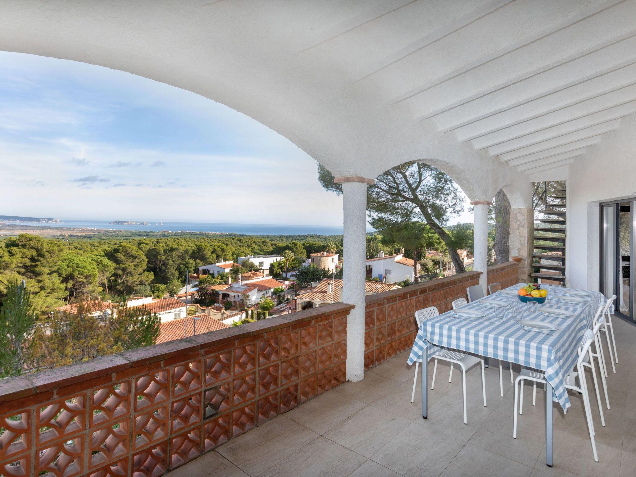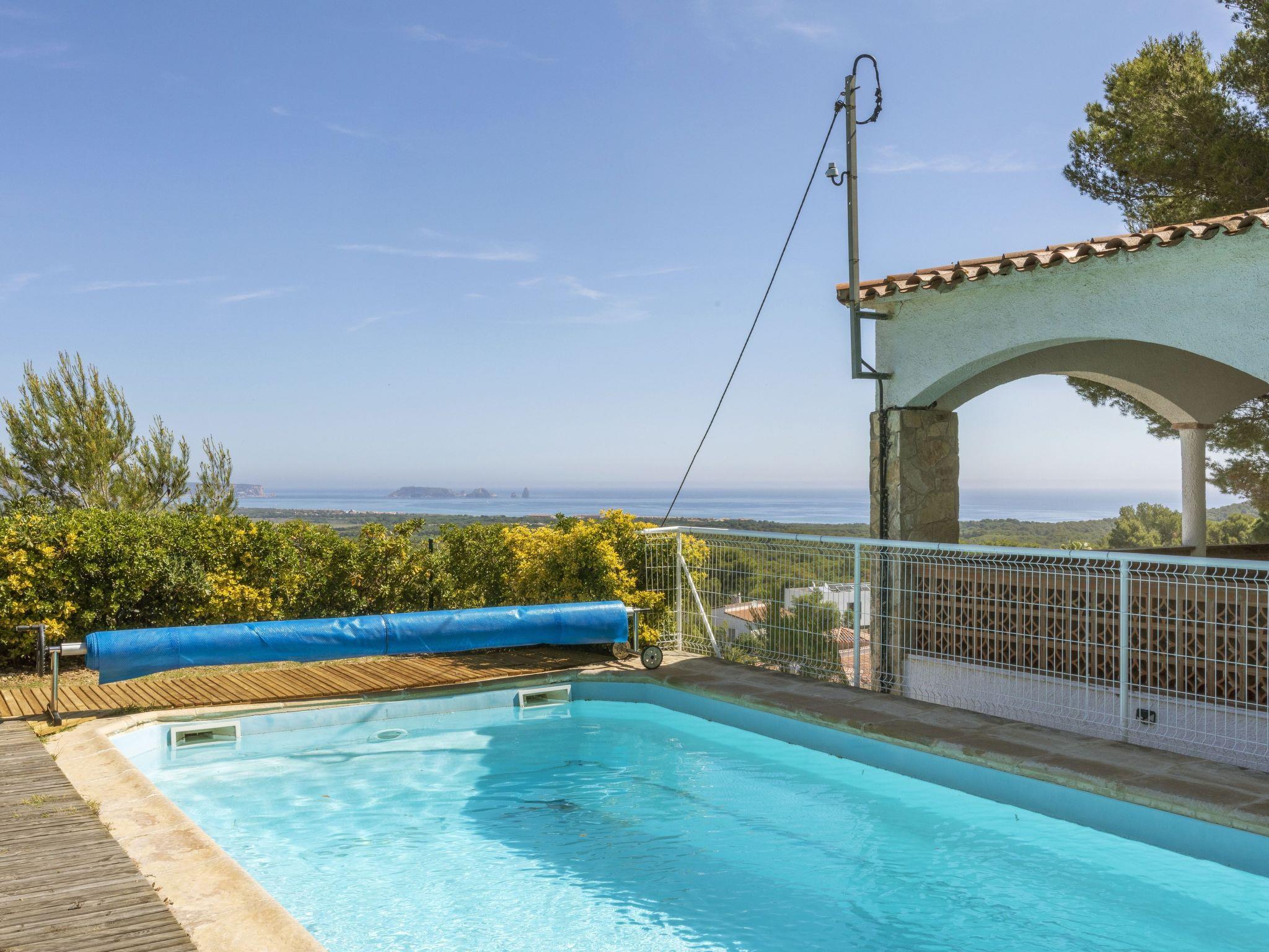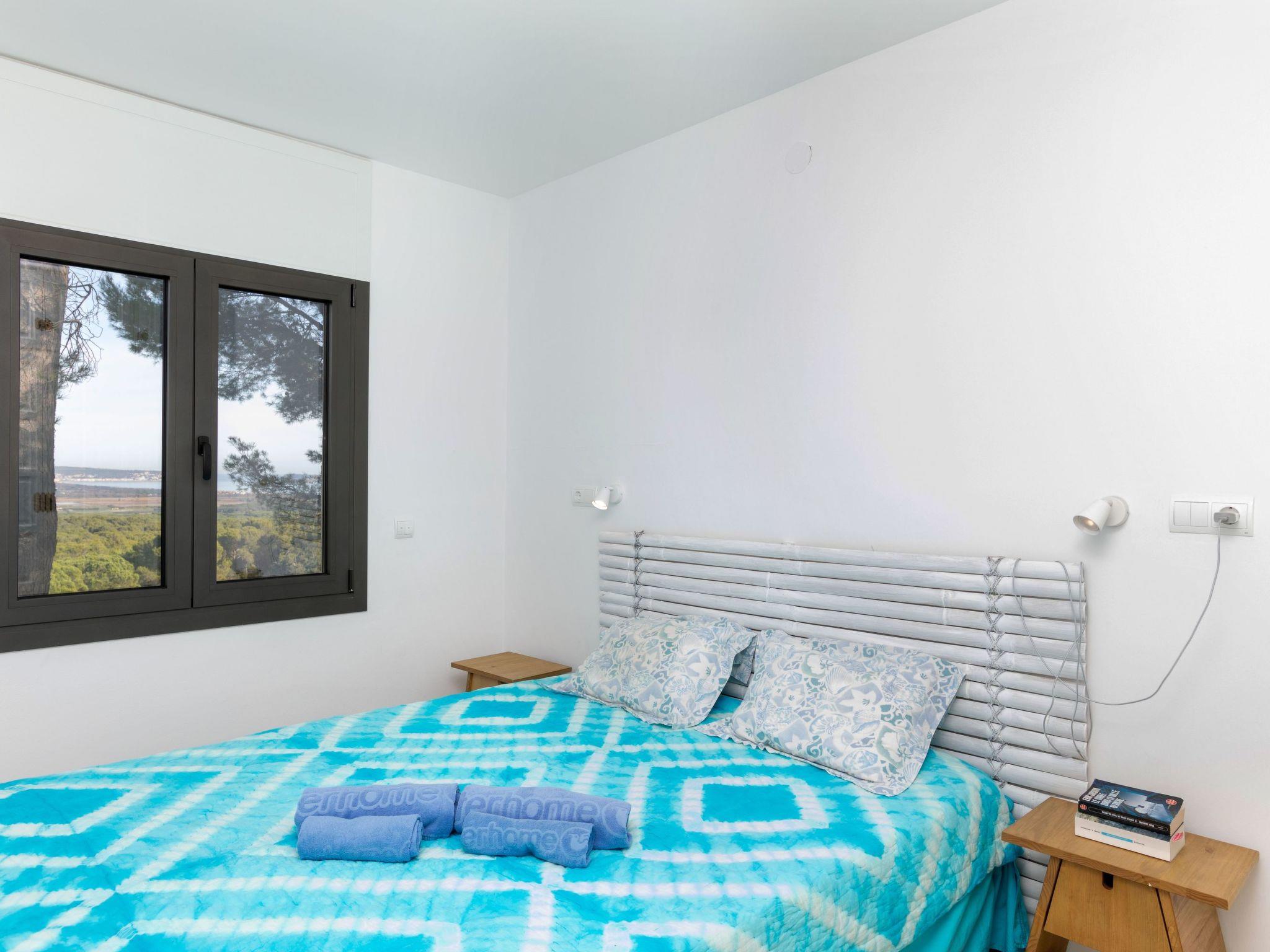 "Can Delmas", 4-room house 100 m2, on the upper floor. Practical furnishings: living/dining room with digital TV and air conditioning. Exit to the garden, to the terrace, to the swimming pool. 2 rooms, each room with 1 french bed (160 cm, length 190 cm), air conditioning. 1 room with 1 x 2 bunk beds (90 cm, length 190 cm), air conditioning. Kitchen (oven, dishwasher, 3 induction hot plates, toaster, kettle, microwave, freezer, electric coffee machine). 2 showers/WC. No heating option. Terrace furniture, deck chairs. Very beautiful view of the sea, the countryside and the resort. Facilities: washing machine, children's high chair, baby cot, hair dryer. Internet (WiFi, free). HUTG-065904 // Reg. Nr.: ESFCTU00001700700000601800000000000000000HUTG-0659045