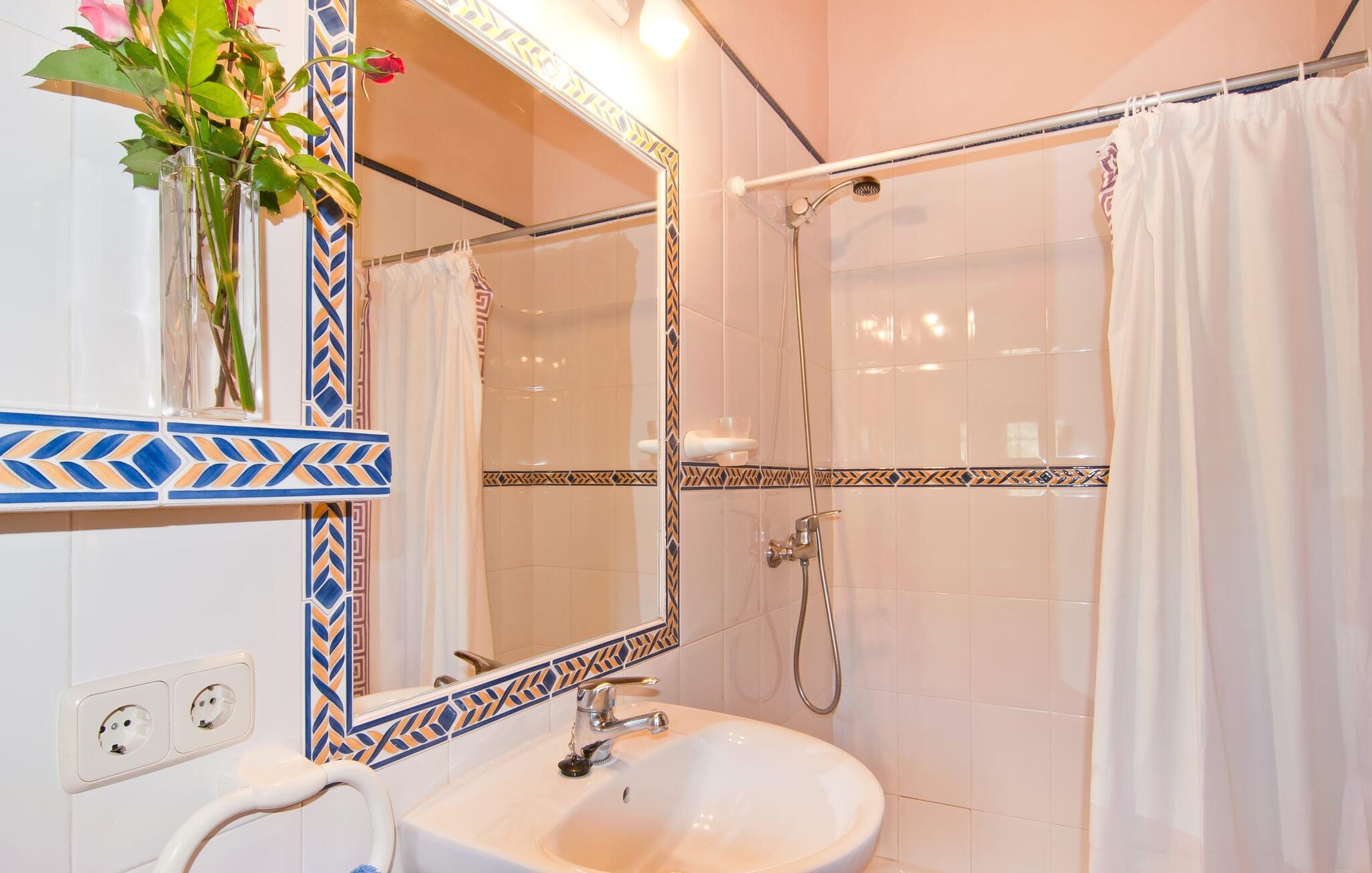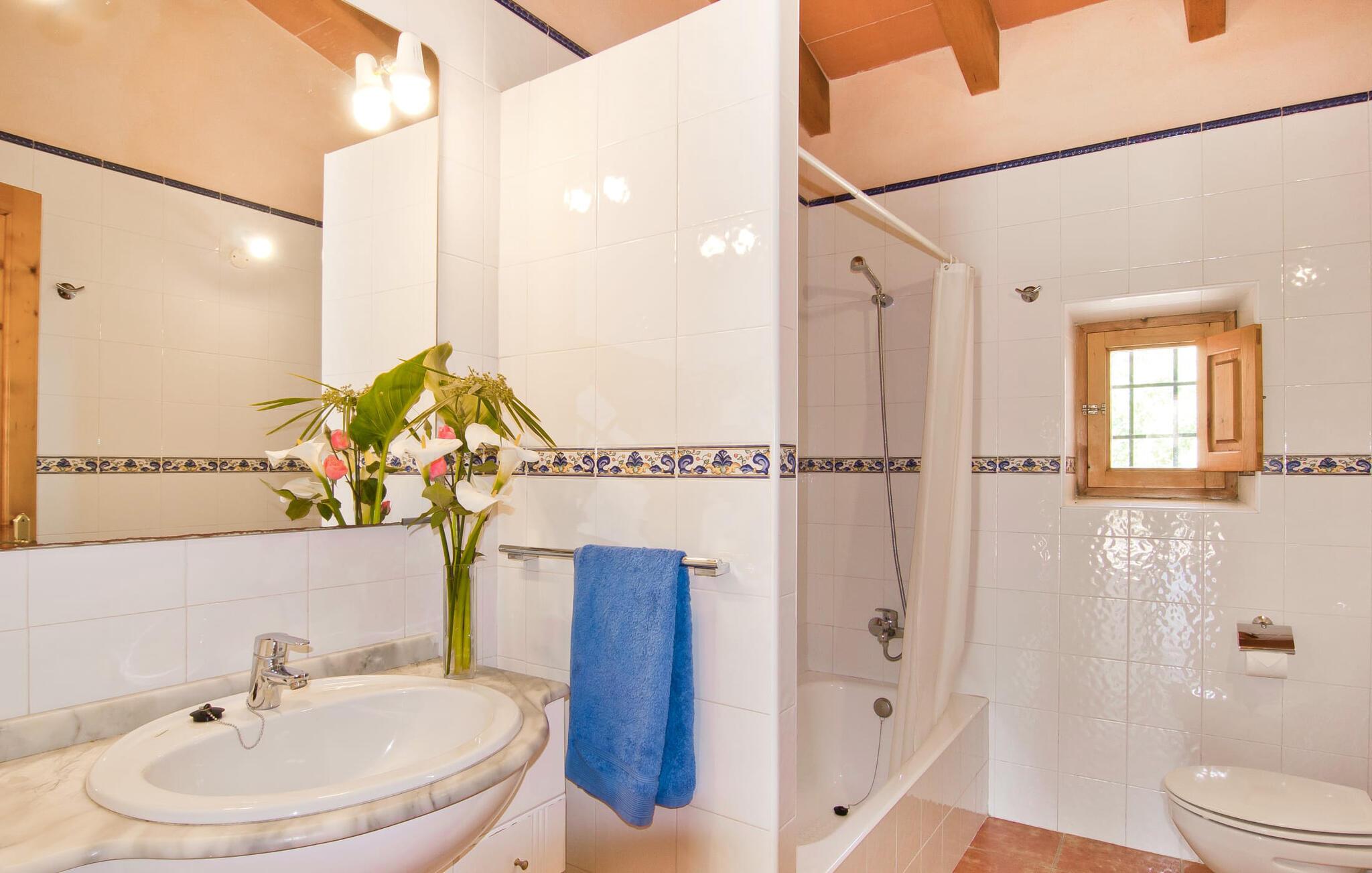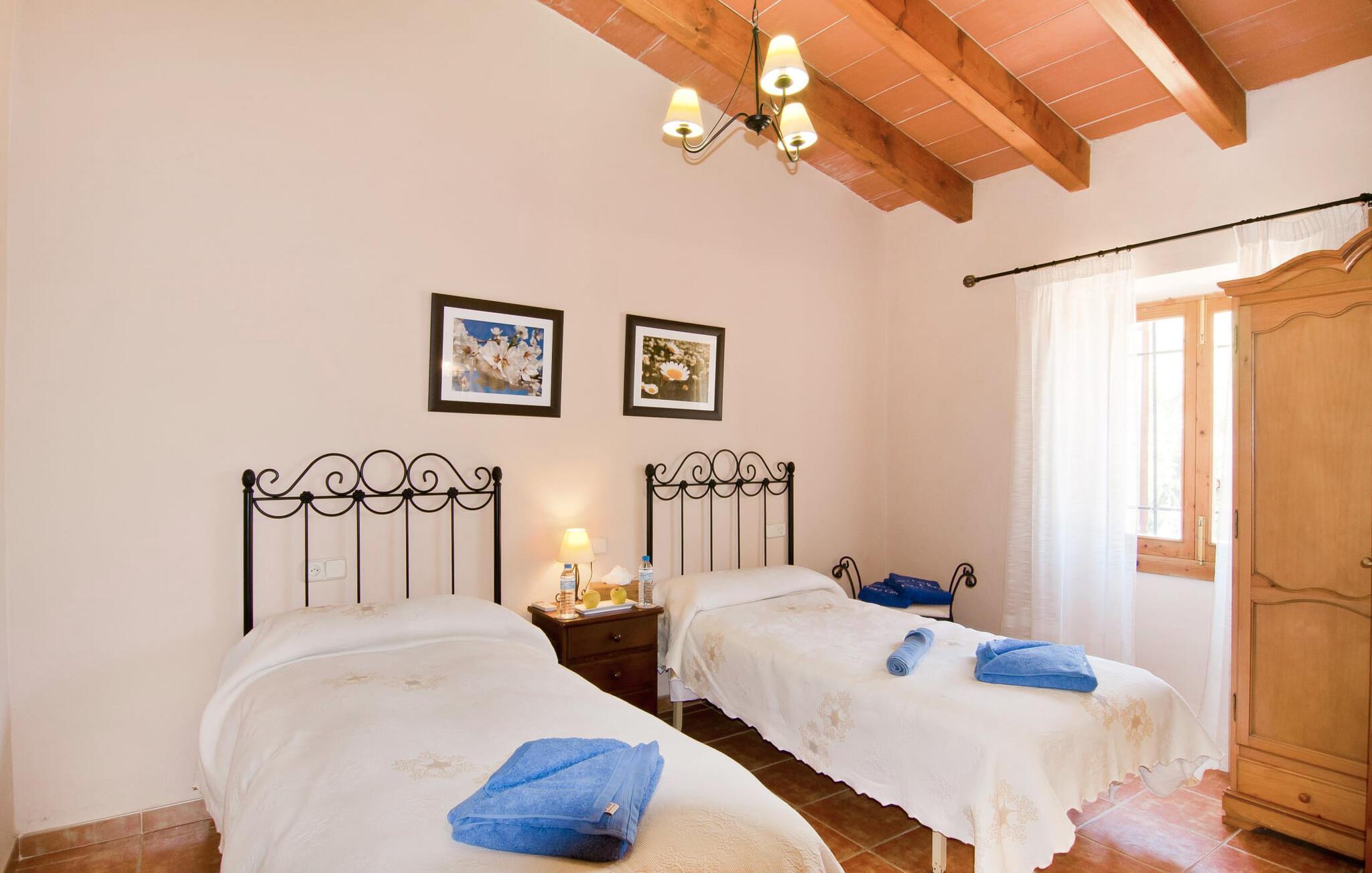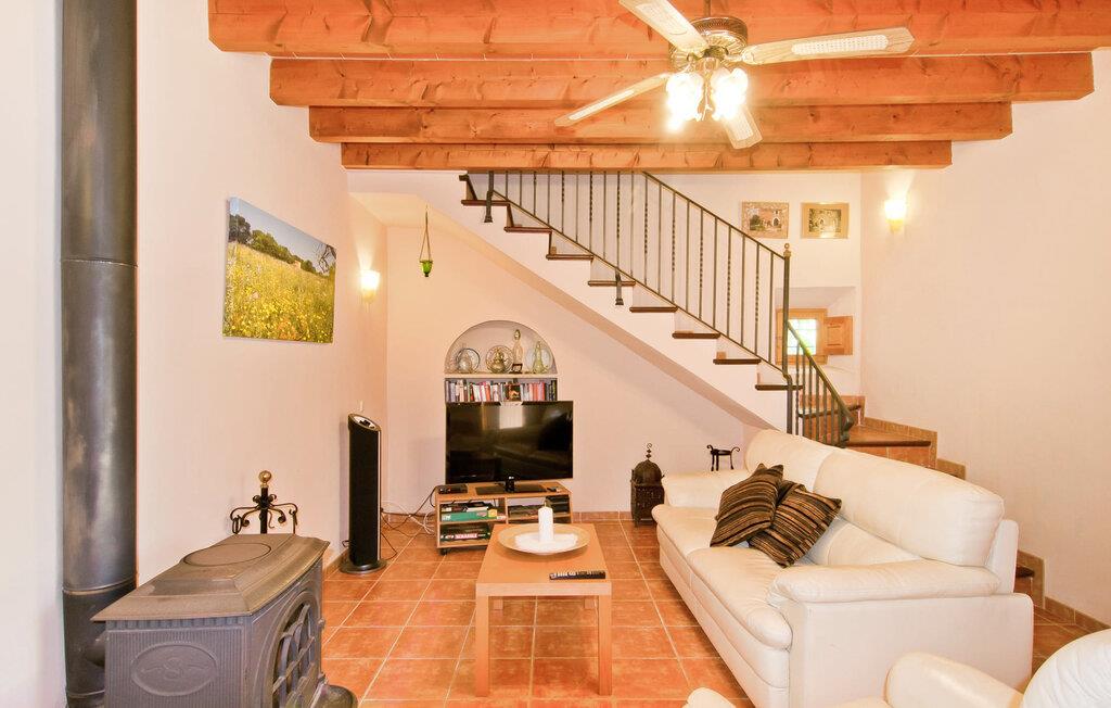 Huset er sørvendt og utvendig kledd med den tradisjonelle steinbruddssteinen i regionen. Nesten alle rommene har synlige takbjelker, typisk for øya, som oppveies perfekt av de vakre flislagte gulvene. Terrassen fører direkte inn i stue/spisestue i første etasje. I hjørnet av rommet, der sofaen og lenestolen er plassert, er også peisen, i hvis varme glød du kan slappe av i timevis, spesielt i de kjøligere månedene. Sammen med sentralvarmen, som også er installert i kjelleren, sørger peisen for at temperaturen her holder seg behagelig selv når det blir kjøligere ute. Hvis du ser forbi spisebordet og skapet i stuen, vil du se kjøkkenet, som er fullt utstyrt med alt du trenger for å drive feriehusholdningen. Hvis du liker å lage mat, vil du trives her. Det er også to soverom og to bad i første etasje, hvorav det ene har eget bad. I andre etasje finner du ytterligere to soverom og det tredje badet. Alle soverommene er utstyrt med klimaanlegg/oppvarming og er vakkert, praktisk og selvfølgelig komfortabelt innredet. Garderobeskapene gir god plass til å oppbevare klærne du har tatt med deg. Rommene er utstyrt med komfortable senger, slik at du har alt du trenger for en god natts søvn. Badene er utstyrt med moderne innredning og er like praktiske som de er elegante. Ett av badene har badekar med hydromassasje. I et lite uthus finner du badstuen, hvor du kan slappe av og skjemme bort kropp og sinn. Det er to terrengsykler til din disposisjon, som du kan bruke til å forbrenne energi mens du utforsker de nærliggende og fjerne omgivelsene. Den velutstyrte Villa Pambola ligger tilbaketrukket på en landlig eiendom øst på øya, rundt tre kilometer fra Cas Concos des Cavaller. Strender og byer øst på øya er innen rekkevidde herfra. Det er mye å gjøre i Manacor, som ikke ligger langt unna, og den offisielle nudiststranden Es Trenc ligger bare en kort kjøretur unna. Noen vakre strender sør på øya ligger bare noen få minutter unna, blant annet strendene i Portopetro og Cala Llombards.