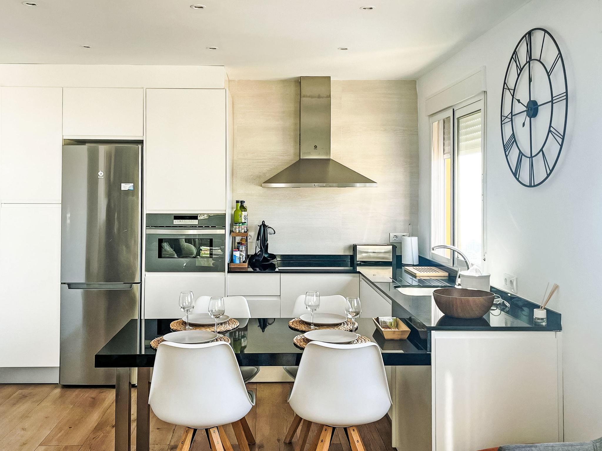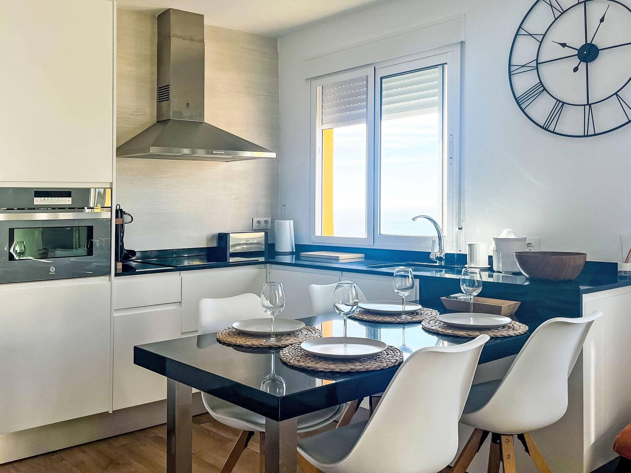 "Mirador de Chopo", 3-room apartment 60 m2 on 2 levels on 2nd floor. Object suitable for 4 adults. Bright, comfortable furnishings: living/dining room with digital TV. Exit to the terrace. Open kitchen (dishwasher, 3 ceramic glass hob hotplates, toaster, microwave, freezer) with bar. Upper floor: 1 room with 1 french bed (1 x 150 cm, length 190 cm), air conditioning and forced-air heating. 1 room with 2 beds (90 cm, length 190 cm), air conditioning and forced-air heating. Shower/WC. Parquet floors. Terrace 12 m2. Terrace furniture. Marvellous panoramic view of the sea, the countryside and the resort. Facilities: washing machine, iron, mosquito net, hair dryer. Internet (WiFi, free). Parking space n 3 (roofed). Please note: non-smokers only. Maximum 1 pet/ dog allowed. TV only ES. No lift. VT-36997-CS // Reg. Nr.: ESFCTU00001200900089548200000000000000000VT-36997-CS6