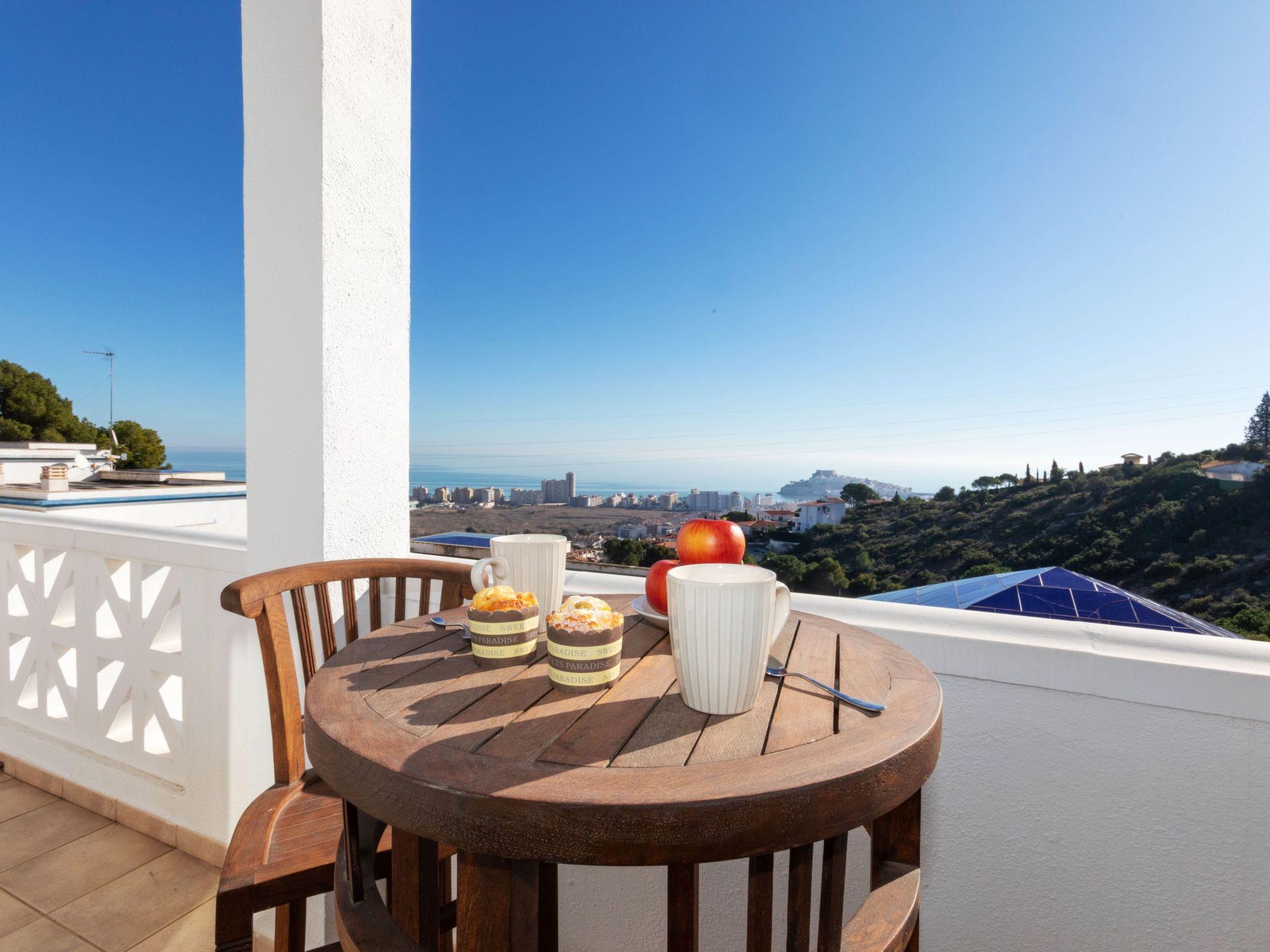 Atalayas Peñiscola 2 km from Peñiscola centro: Modern, comfortable semi-detached house "Los balcones", semi-detached, renovated in 2016. 9 houses in the resort. In the resort 2 km from the centre of Peñiscola, in a sunny position on top of a hill, 2 km from the sea, 2 km from the beach. In the house: air conditioning. Parking (for 2 cars), single garage. Supermarket 2 km, shopping centre 5 km, restaurant 1 km, café 2 km, bus stop "Plaza de la Constitución" 1.8 km, railway station "Benicarló-Peñíscola" 9.5 km, sandy beach "Peñiscola Norte" 2 km. Golf course (18 hole) 35 km. Nearby attractions: Peñiscola 2 km, Delta del Ebro 40 km, Port Aventura 100 km, Museo de las Ciencias - Valencia 120 km. Well-known lakes can easily be reached: Pantano La Senia 25 km. Hiking paths: Parque natural Sierra de Irta 5 km. Please note: car recommended. Object suitable for 6 adults + 1 child. The owner does not accept any youth groups. Neighbourhood highly sensitive to noise. Quietness and good behaviour expected.