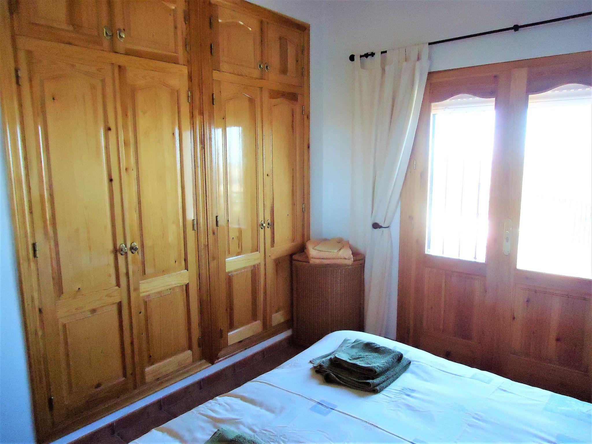 Through the tropical garden, past palm and mandarin trees, you reach the entrance area of the villa. The spacious, light-flooded living-dining room with fireplace welcomes you in a cosy atmosphere. From international television with DVD player, chess or other interesting games to the small house library, you will find everything you need for fun and entertainment. An information folder about the many excursion destinations in the area is also available. In addition to an open-plan, fully equipped American kitchen, you will find 3 comfortable bedrooms, one with an integrated shower room. All rooms can be pleasantly air-conditioned at any time of year as required - with modern, economical inverter air conditioning systems - cold or warm. In winter, they also serve as heating. The fireplace in the living room is a favourite for cooler days or long evenings, and its automatic firebox makes it child's play to use. All bedroom windows are fitted with mosquito blinds and fixed shutters. Double glazing and solid wood doors in every room perfectly complement the comfortable furnishings.