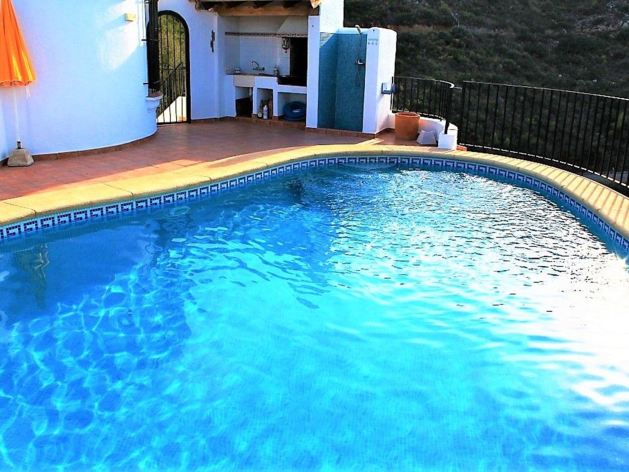 The large, sunny pool terrace with outdoor shower, barbecue and shady veranda can be accessed from the living room or master bedroom. It has recently been fitted with flexible sliding glass elements in all fronts, which can be opened as desired. This makes it possible to enjoy the fantastic panorama at any time and in any weather. The beautiful, heated pool with its Roman steps immediately invites you to take a refreshing dip. From the entire pool level, you can enjoy a magnificent and unforgettable panoramic view of the turquoise-coloured sea, the wonderful Mediterranean landscape and the majestic Segaria mountains. Another spacious terrace awaits visitors in the beautiful garden at the front of the house. Whether simply relaxing, daydreaming or observing the interesting tropical plants - here too, everything is entirely up to you.