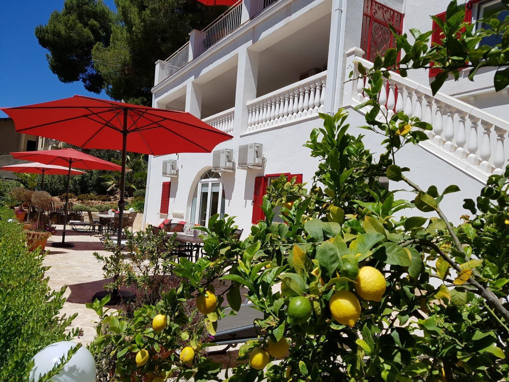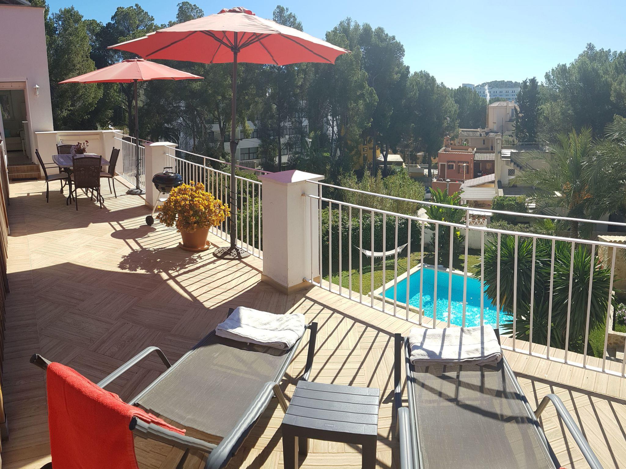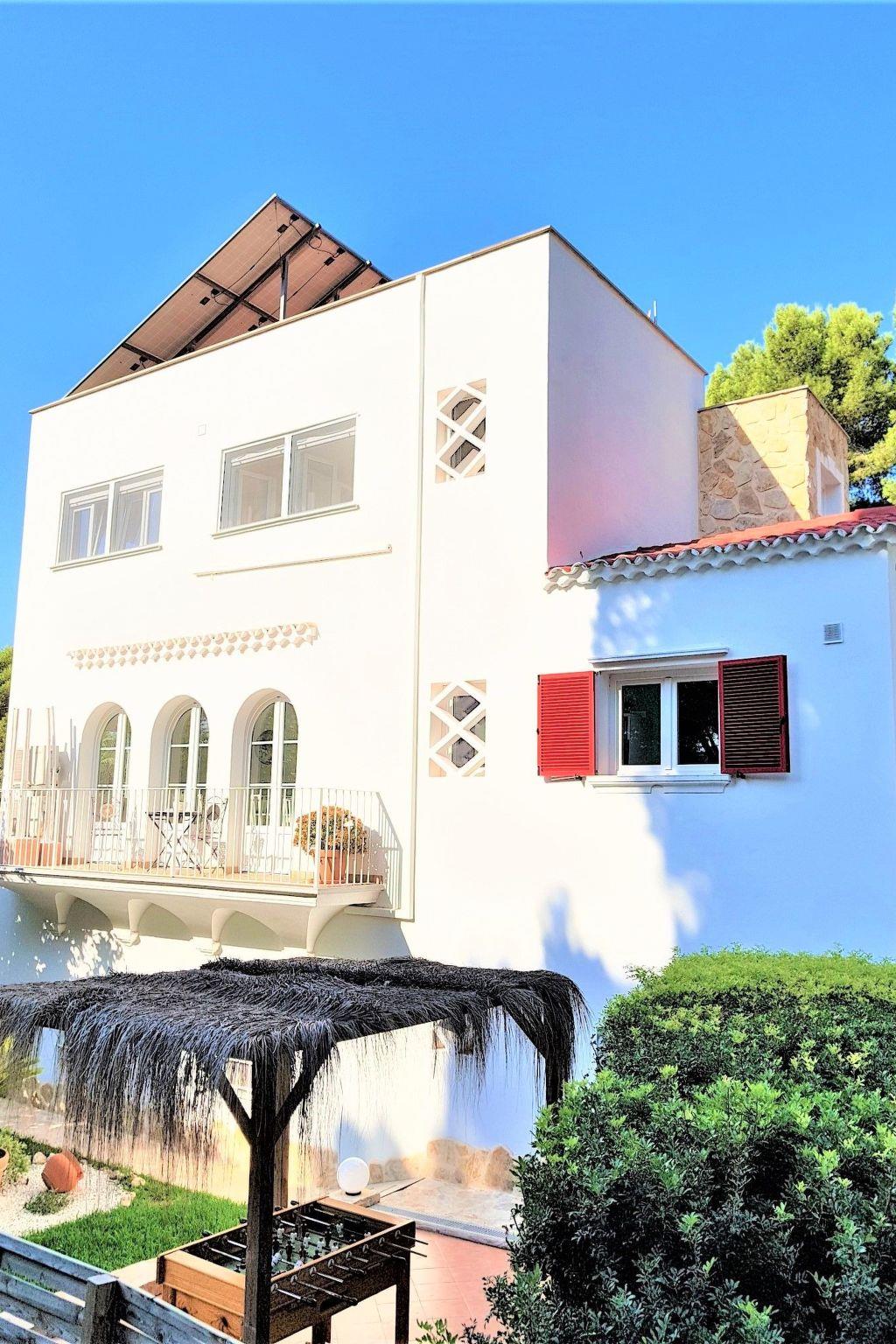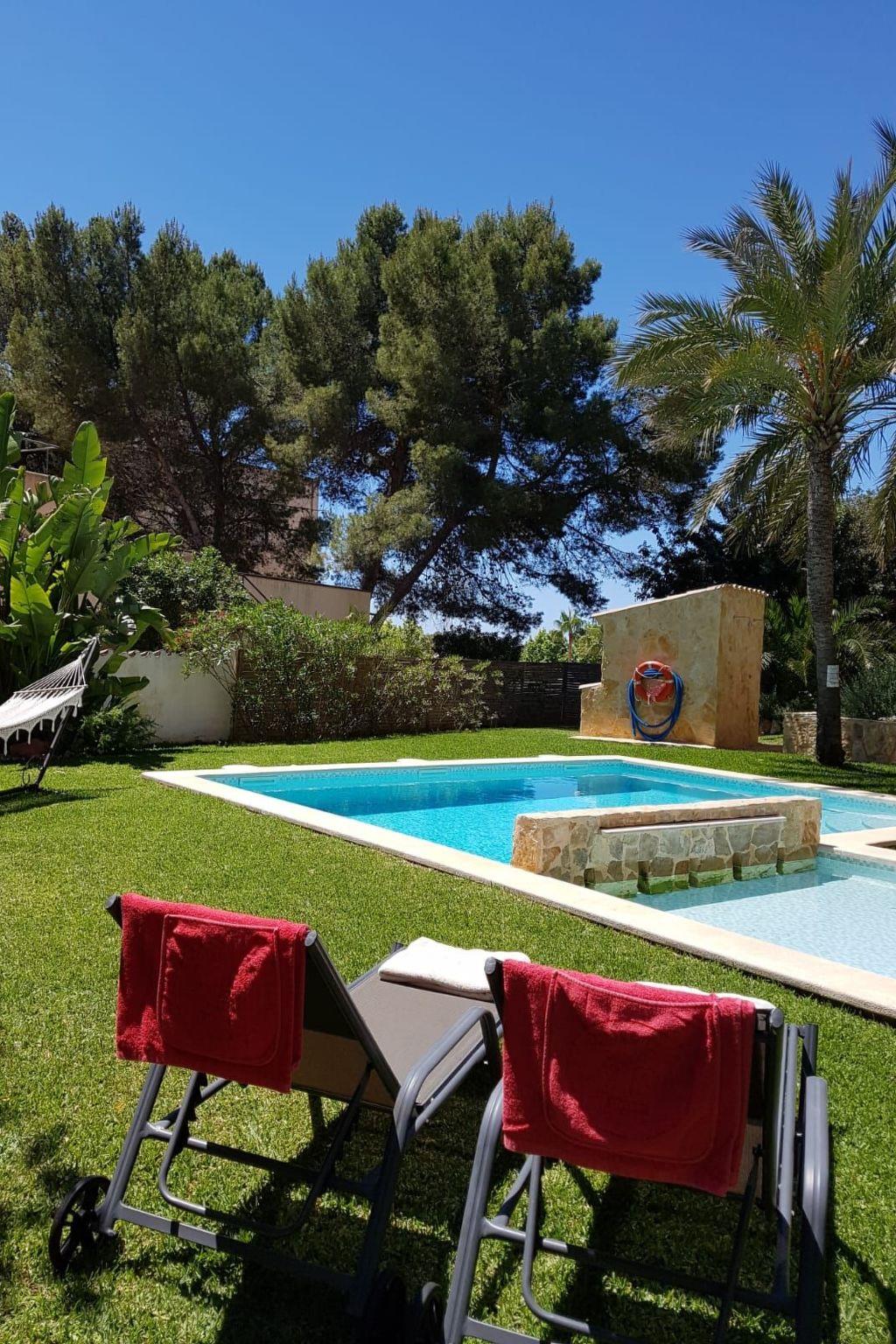 This renovated holiday villa is located in the popular seaside resort of Paguera, in the south-west of the island of Mallorca, just a 3-minute walk from the fine, gently sloping sandy beach. Despite its proximity to the shops, the generously designed house is very quiet in the countryside and offers space for up to 12 people.XXL, beachfront holiday villa with pool and garden, 4 terraces, comfortably furnished, suitable for up to 12 people,