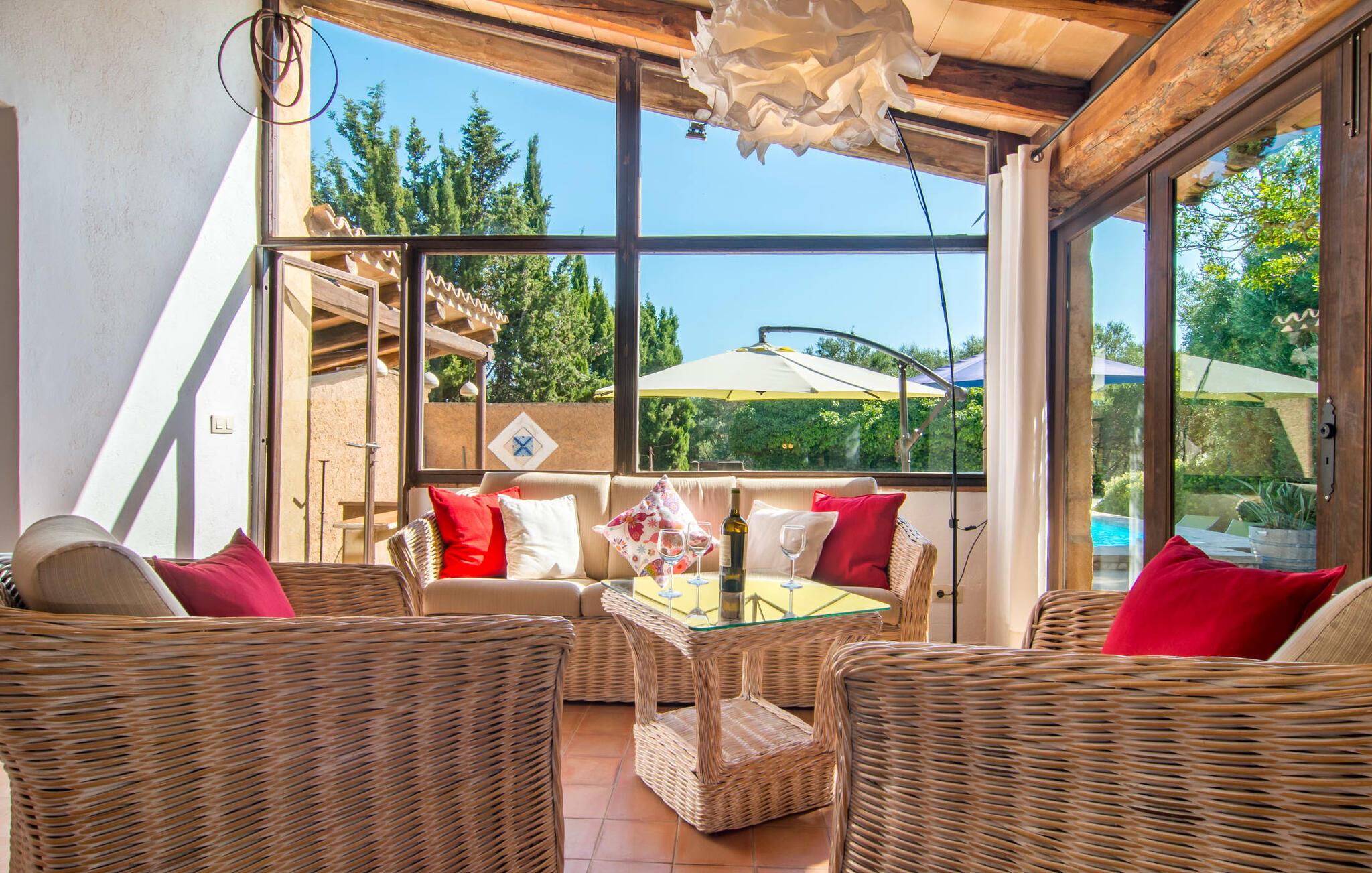 Store grupper som ønsker å tilbringe en fantastisk og uforglemmelig ferie sammen, har ofte vanskeligheter med å finne overnatting Feriehus med XXL-kapasitet er sjeldne på øya. I så måte overgår Villa Principal EMF274 alle andre, og kombinerer et fantastisk naturmiljø med en frodig grønn eiendom som har tre separate bygninger hvor du kan bo. Hagen som forbinder villaene har flere kunstige små oaser som du kan oppdage på en spasertur. Dere kan også møtes til et spontant slag tennis på den private tennisbanen, som er tilgjengelig mellom kl. 10.00 og 21.00 og som deles av alle gjestene. Når vinneren er avgjort, er de to bassengene i hagen en kjærkommen mulighet til å kjøle seg ned, kanskje etterfulgt av et langt solbad. Hvis dere har lyst til å samles igjen, kan dere gjerne møtes til en grillfest. Villakomplekset er ideelt for slike sammenkomster, og et av husene har til og med et utekjøkken med pizzaovn. Du kan derfor tilbringe det meste av ferien i den milde og friske øyluften. Noe av den kan du nyte på de koselige terrasseområdene, som er ideelle for sosialt samvær. Om du foretrekker å sette deg til rette på en solseng eller kose deg på et av rottingmøblene, er helt opp til deg - bare sørg for at du gjør noe godt for deg selv og dine nærmeste.