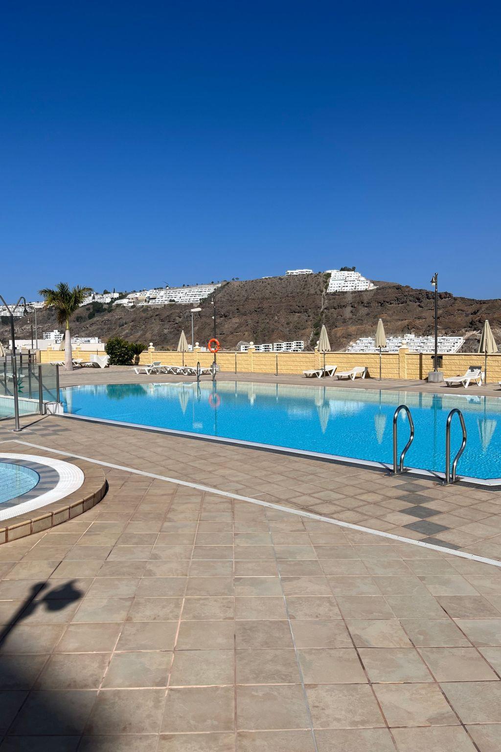 There is a terrace with dining table, 2 sun loungers and a parasol. There is also an extra parasol to take to the beach. The terrace is enclosed and has lots of privacy. There is a large communal pool with jacuzzi located right by the accommodation with outdoor shower. There is a parking space downstairs in the garage in the complex.