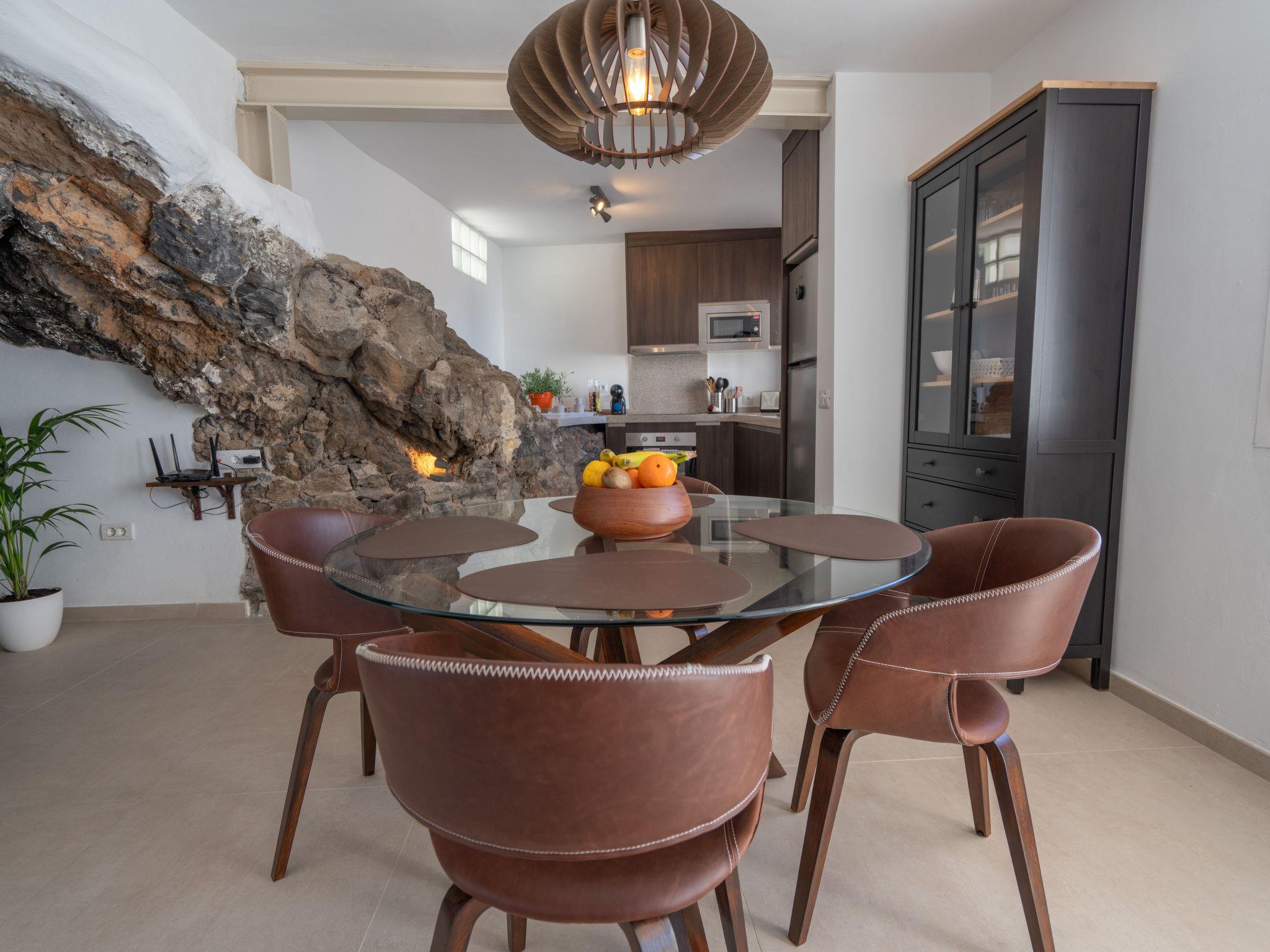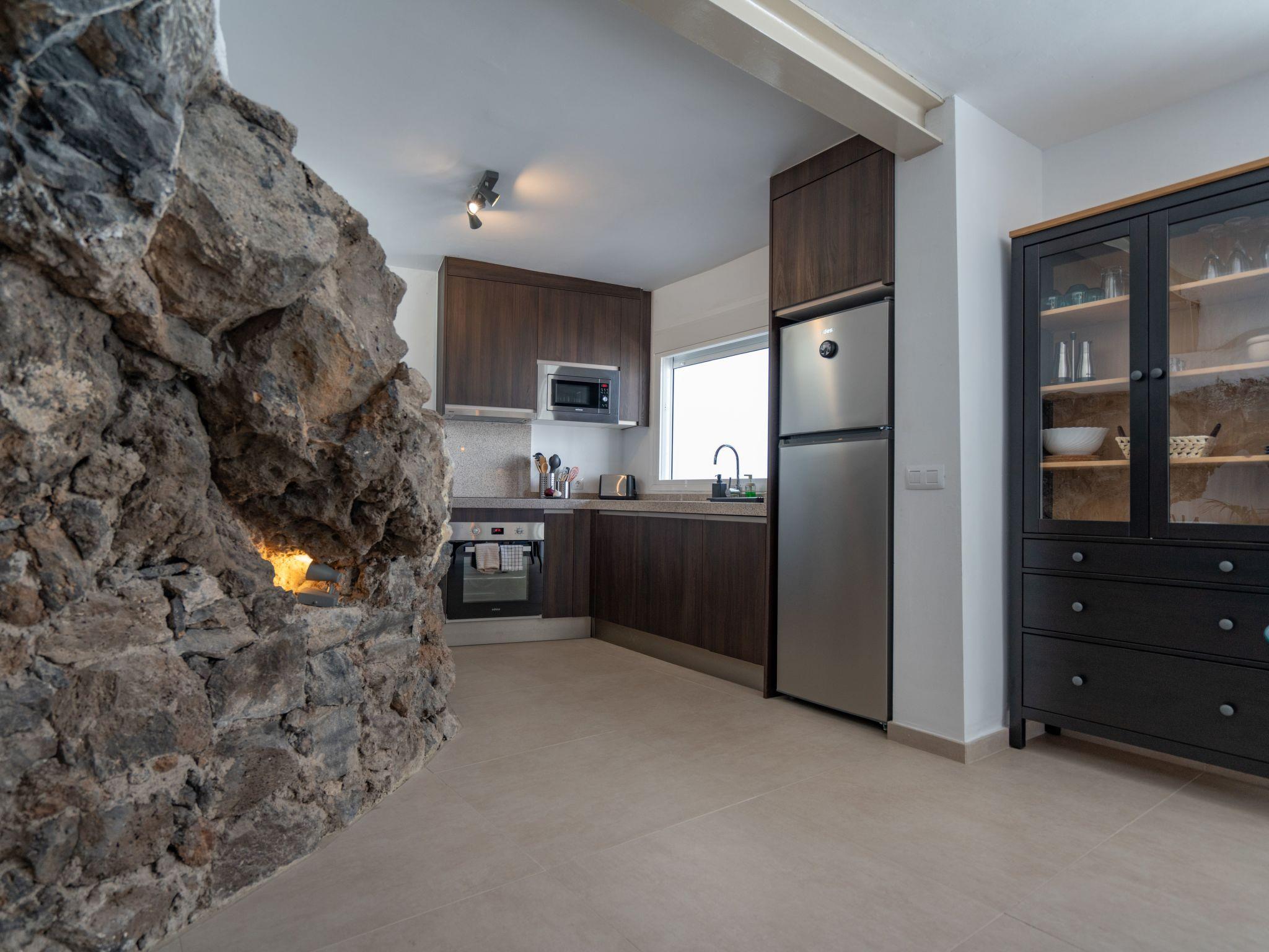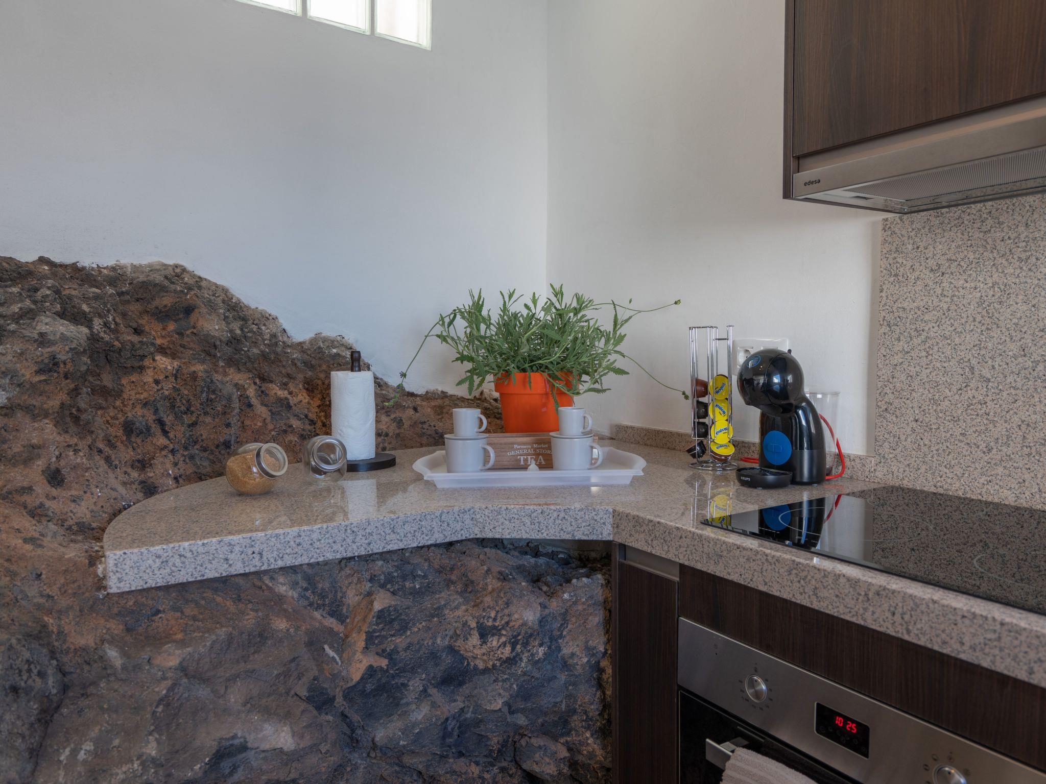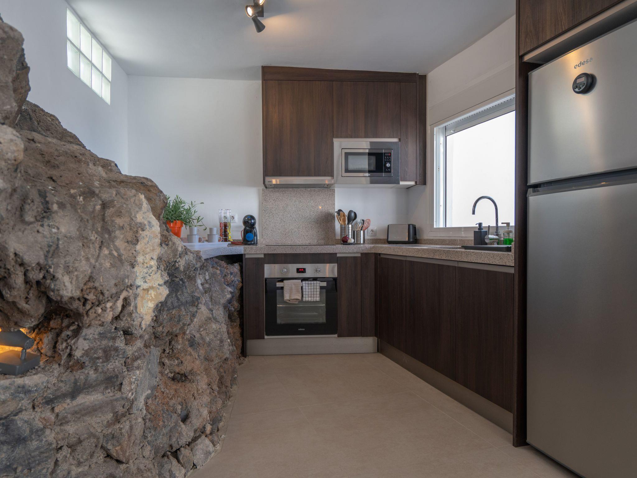 In the small village of Bocacangrejo you will find your tastefully designed cave house. You enter the large terrace (25m2) on the ground floor where you can find a terrace table and comfortable garden chairs for your meals or just to enjoy the sun or the scenery. You enter your house in the living/kitchen area (open plan). Immediately you realise that you have not booked a normal house: you are in a cave! Volcanic rocks shape the kitchen which partly uses real rocks as a worktop. The kitchen has everything you need: