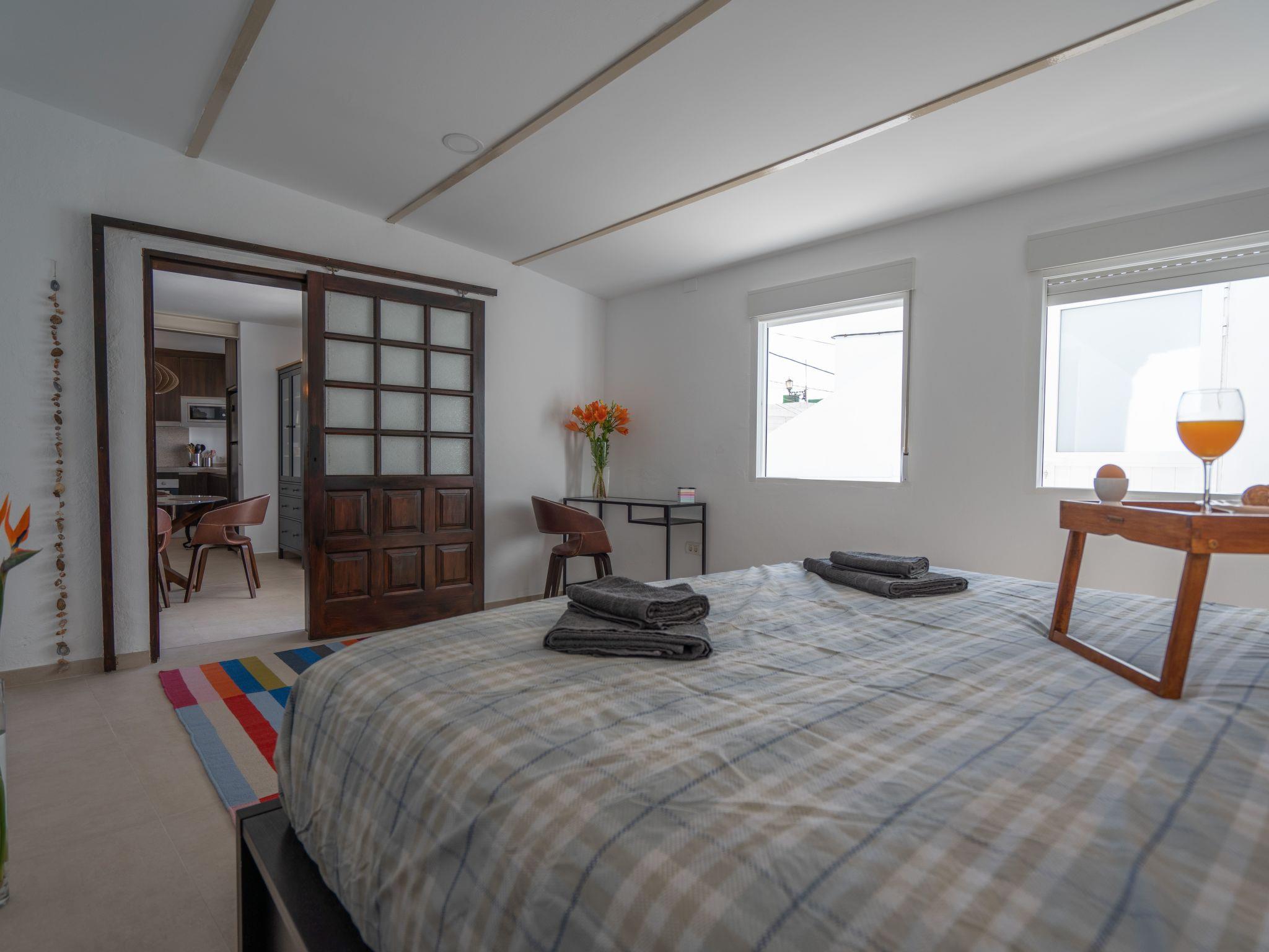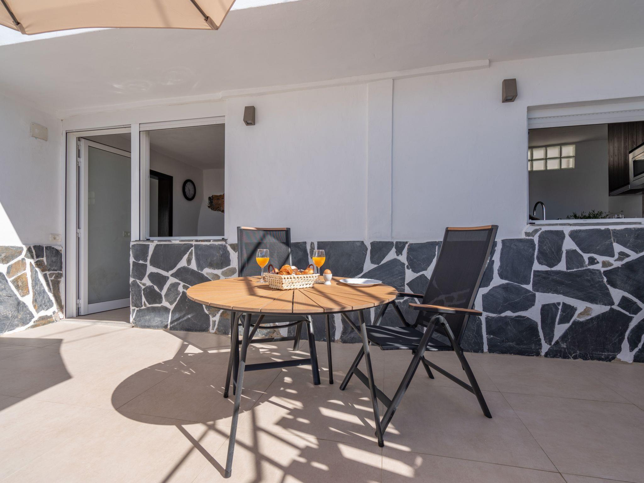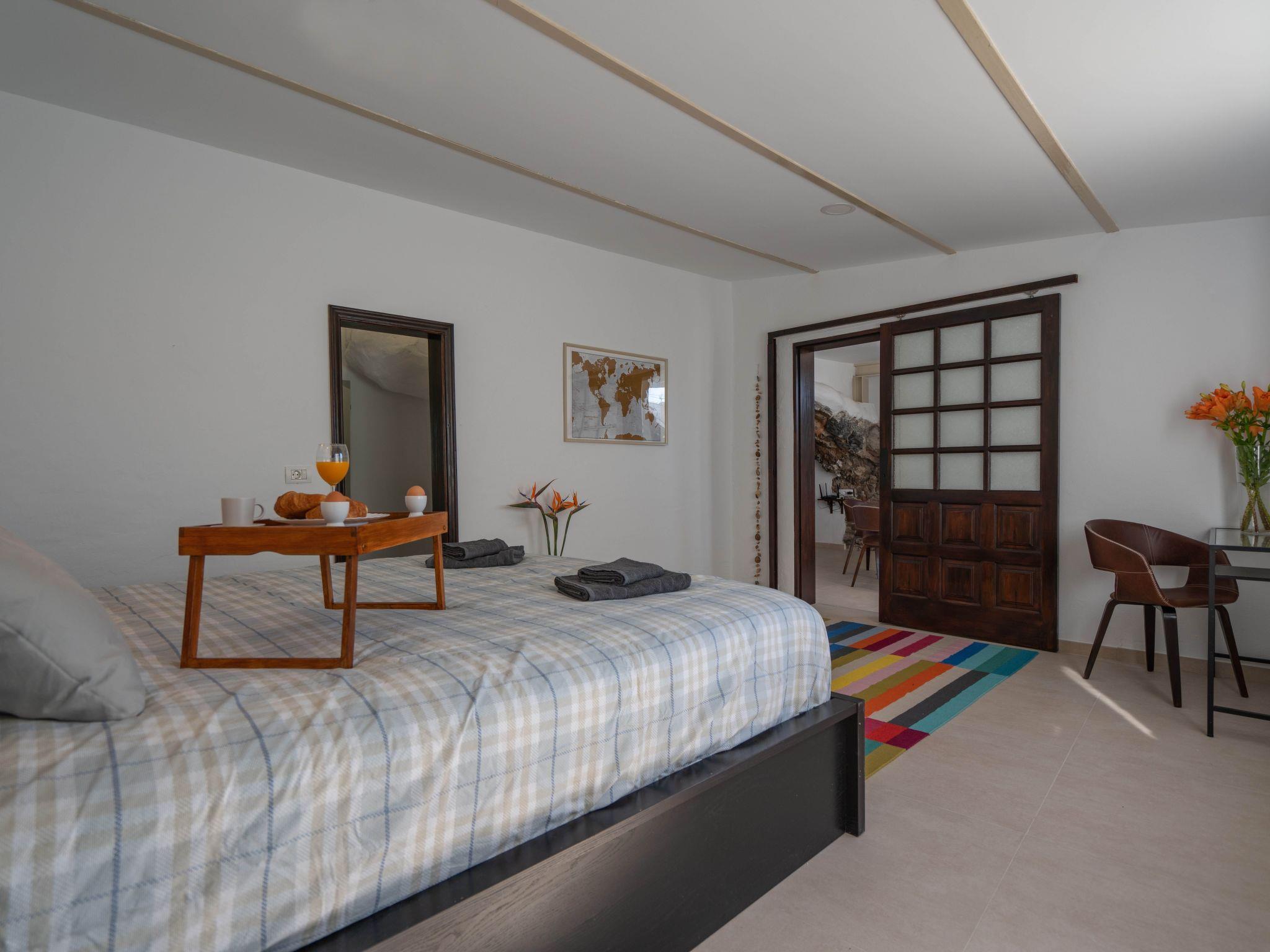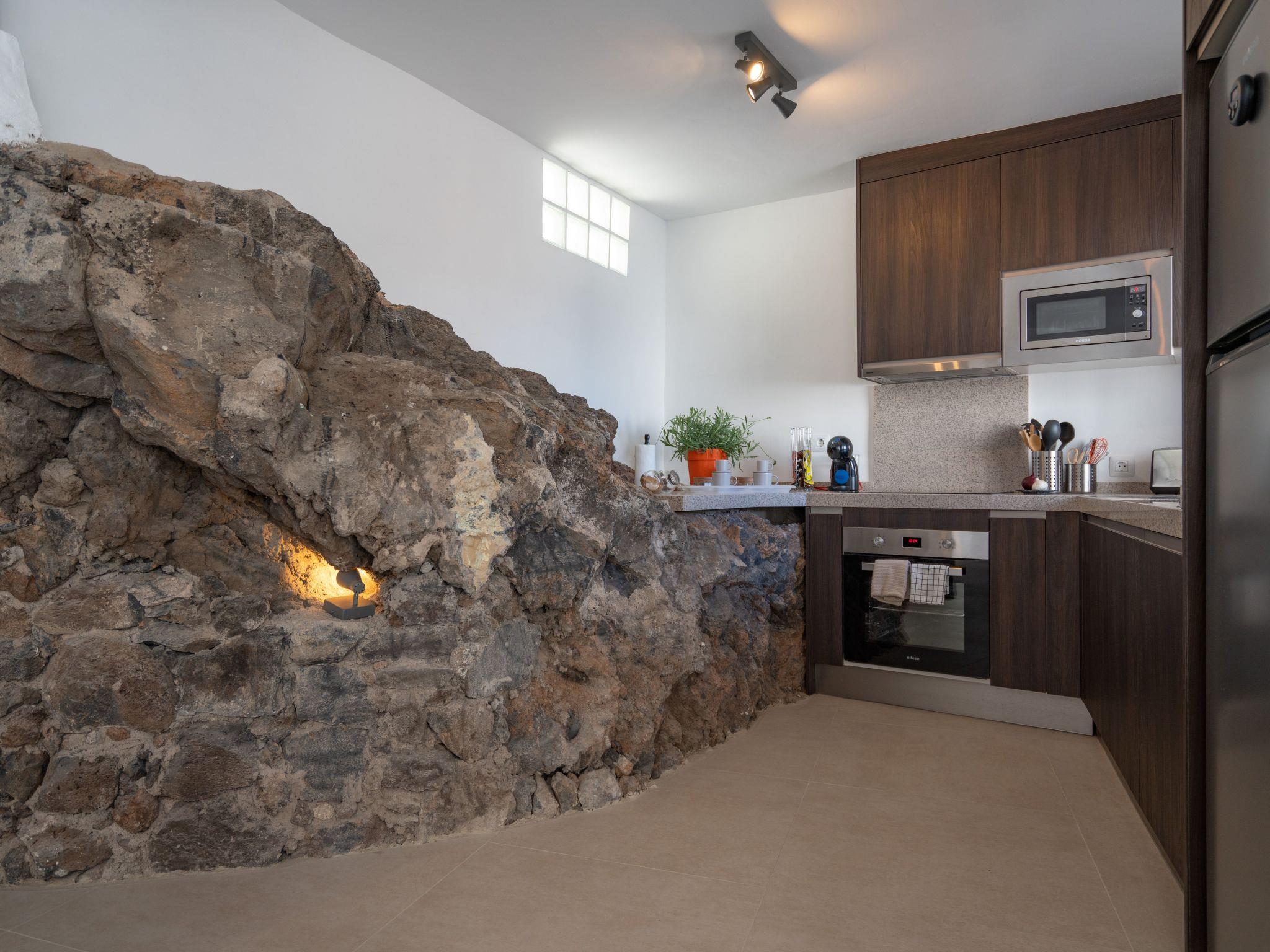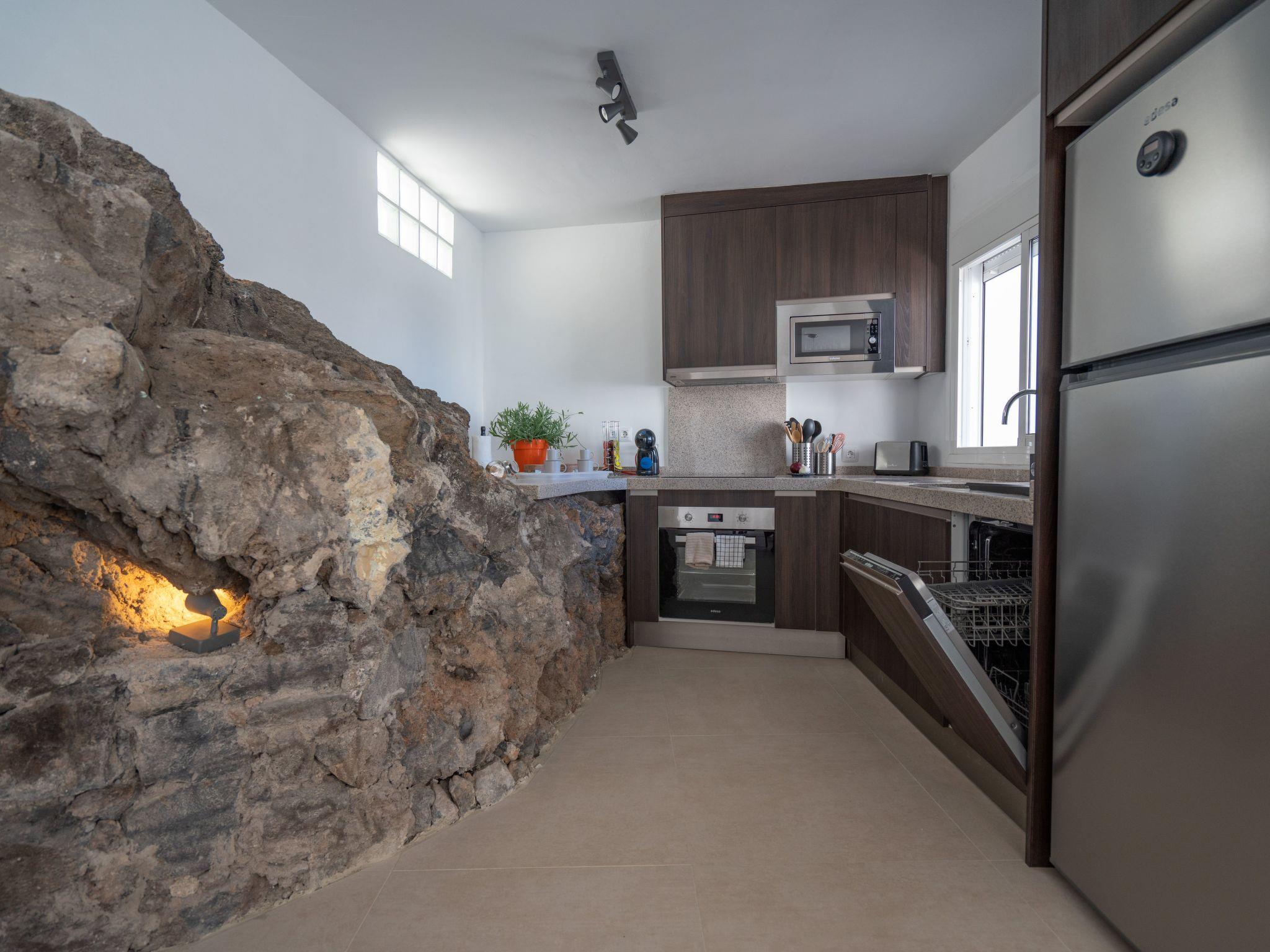 In the small village of Bocacangrejo you will find your tastefully designed cave house. You enter the large terrace (25m2) on the ground floor where you can find a terrace table and comfortable garden chairs for your meals or just to enjoy the sun or the scenery. You enter your house in the living/kitchen area (open plan). Immediately you realise that you have not booked a normal house: you are in a cave! Volcanic rocks shape the kitchen which partly uses real rocks as a worktop. The kitchen has everything you need: