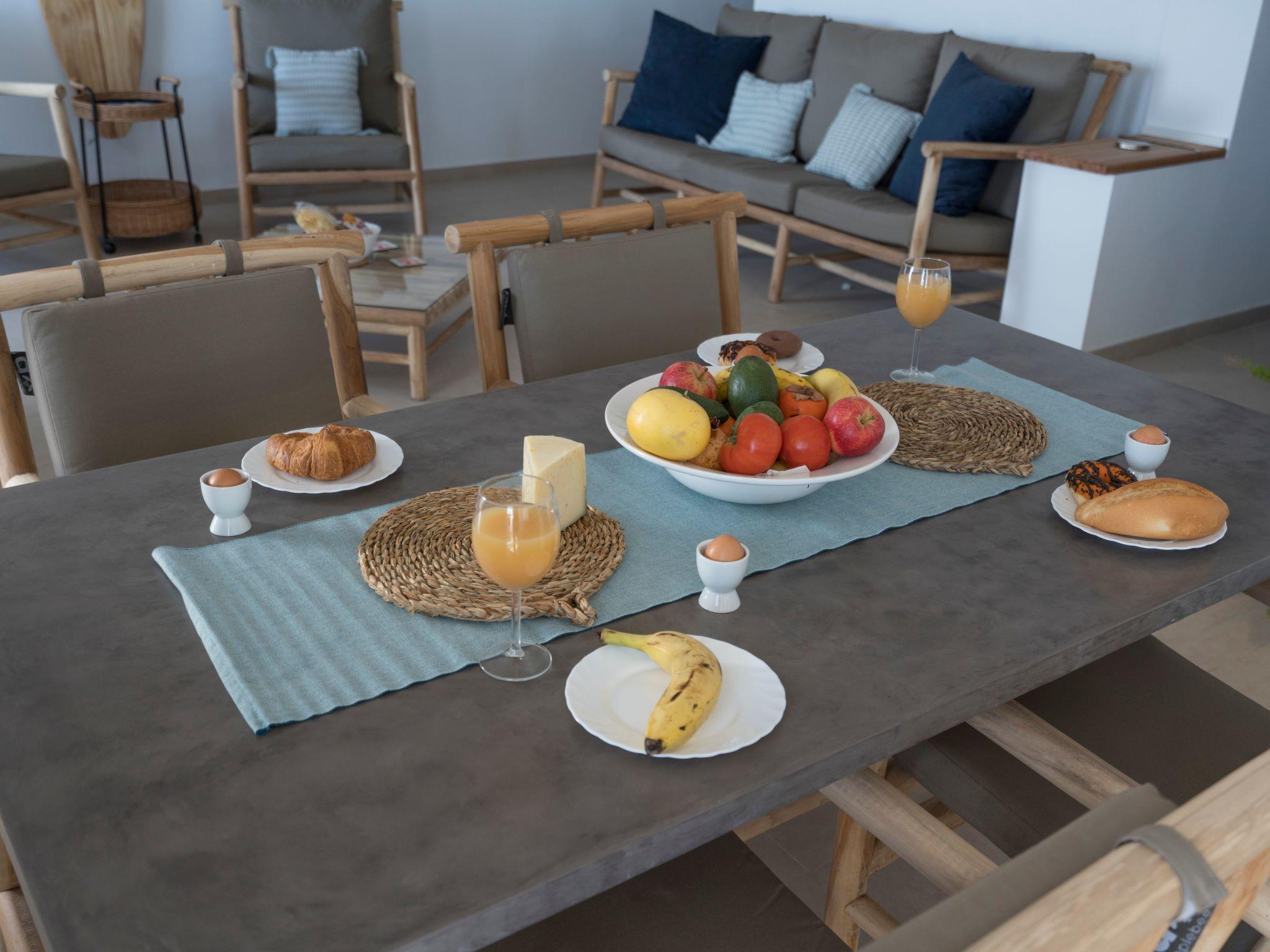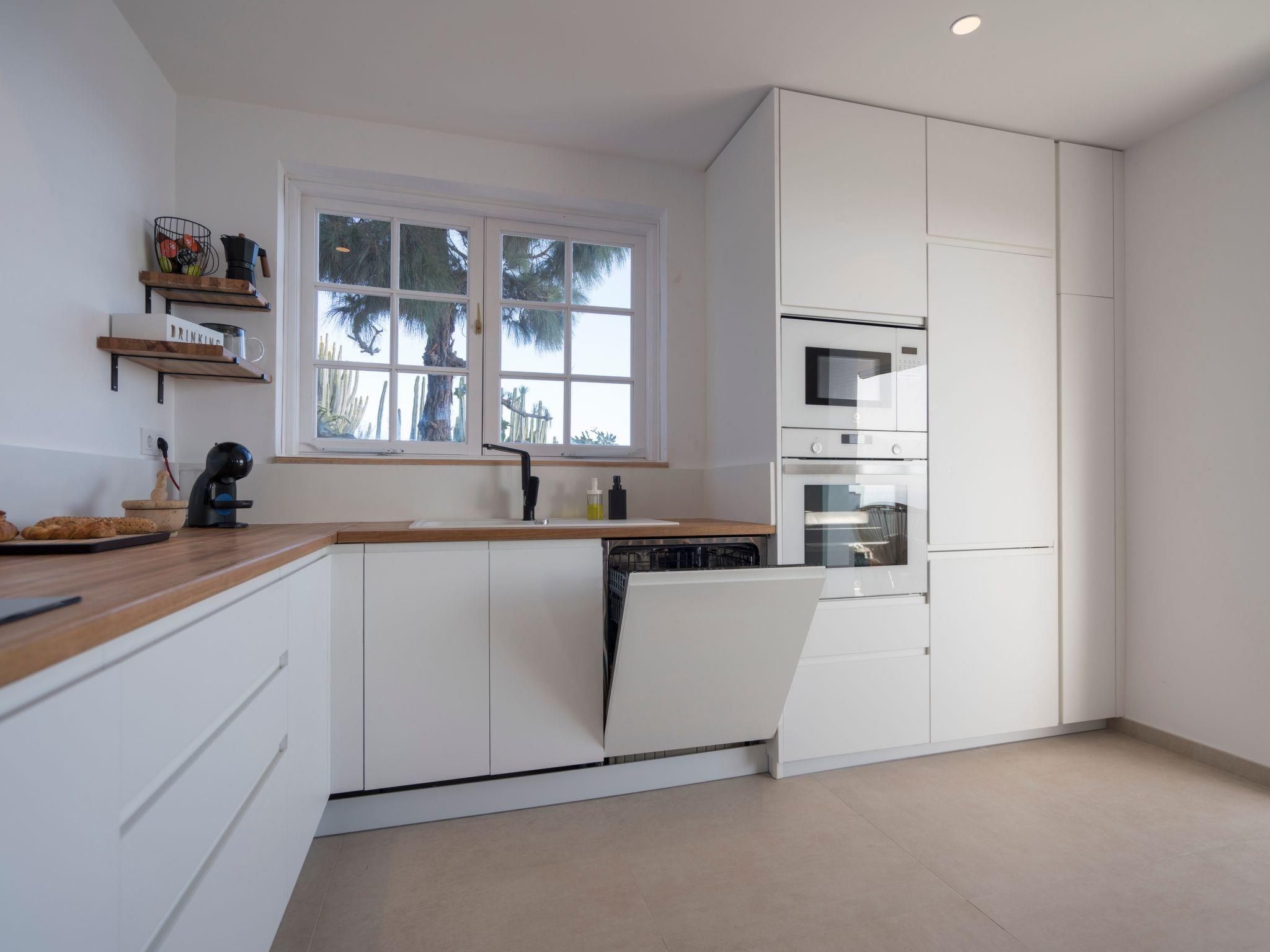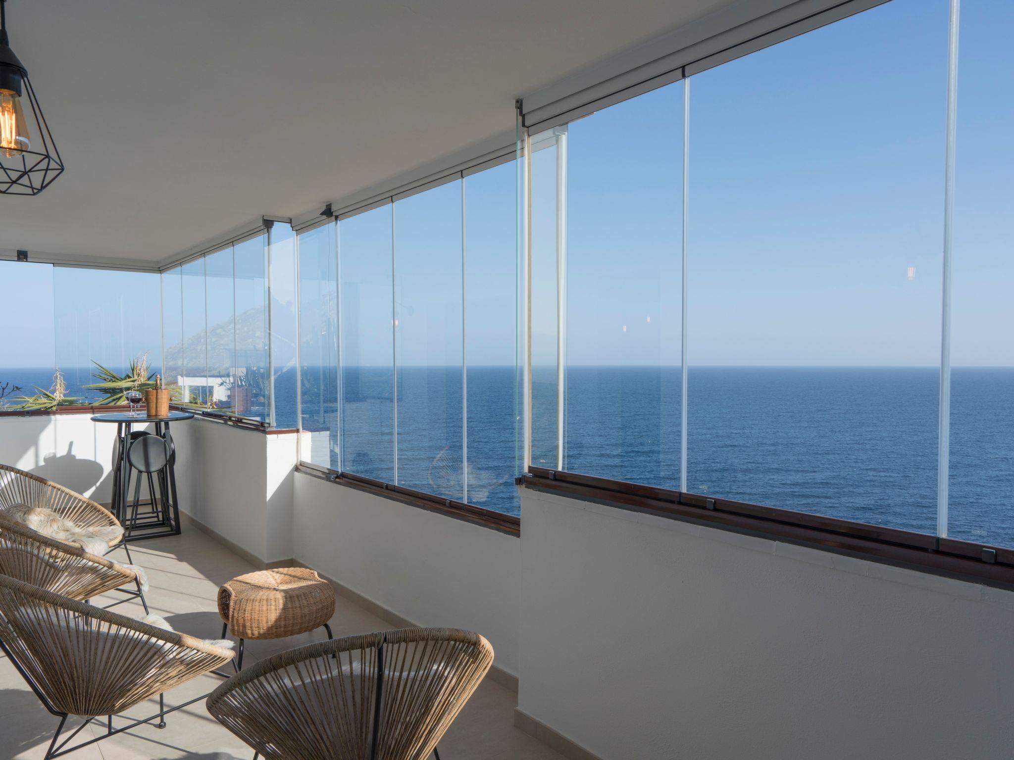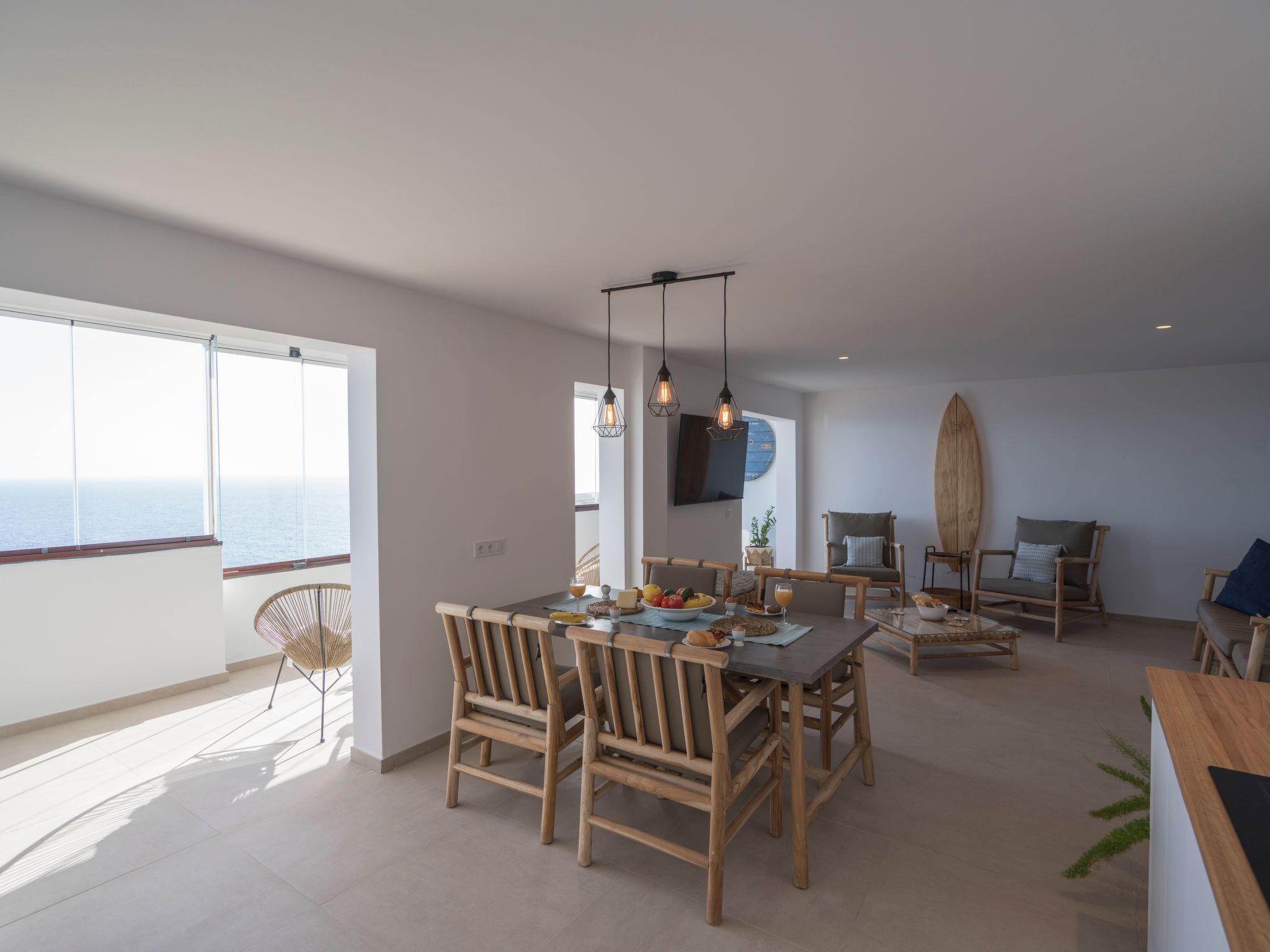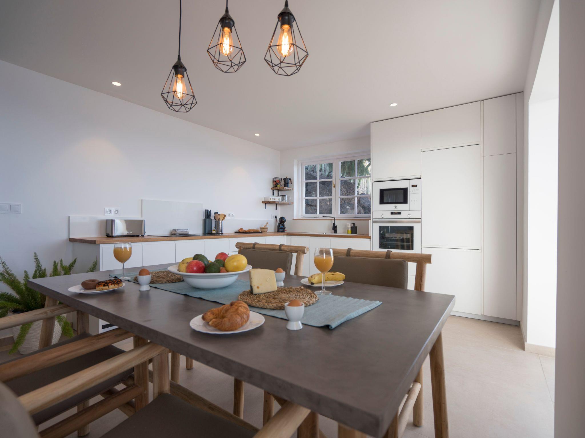 Then you get to the spectacular living area where your eyes immediately get locked on the amazing ocean views. The decoration has natural tones, and the wooden elements give a comfortable feel to the room. The large open plan living room is really bright and has so much natural light entering the room. You have comfortable furniture to relax and watch the large 60-inch TV. With a Chromecast so you can stream all your favourite content from you mobile device (Netflix, Disney+, Spotify etc.) There is a large dining table separating the living and the kitchen area. In the big kitchen you find everything you need for cooking with all the great products you can buy on the island. Pans, pots, cutlery it is all there. Just like a Dolce Gusto coffee machine (and a filter and moka), dishwasher, double sized induction hub, oven microwave and a fridge freezer. Connected to the living room is the incredible balcony which is the crown jewel of the house. Ample 200º views over the village of Bocacangrejo, the ocean and playa la Nea can be enjoyed either from the bar table or the lounge seats. As well you can see the volcanos of Guïmar and the town of Candelaria in the distance. The unique thing of the balcony is that it has glass curtains. They can be held closed to protect you from the ocean breeze or be completely opened to fully enjoy the sunshine. This unique feature makes it possible to enjoy outside living every moment of the day or year.
