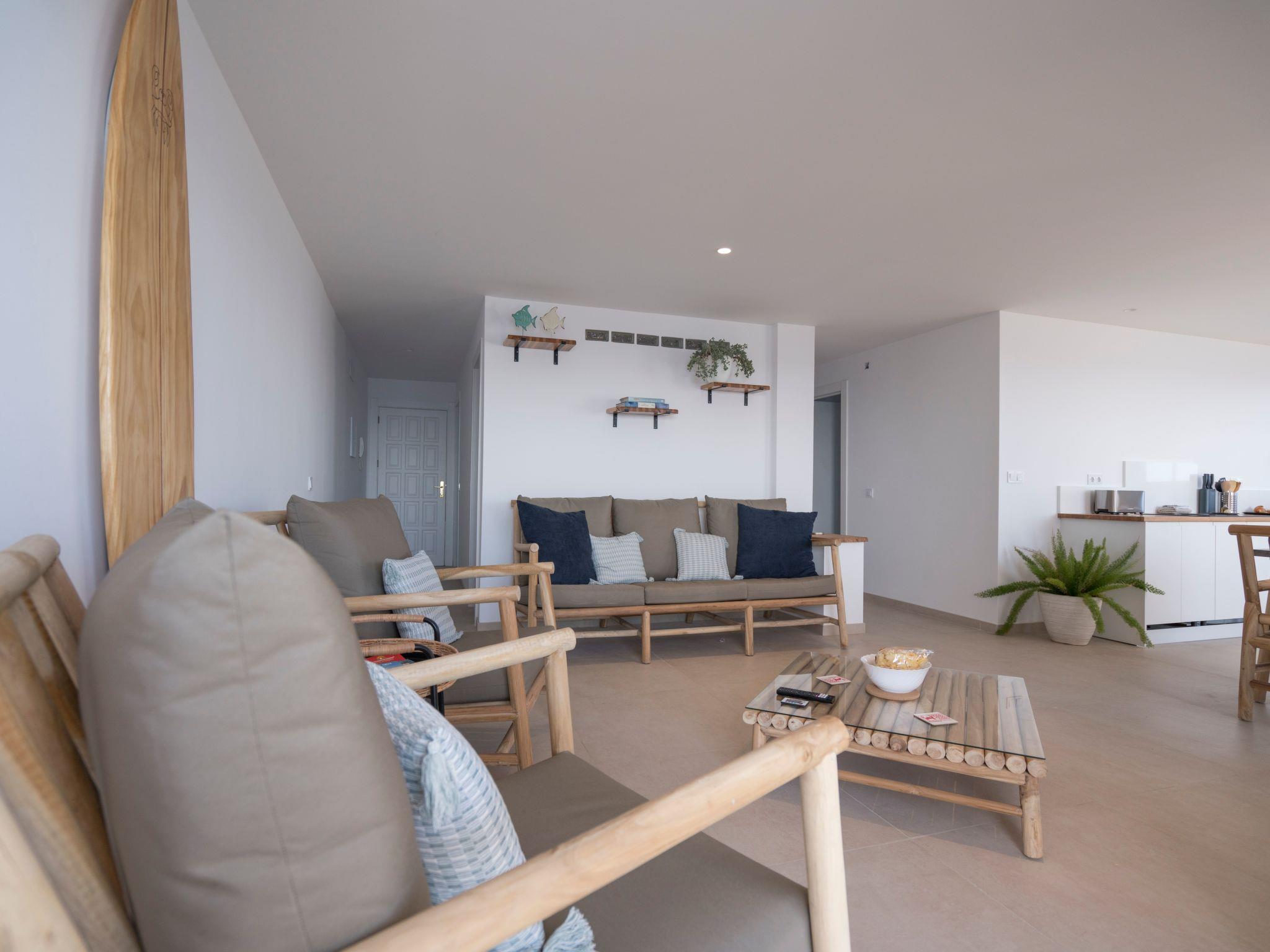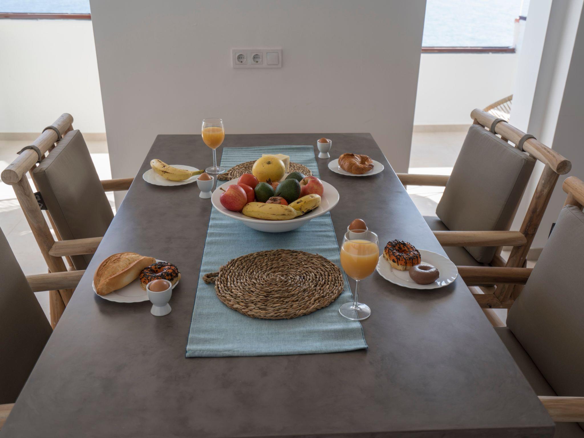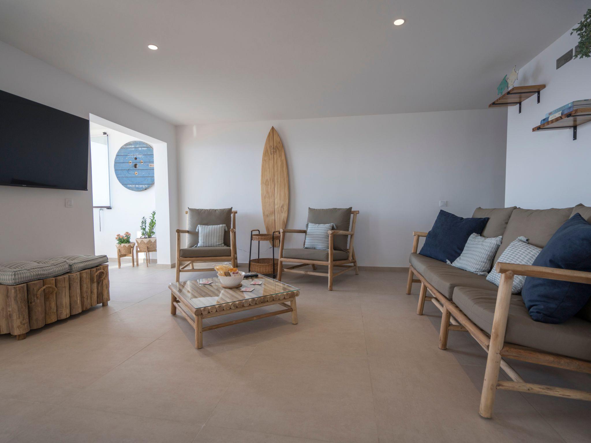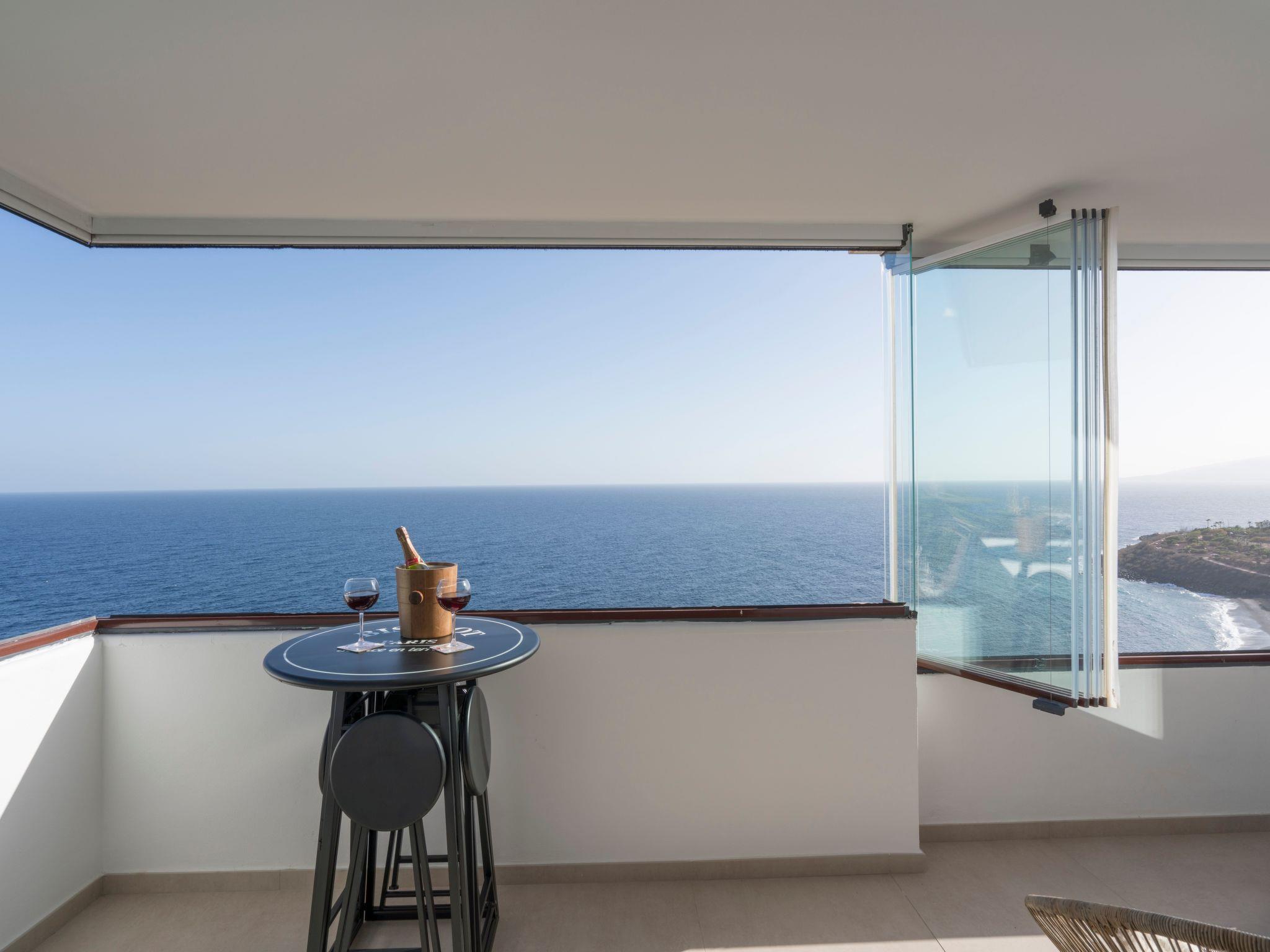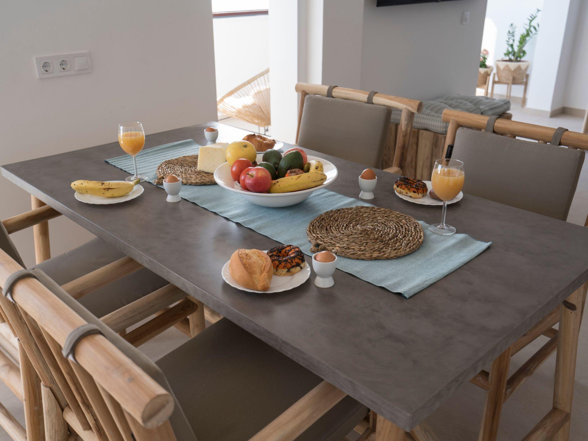 Then you get to the spectacular living area where your eyes immediately get locked on the amazing ocean views. The decoration has natural tones, and the wooden elements give a comfortable feel to the room. The large open plan living room is really bright and has so much natural light entering the room. You have comfortable furniture to relax and watch the large 60-inch TV. With a Chromecast so you can stream all your favourite content from you mobile device (Netflix, Disney+, Spotify etc.) There is a large dining table separating the living and the kitchen area. In the big kitchen you find everything you need for cooking with all the great products you can buy on the island. Pans, pots, cutlery it is all there. Just like a Dolce Gusto coffee machine (and a filter and moka), dishwasher, double sized induction hub, oven microwave and a fridge freezer. Connected to the living room is the incredible balcony which is the crown jewel of the house. Ample 200º views over the village of Bocacangrejo, the ocean and playa la Nea can be enjoyed either from the bar table or the lounge seats. As well you can see the volcanos of Guïmar and the town of Candelaria in the distance. The unique thing of the balcony is that it has glass curtains. They can be held closed to protect you from the ocean breeze or be completely opened to fully enjoy the sunshine. This unique feature makes it possible to enjoy outside living every moment of the day or year.