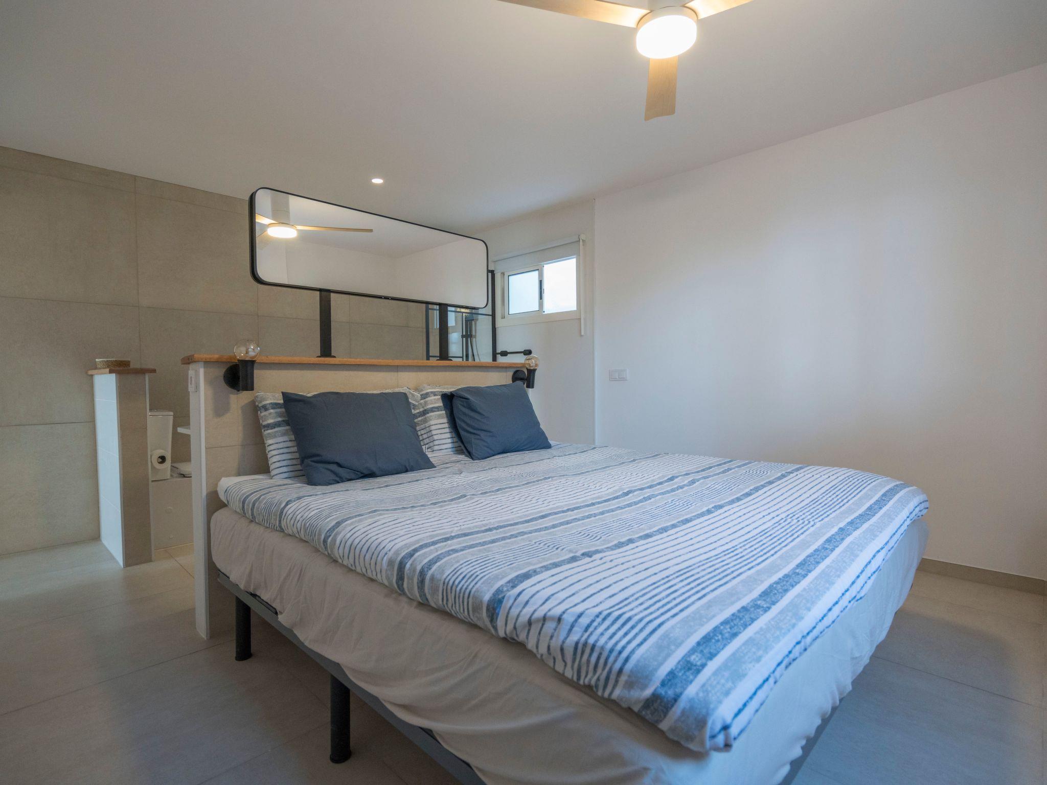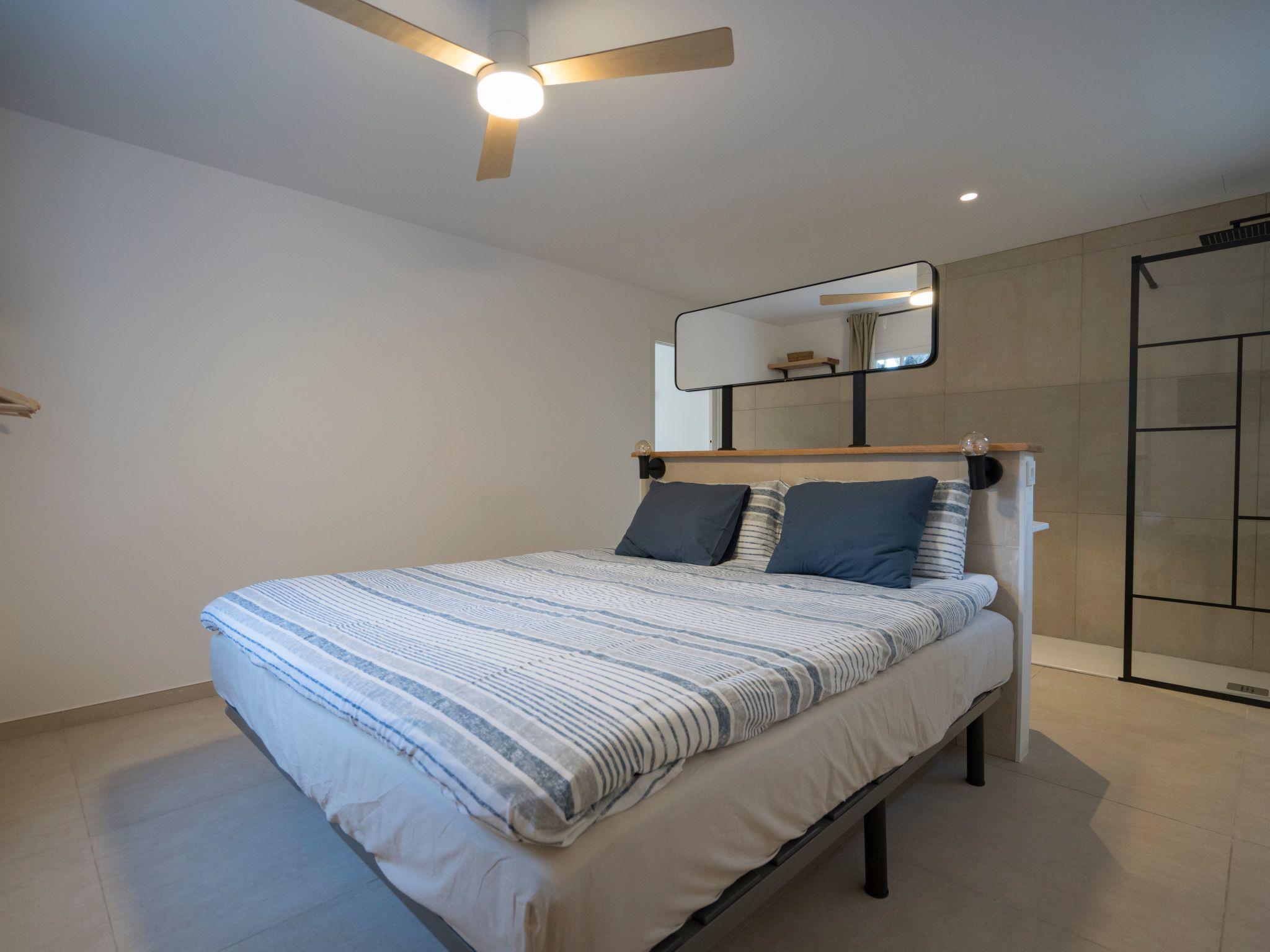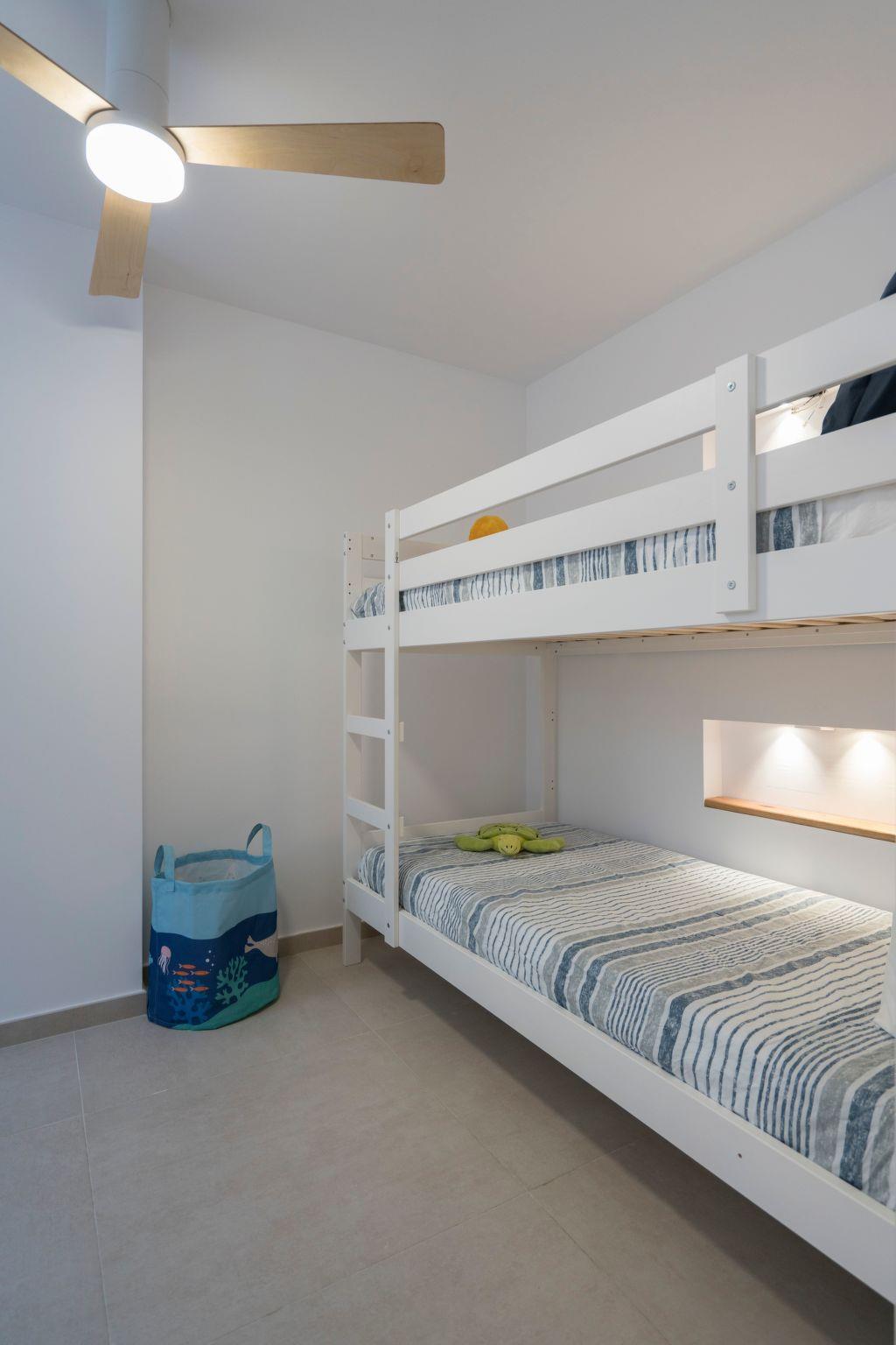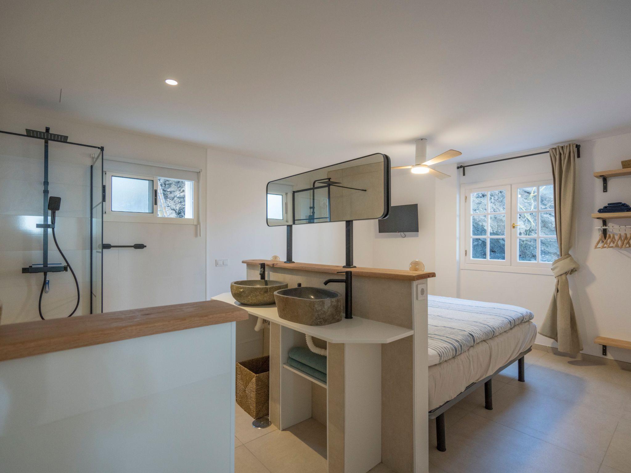 The small residential complex is located right between the small fisherman’s town of Bocacangrejo and the beautiful playa la nea with its black sand, it has its private parking. Already on the parking you get amazed by the great sea views that you have. From the parking you can either take the stairs or the lift to go up one floor. There you find your large 3-bedroom apartment. First there is a private patio on the back of the apartment and then you can enter. The first room is a room with a bunkbed (200cm*90cm) and a desk for remote working. There is a roof ventilator as well. Next to this room there is the first bathroom decorated with a natural stone sink and a rain shower.