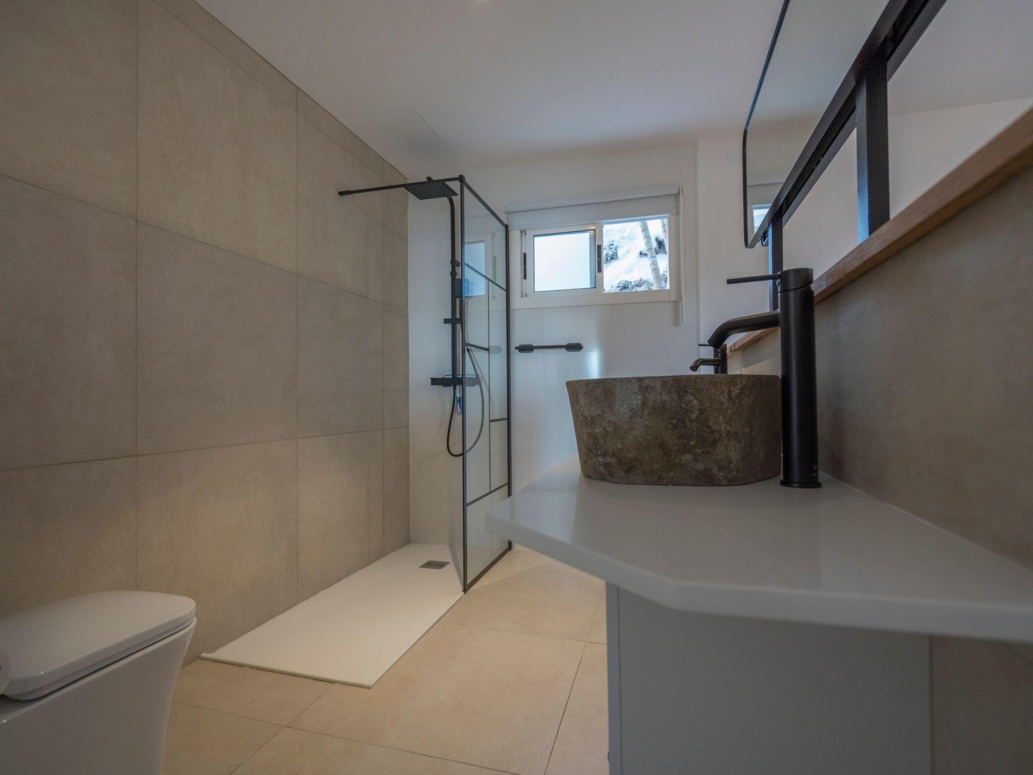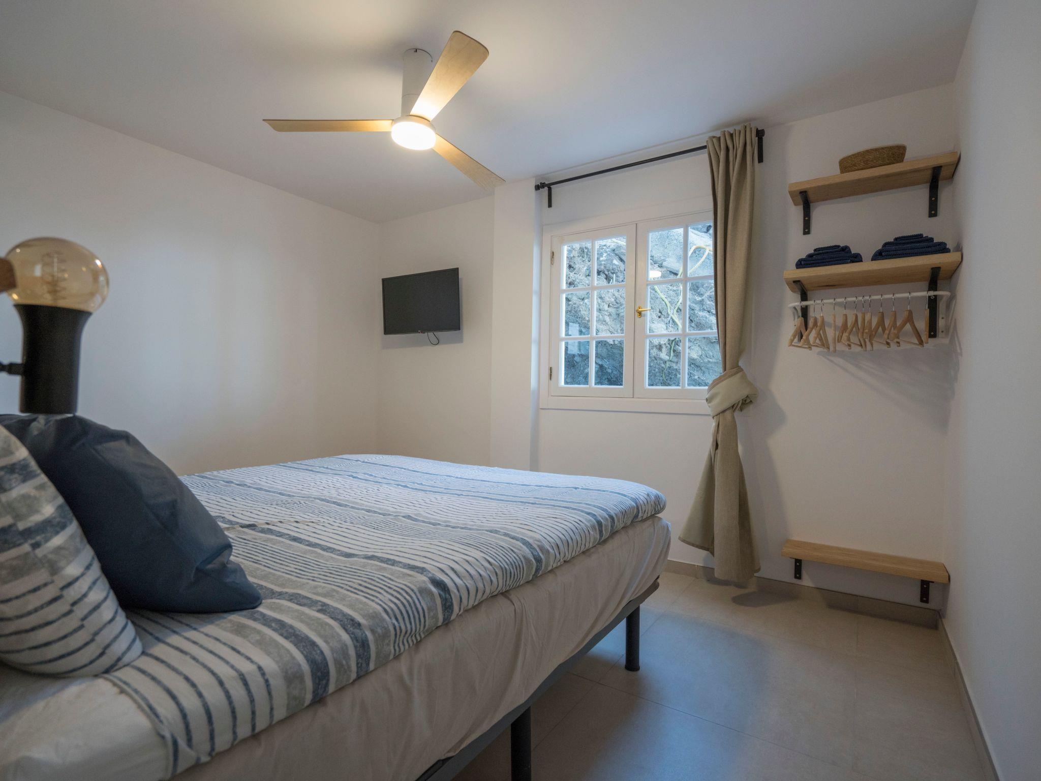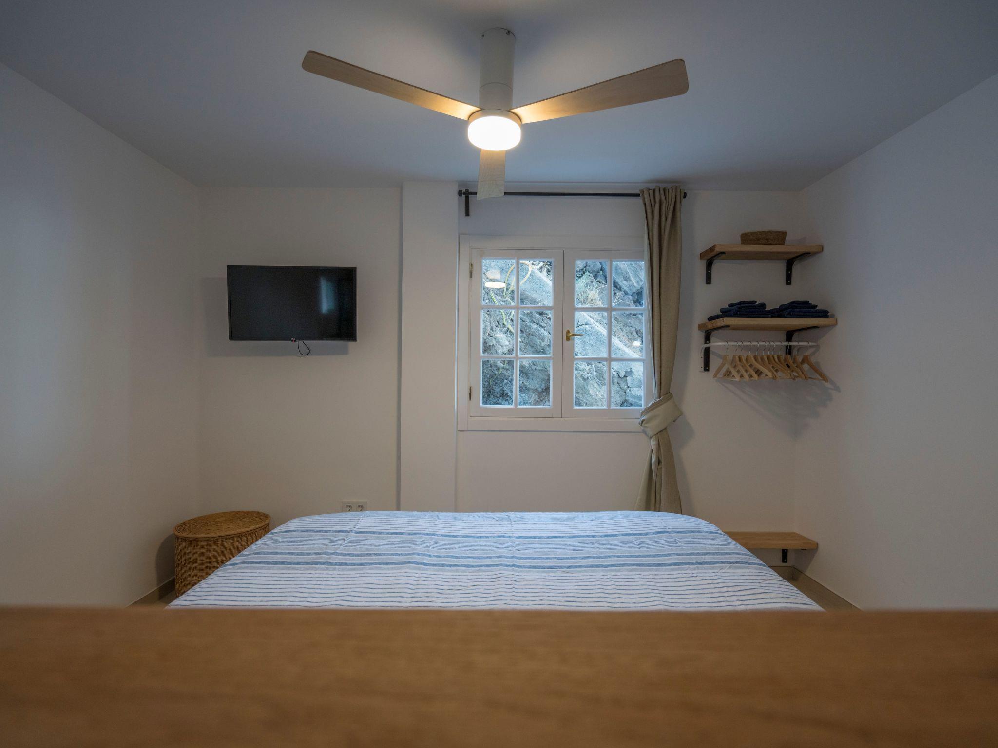 The small residential complex is located right between the small fisherman’s town of Bocacangrejo and the beautiful playa la nea with its black sand, it has its private parking. Already on the parking you get amazed by the great sea views that you have. From the parking you can either take the stairs or the lift to go up one floor. There you find your large 3-bedroom apartment. First there is a private patio on the back of the apartment and then you can enter. The first room is a room with a bunkbed (200cm*90cm) and a desk for remote working. There is a roof ventilator as well. Next to this room there is the first bathroom decorated with a natural stone sink and a rain shower.